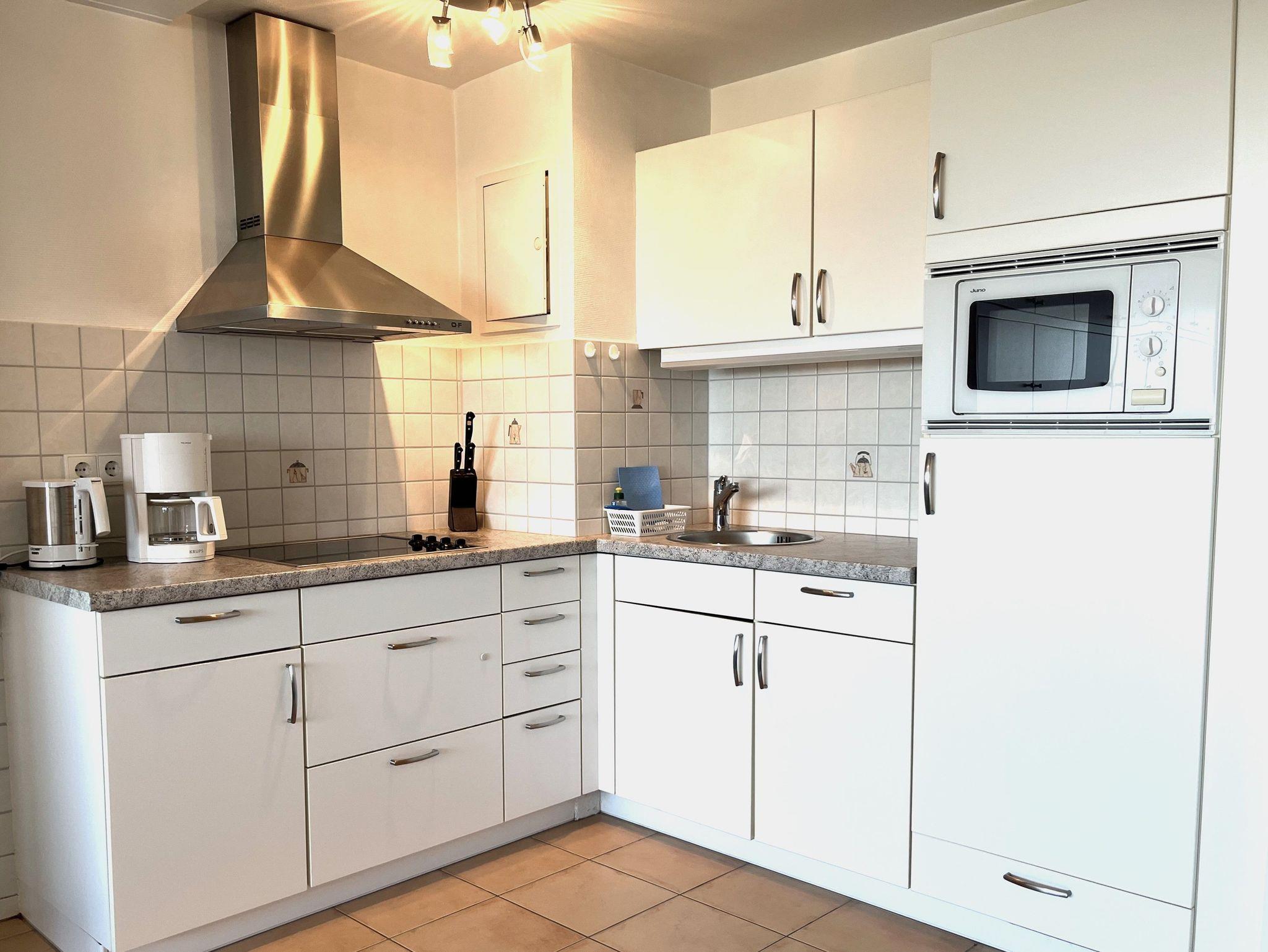 Die Küchenzeile mit Ceranfeld, Mikrowelle, Kaffeemaschine, Wasserkocher, Kühlschrank mit