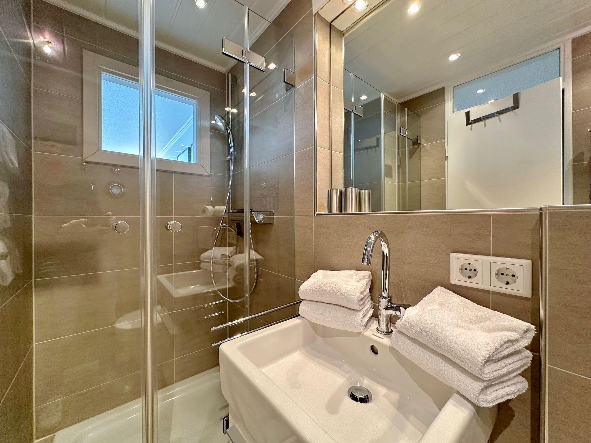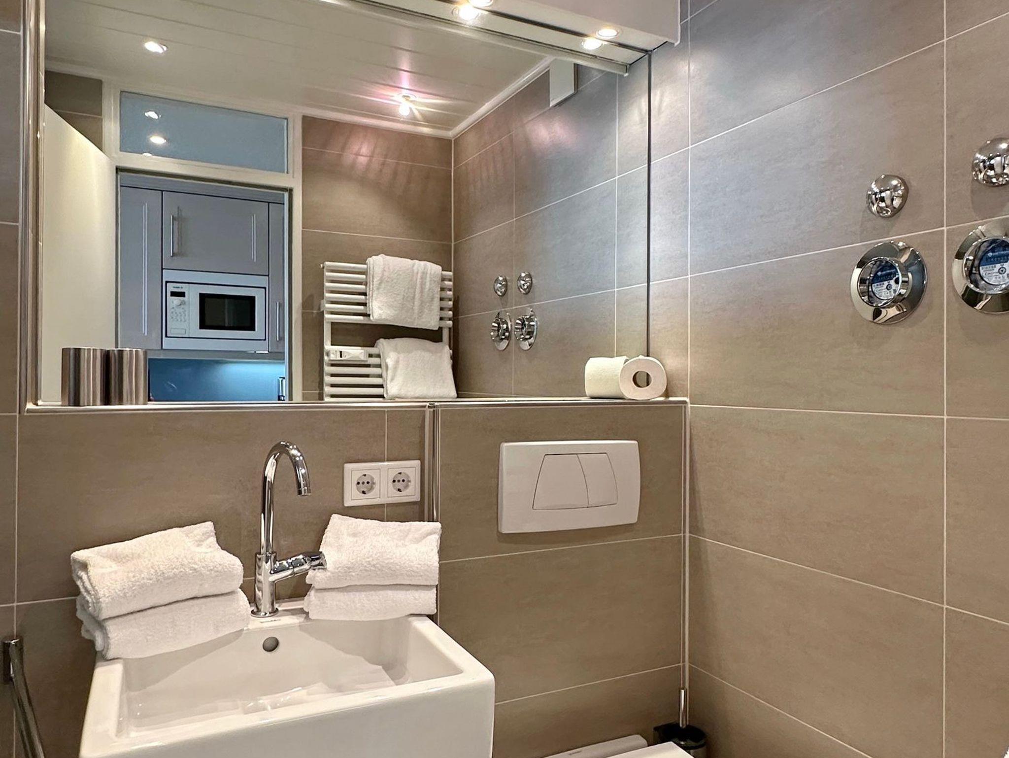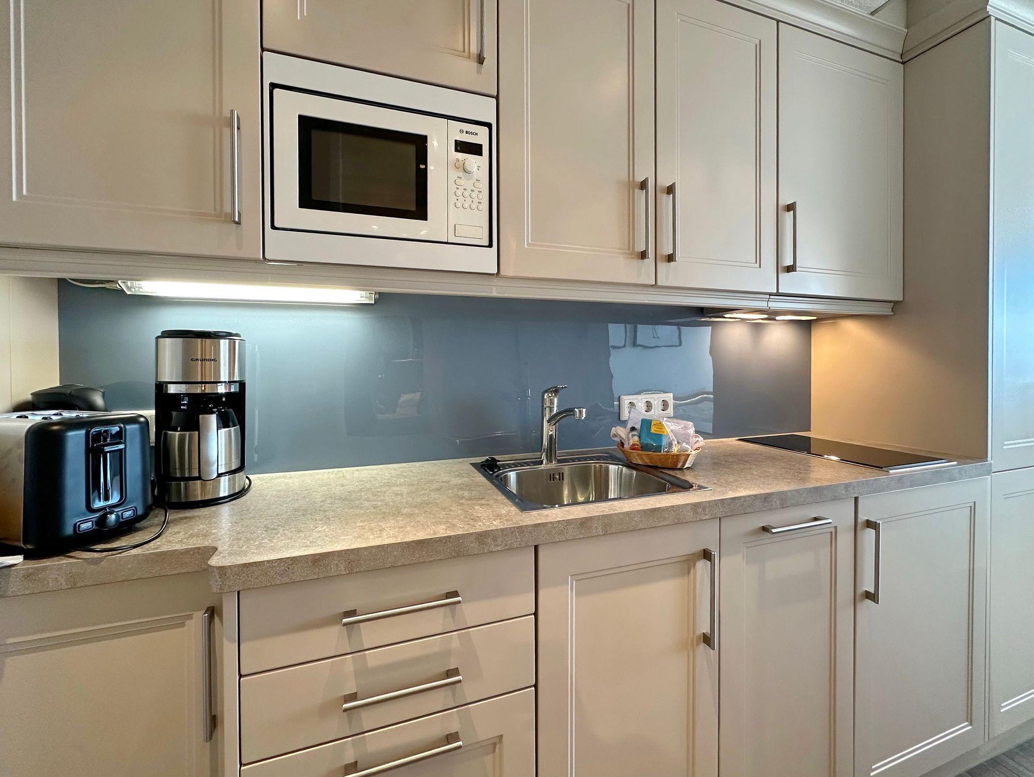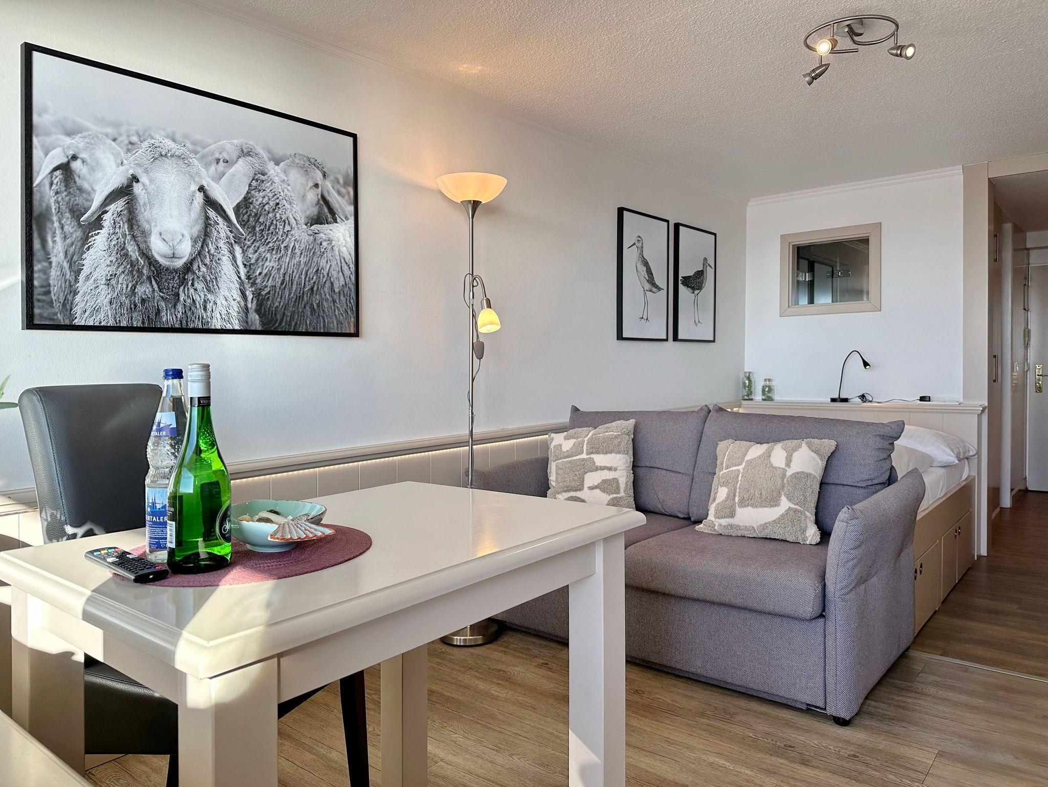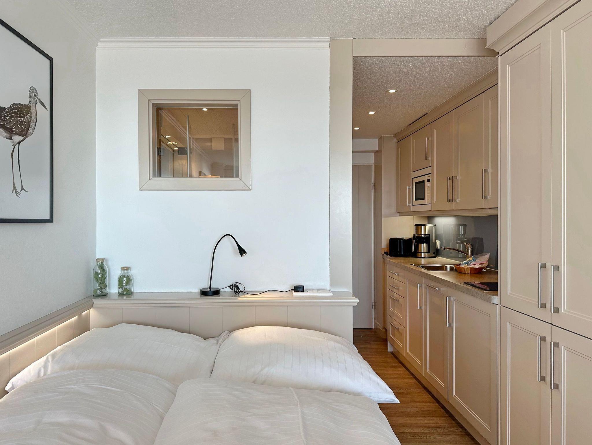 Exklusive 1-Zimmer-Ferienwohnung mit unverbauten Seeblick im 3. Obergeschoß des Haus Metropol. Ca. 25m². Hübsches Wohn- und Schlafzimmer mit Doppelbett (1,40x2m). Essplatz für 2 Personen am Fenster (Achtung Stufe), Couch, Flachbild-TV, Stereoanlage mit CD. W-Lan (ohne Gewähr). Hübsche Küchenzeile mit Geschirrspüler, Mikrowelle und Cerankochfeld. Schickes Duschbad/WC. Nichtraucherwohnung. Tierhaltung ist nicht gestattet. Bettwäsche und Handtücher sind zur Anreise aufgezogen. Ein PKW-Stellplatz kann kostenpflichtig zugebucht werden.