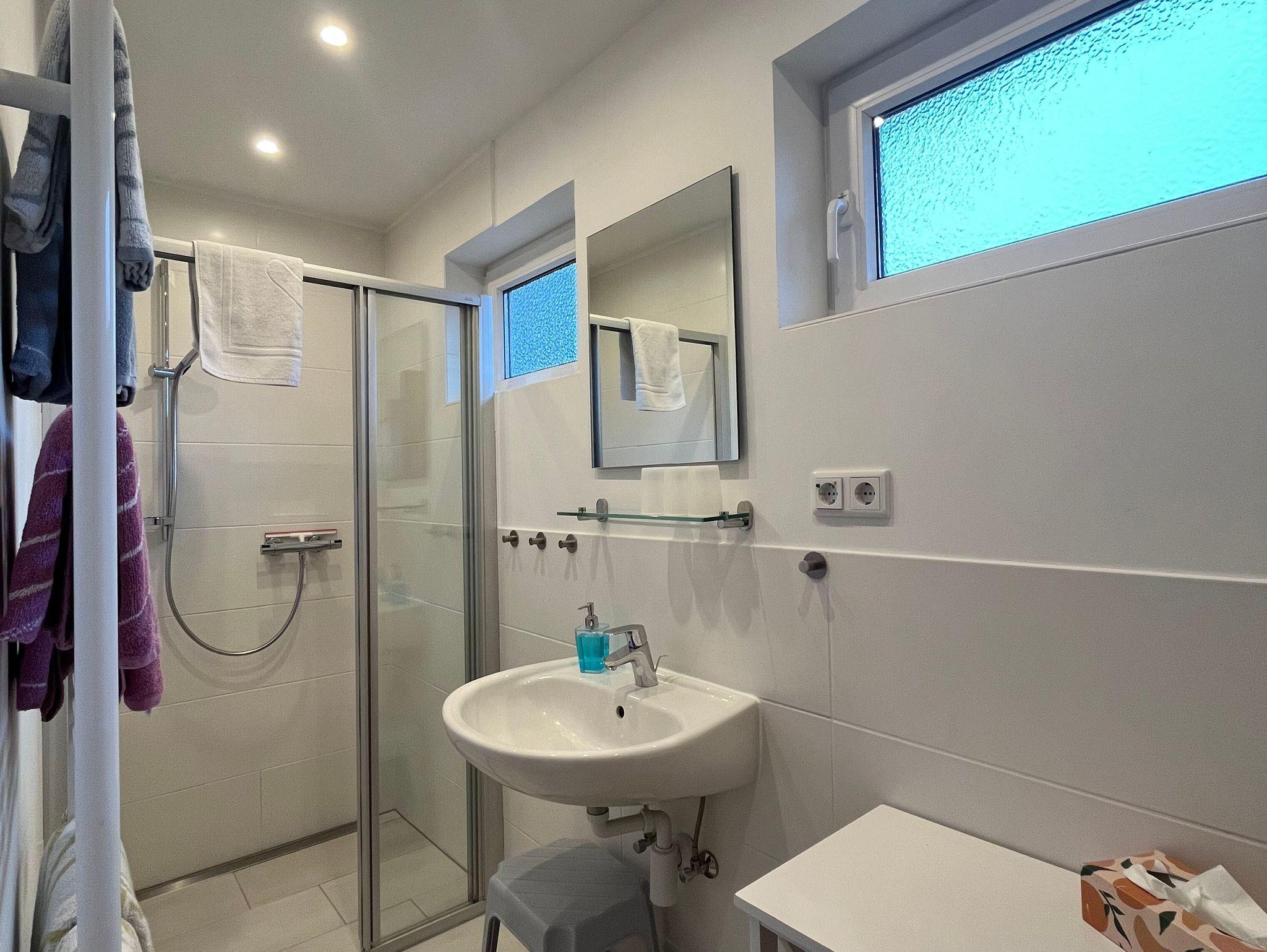 Ein helles Bad mit Waschbecken, Dusche, Haartrockner und Außenfenster