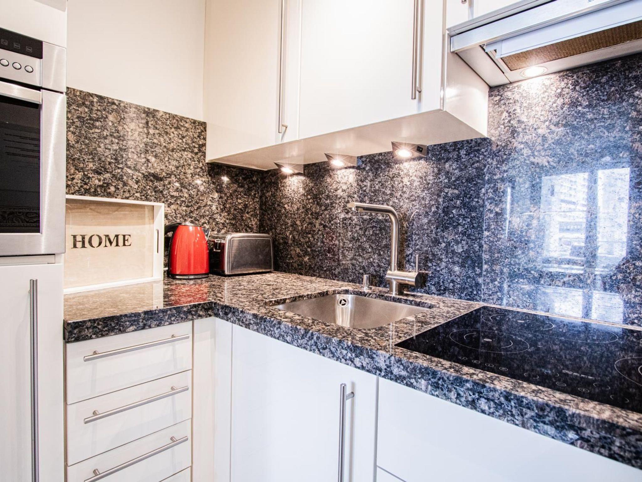 Küche mit Ceran-Kochfeld und Dunstabzug, Backofen, Filter-Kaffeemaschine, elektrischer Wasserkocher und Toaster sind selbstverständlich.