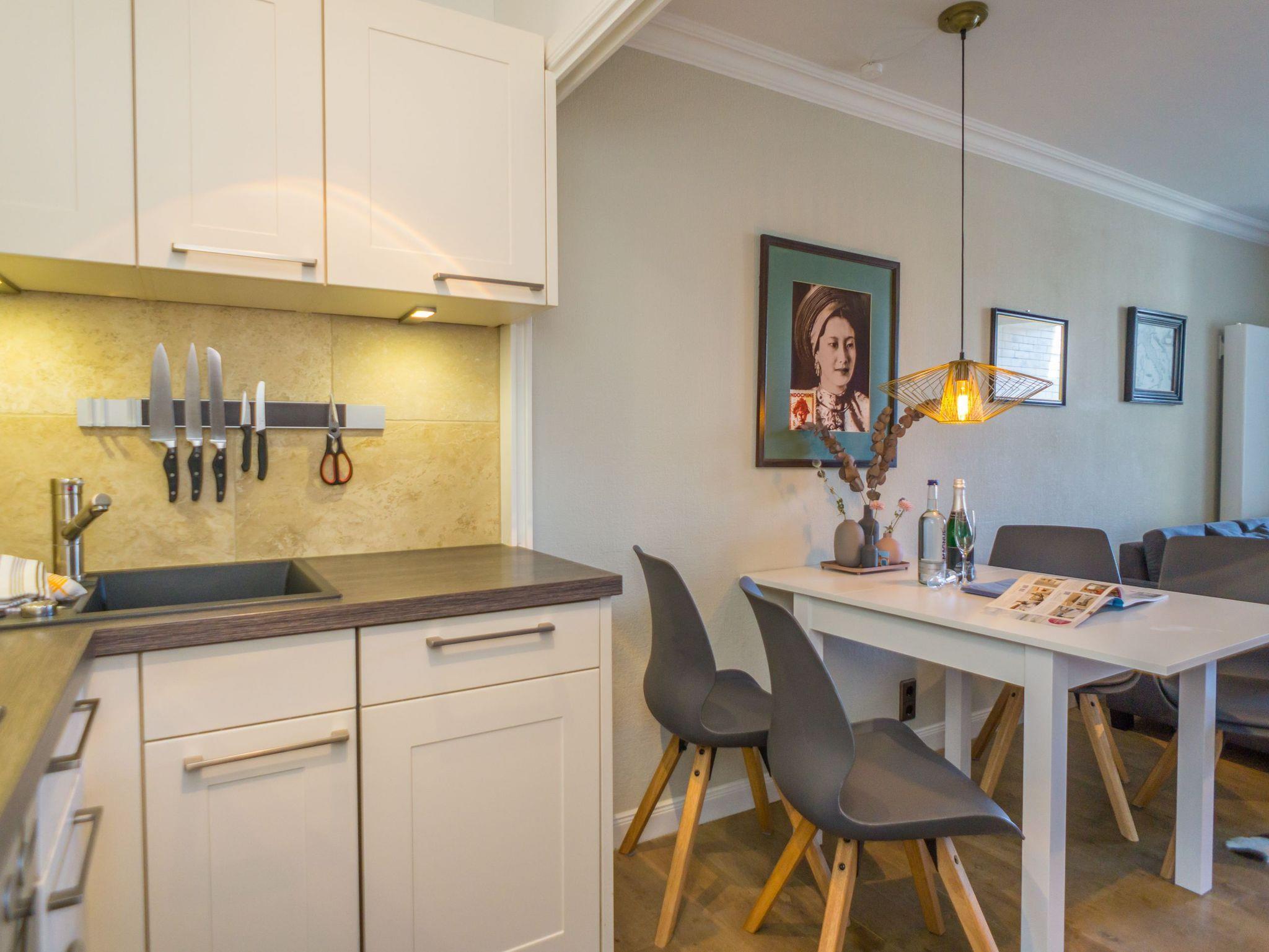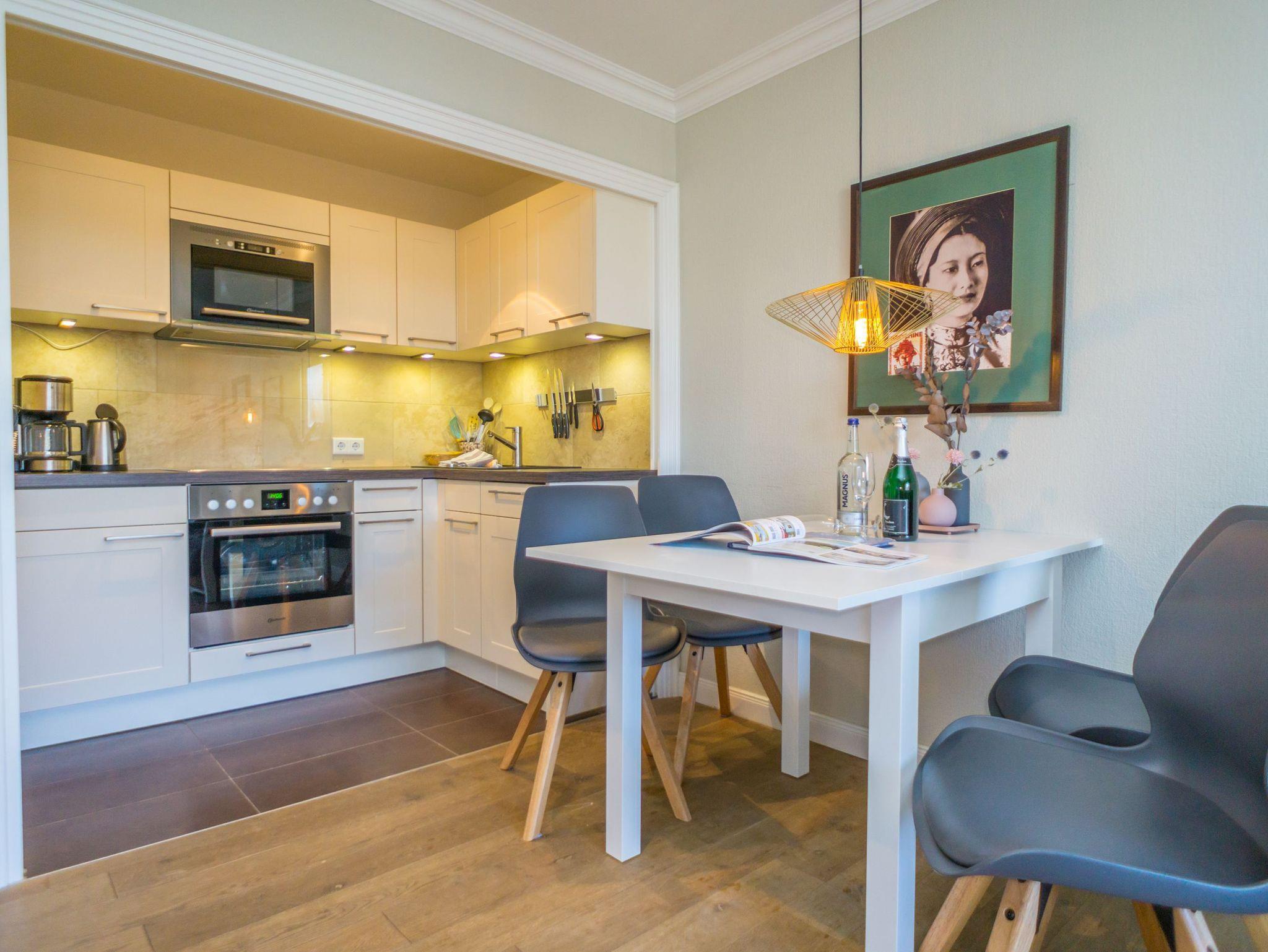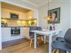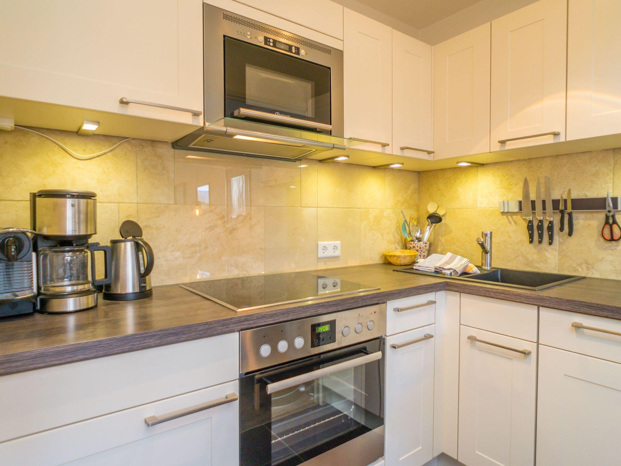 Die offene Küchenzeile hat einen Geschirrspüler, eine Mikrowelle, ein Herd mit Backofen und 4-Platten-Kochfeld sowie einem Kühlschrank mit 3*-Gefrierfach. Kaffeemaschine, Wasserkocher und Toaster gehören zur Grundausstattung.