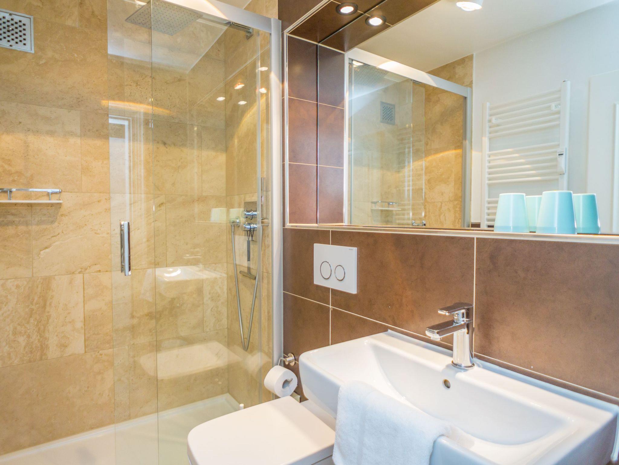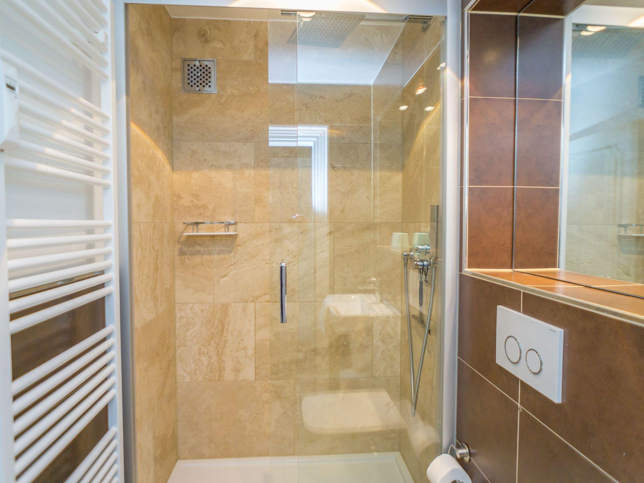 Im Bad befinden sich eine Dusche, ein WC und ein Waschtisch.
