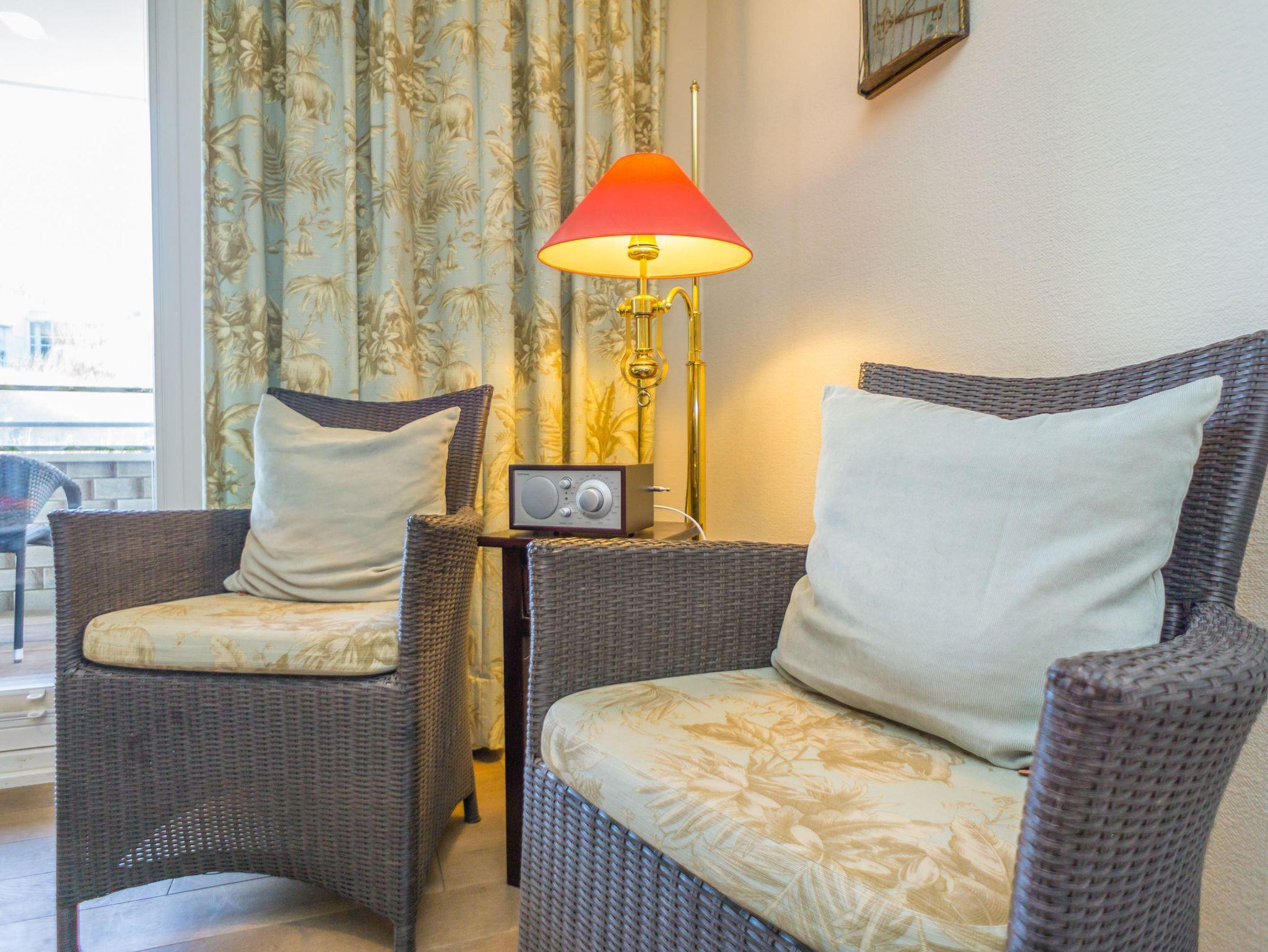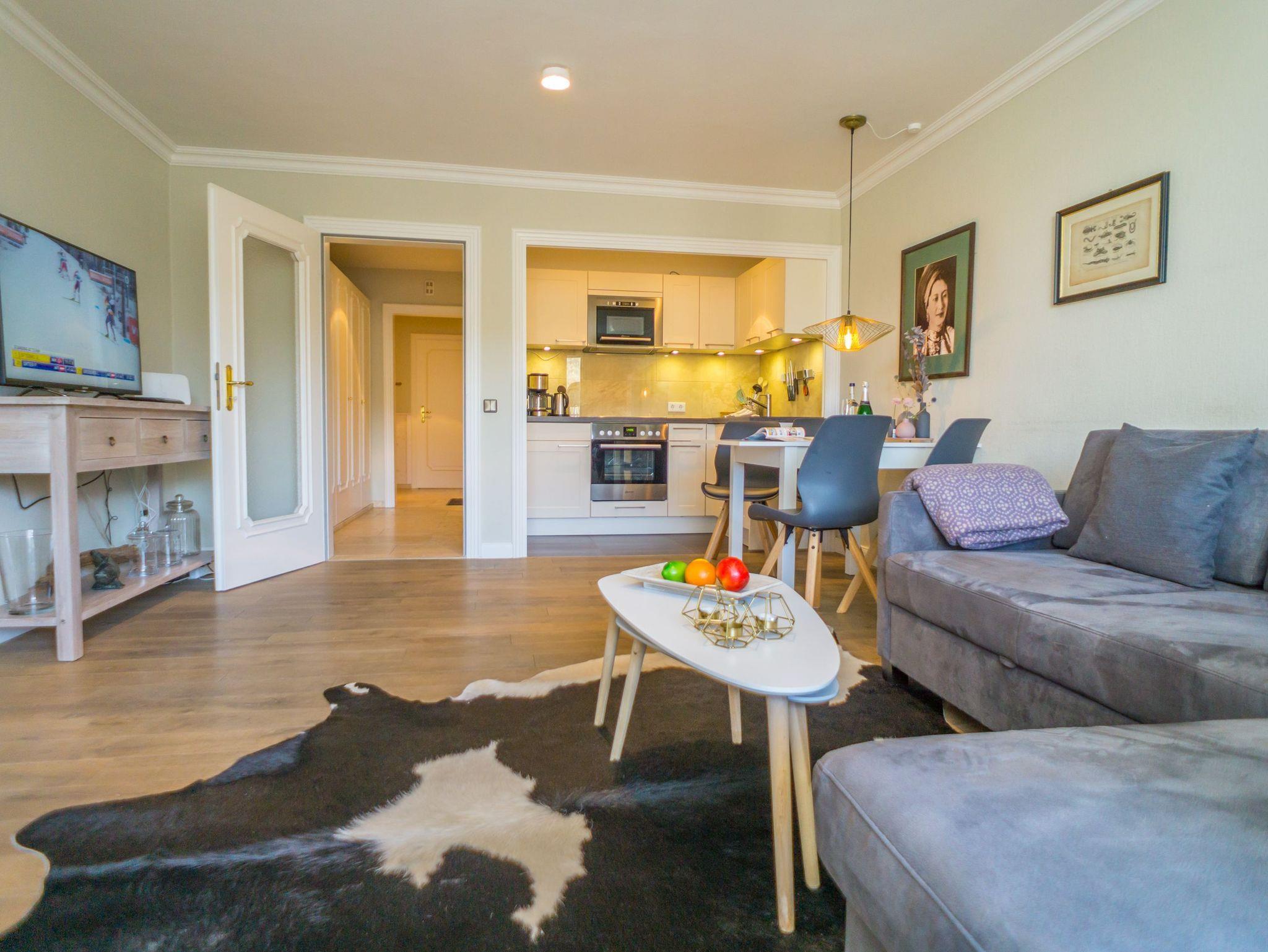 Das Wohnzimmer besteht aus einer gemütlichen Sitzgarnitur (Doppel-Schlafcouch und zwei Korbsessel), einem Essplatz, Sat-Flachbild-TV, Radio, Telefon, W- Lan und T-Entertainment.