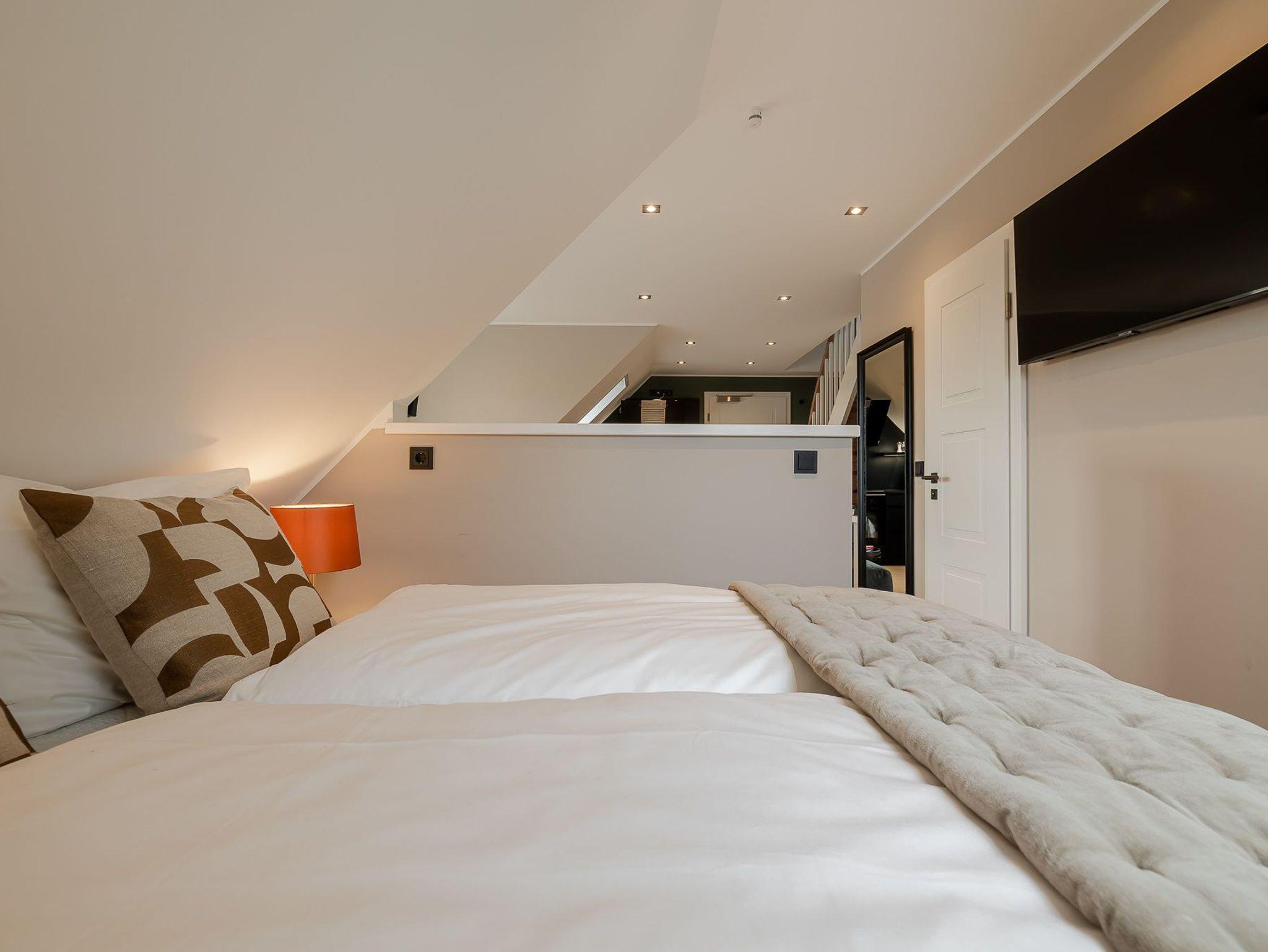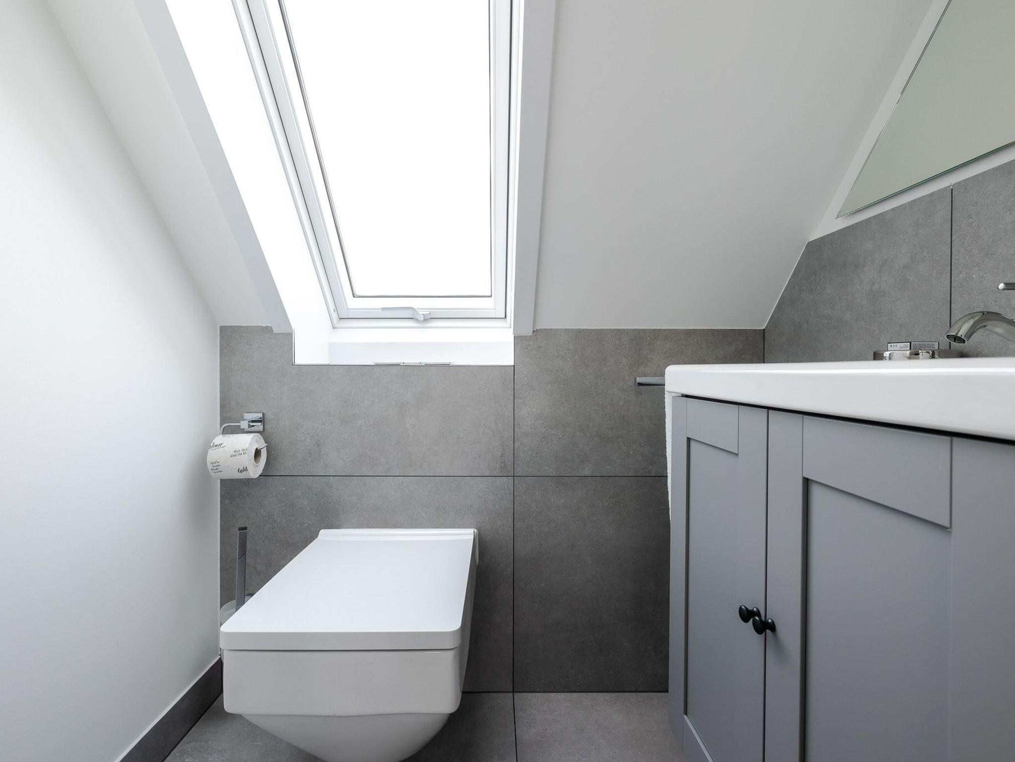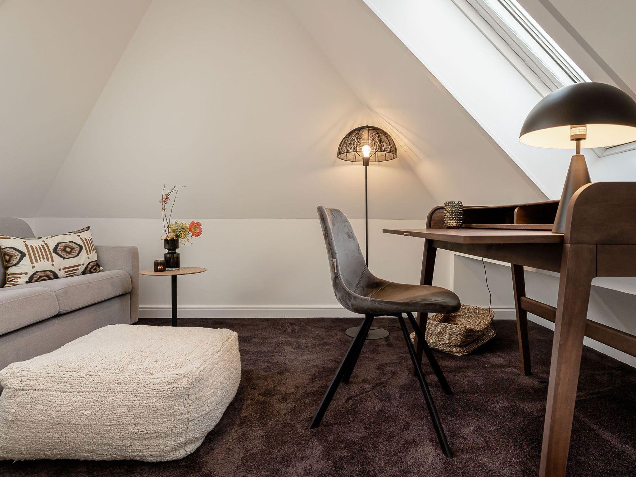 Auf der oberen Etage der Maisonette Wohnung befindet sich ein zusätzlicher Wohn- und Arbeitsbereich mit Schreibtisch und Sofa sowie ein weiteres WC-Badezimmer.