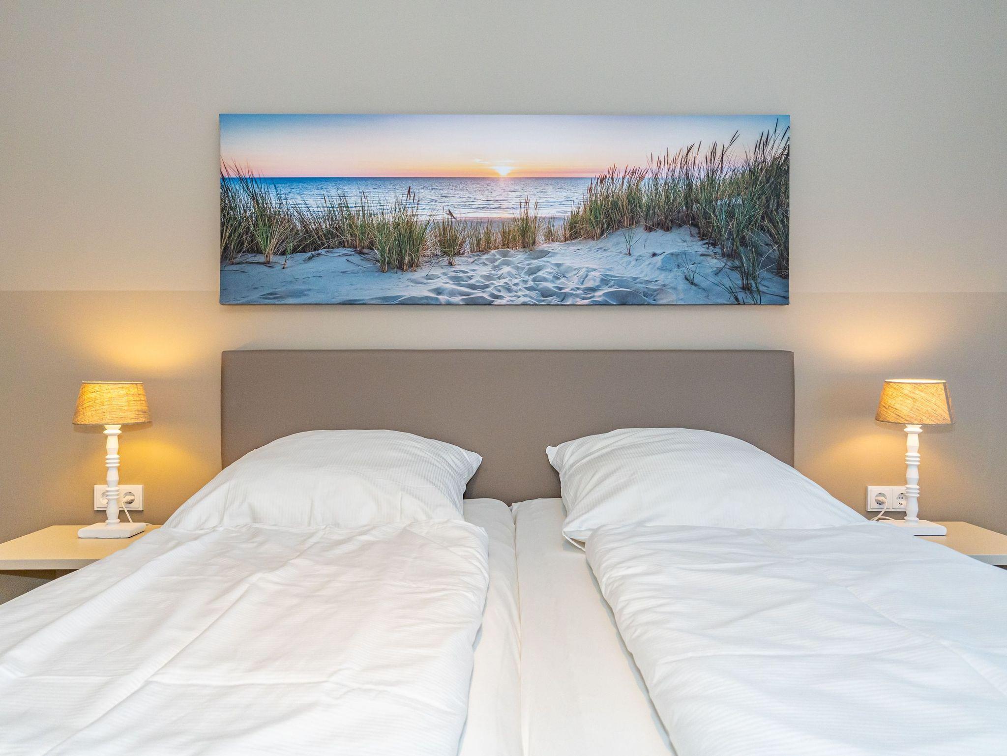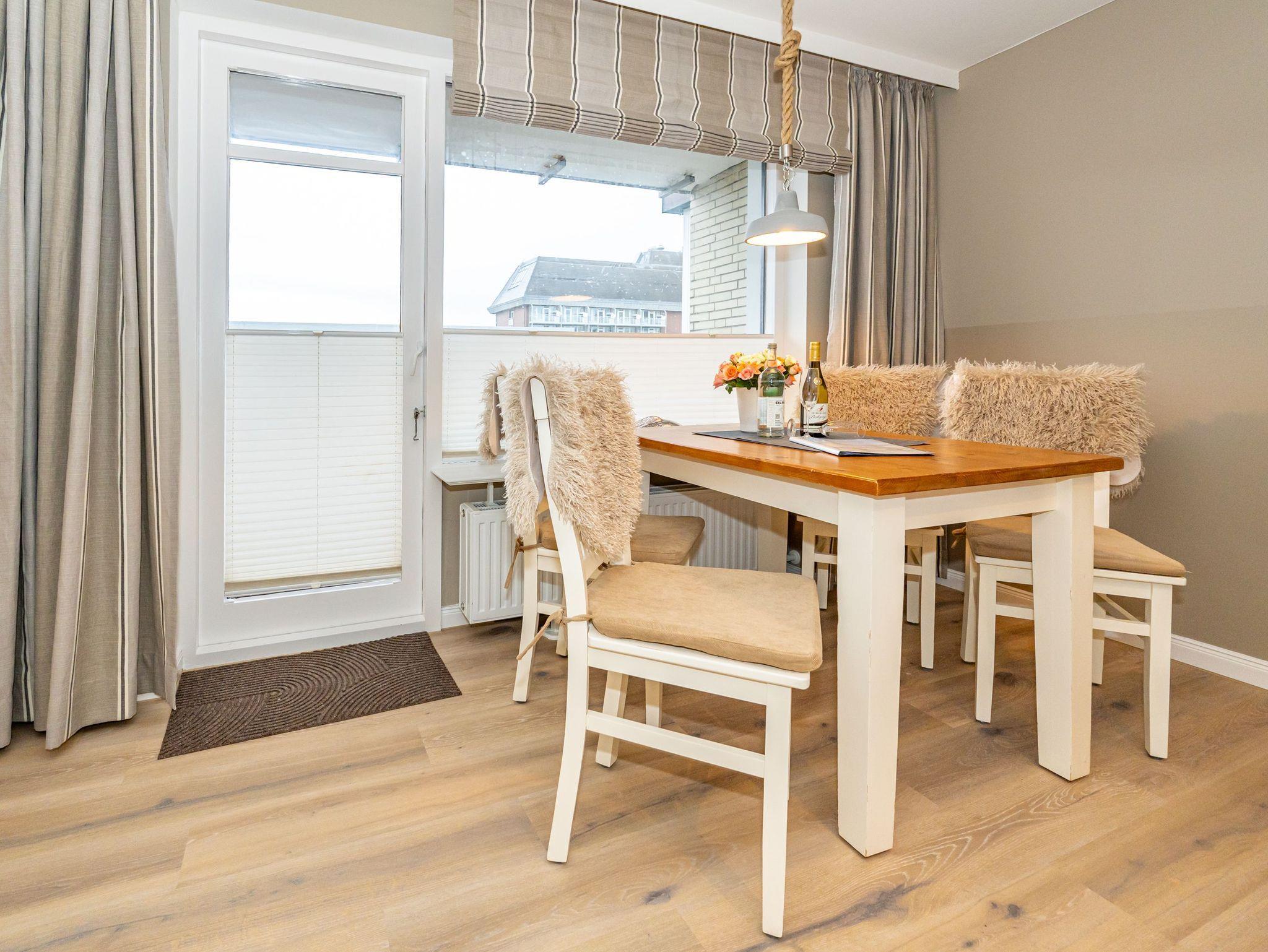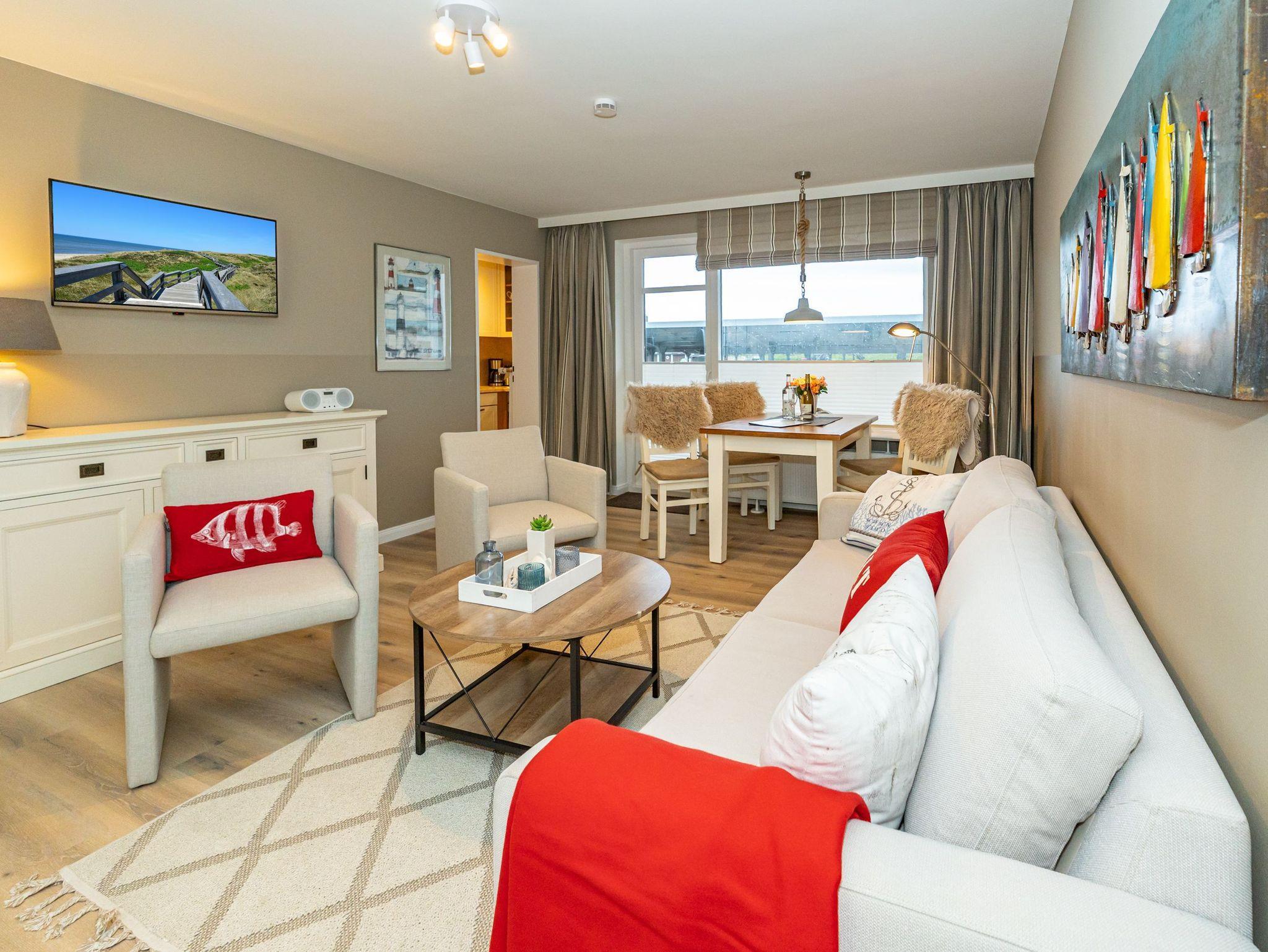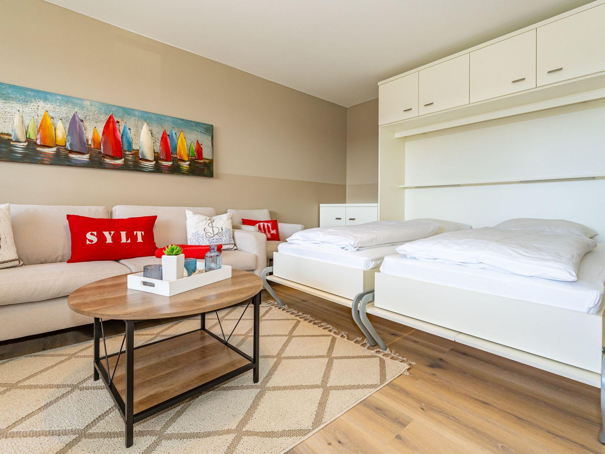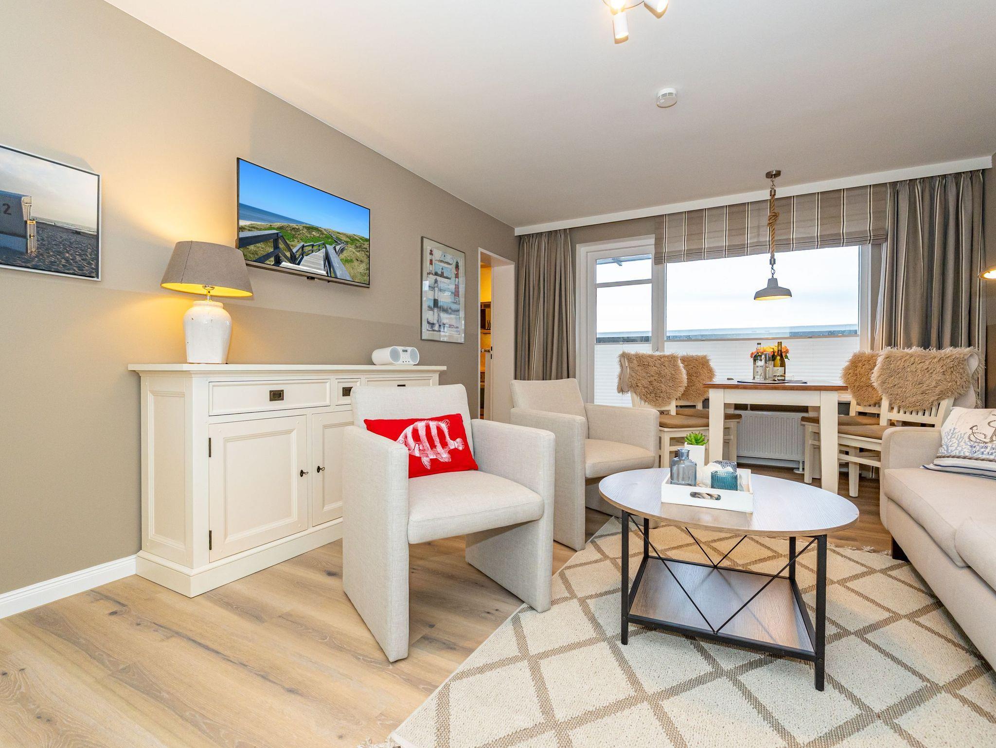 Diese ca. 65 m² große Nichtraucherwohnung im Hochparterre bietet Platz für bis zu 4 Personen und überzeugt mit einem durchdachten Grundriss, viel Licht und einer angenehm wohnlichen Atmosphäre ? perfekt für entspannte Urlaubstage auf Sylt. Das Schlafzimmer ist mit einem komfortablen Doppelbett (180 x 200 cm) ausgestattet und verfügt über einen eigenen Fernseher, ein zusätzliches Waschbecken sowie einen direkten Zugang zur zweiten, separaten Westloggia. Im gemütlich eingerichteten Wohnzimmer stehen zwei einzeln klappbare Wandbetten bereit, die bei Bedarf zusätzliche Schlafplätze bieten. Ein Flachbild-TV sorgt für Unterhaltung. Die separate Küche ist funktional und gut ausgestattet ? mit Geschirrspüler, Cerankochfeld, Backofen, Kaffeemaschine, Wasserkocher und Toaster ist alles vorhanden. Das hell geflieste Badezimmer verfügt über eine Dusche, ein WC und einen fest installierten Fön. Ergänzend steht ein separates Gäste-WC zur Verfügung.