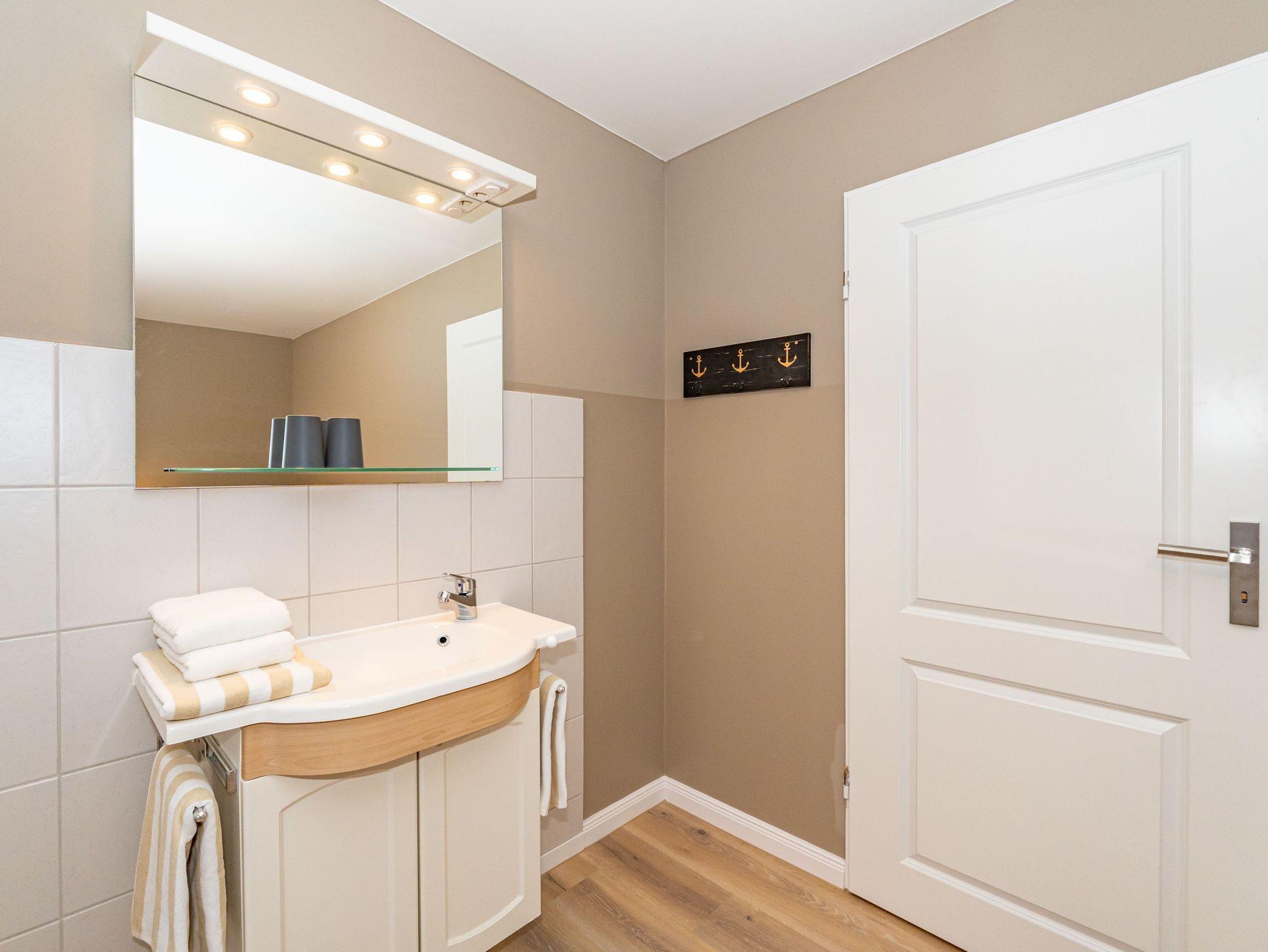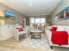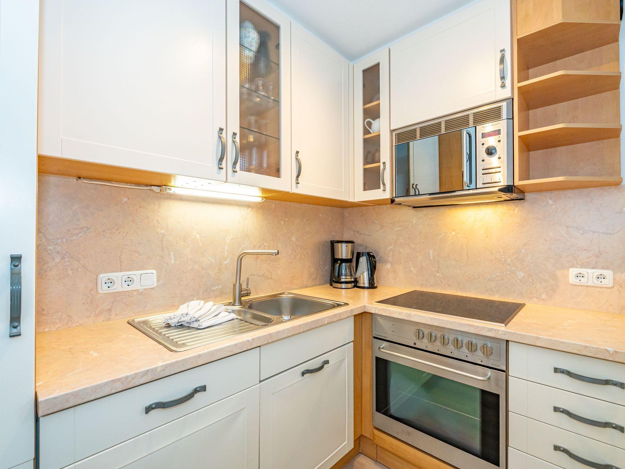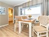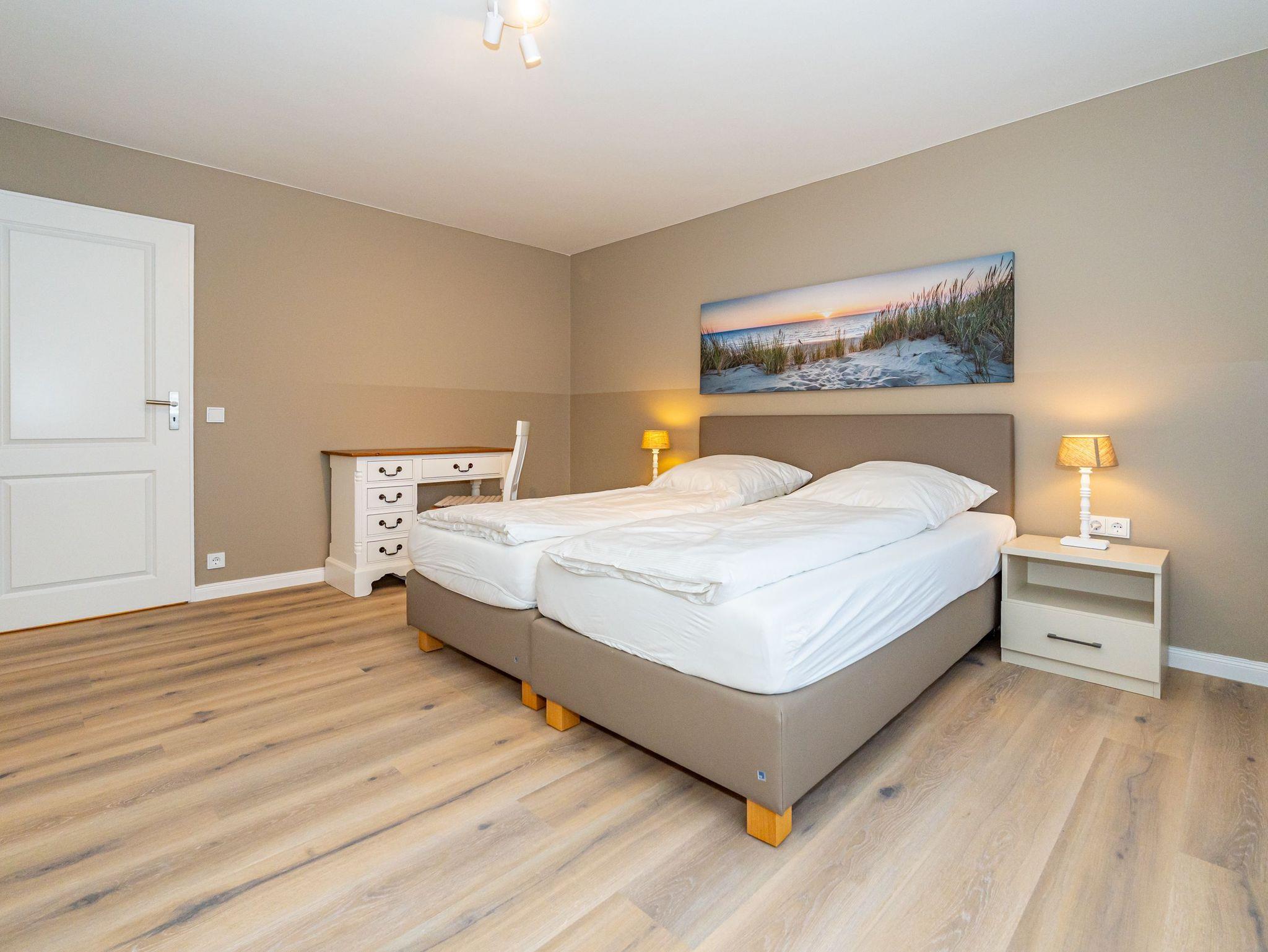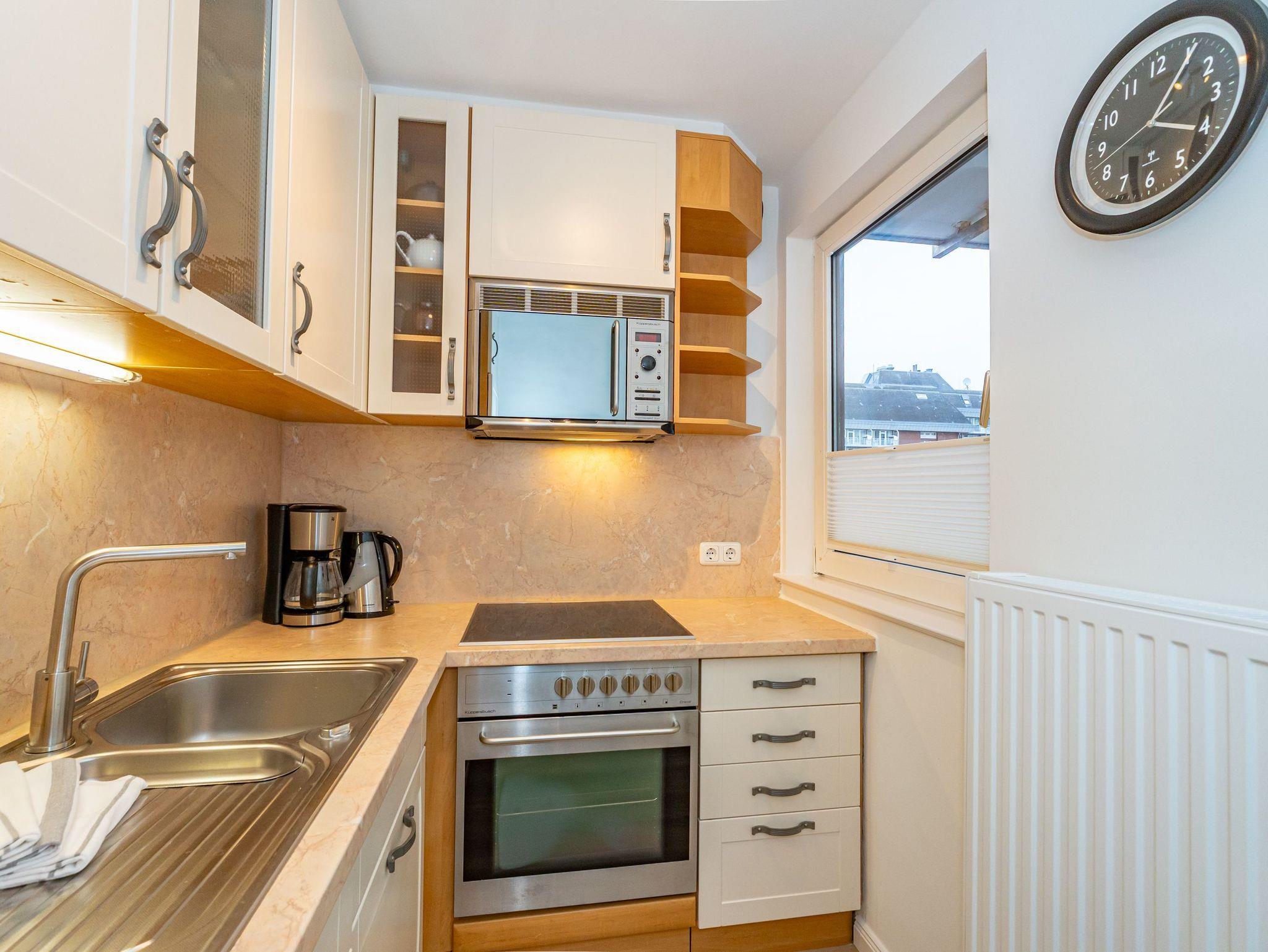 Diese ca. 65 m² große Nichtraucherwohnung im Hochparterre bietet Platz für bis zu 4 Personen und überzeugt mit einem durchdachten Grundriss, viel Licht und einer angenehm wohnlichen Atmosphäre ? perfekt für entspannte Urlaubstage auf Sylt. Das Schlafzimmer ist mit einem komfortablen Doppelbett (180 x 200 cm) ausgestattet und verfügt über einen eigenen Fernseher, ein zusätzliches Waschbecken sowie einen direkten Zugang zur zweiten, separaten Westloggia. Im gemütlich eingerichteten Wohnzimmer stehen zwei einzeln klappbare Wandbetten bereit, die bei Bedarf zusätzliche Schlafplätze bieten. Ein Flachbild-TV sorgt für Unterhaltung. Die separate Küche ist funktional und gut ausgestattet ? mit Geschirrspüler, Cerankochfeld, Backofen, Kaffeemaschine, Wasserkocher und Toaster ist alles vorhanden. Das hell geflieste Badezimmer verfügt über eine Dusche, ein WC und einen fest installierten Fön. Ergänzend steht ein separates Gäste-WC zur Verfügung.