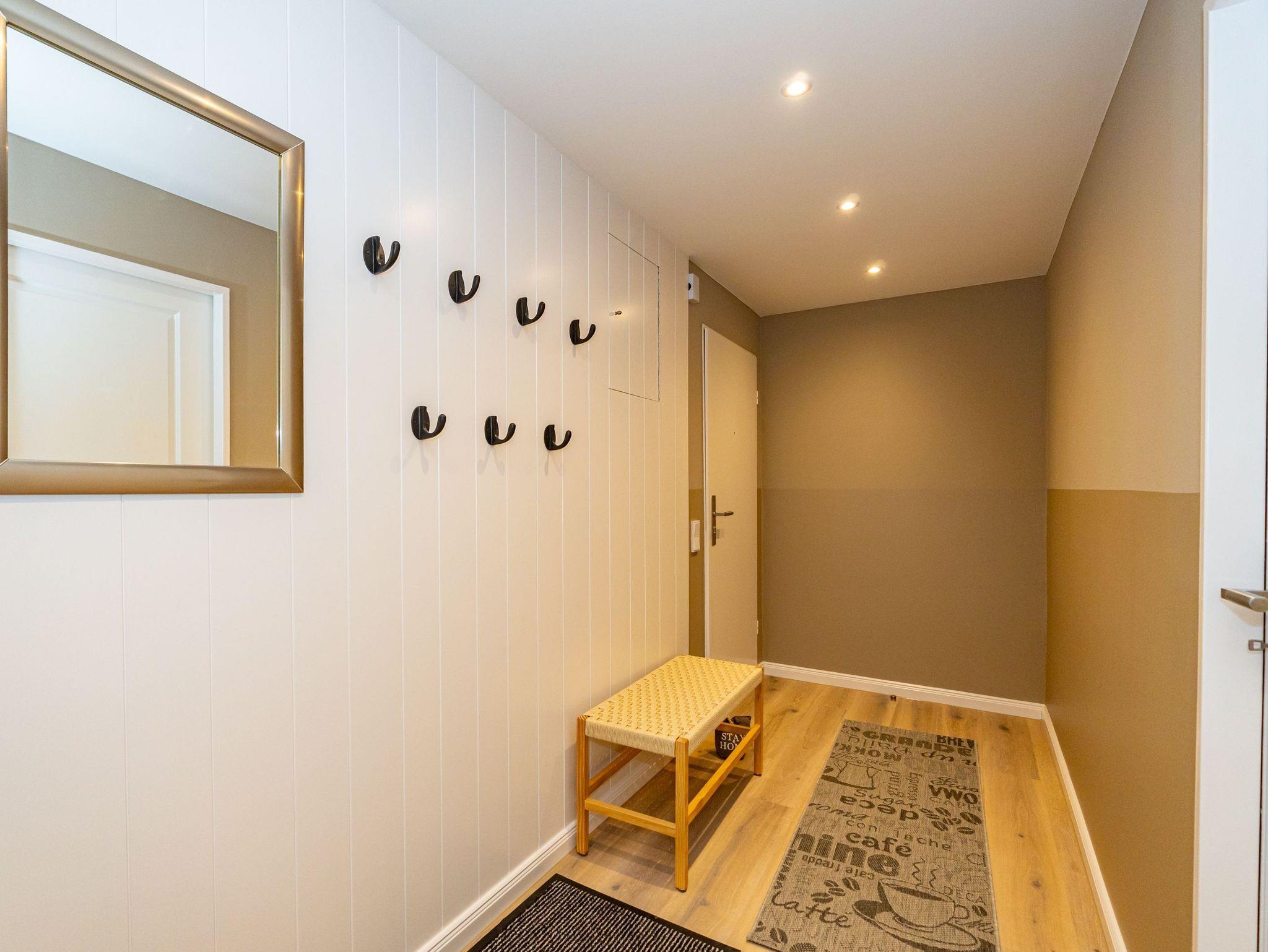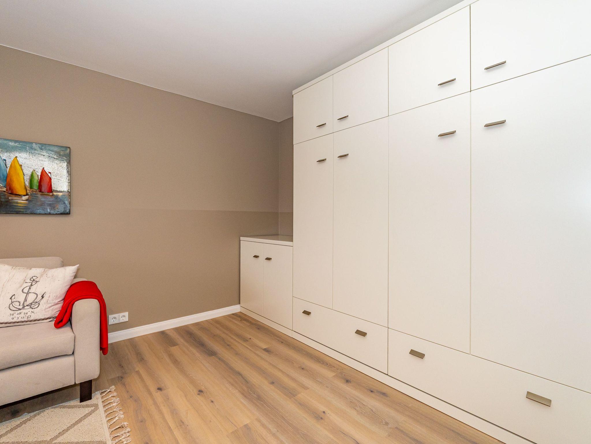 Diese ca. 65 m² große Nichtraucherwohnung im Hochparterre bietet Platz für bis zu 4 Personen und überzeugt mit einem durchdachten Grundriss, viel Licht und einer angenehm wohnlichen Atmosphäre perfekt für entspannte Urlaubstage auf Sylt. Das Schlafzimmer ist mit einem komfortablen Doppelbett (180 x 200 cm) ausgestattet und verfügt über einen eigenen Fernseher, ein zusätzliches Waschbecken sowie einen direkten Zugang zur zweiten, separaten Westloggia. Im gemütlich eingerichteten Wohnzimmer stehen zwei einzeln klappbare Wandbetten bereit, die bei Bedarf zusätzliche Schlafplätze bieten. Ein Flachbild-TV sorgt für Unterhaltung. Die separate Küche ist funktional und gut ausgestattet mit Geschirrspüler, Cerankochfeld, Backofen, Kaffeemaschine, Wasserkocher und Toaster ist alles vorhanden. Das hell geflieste Badezimmer verfügt über eine Dusche, ein WC und einen fest installierten Fön. Ergänzend steht ein separates Gäste-WC zur Verfügung.