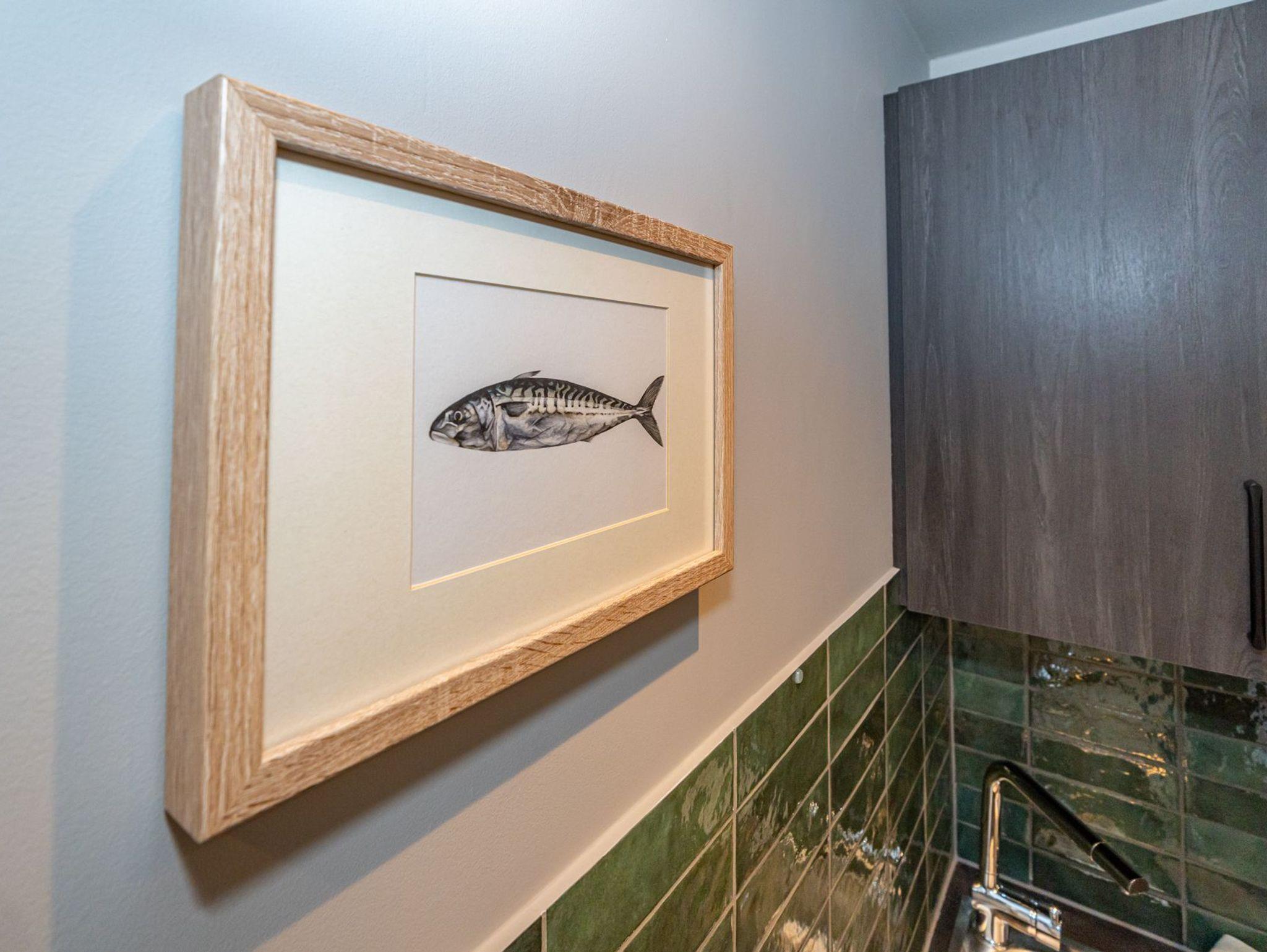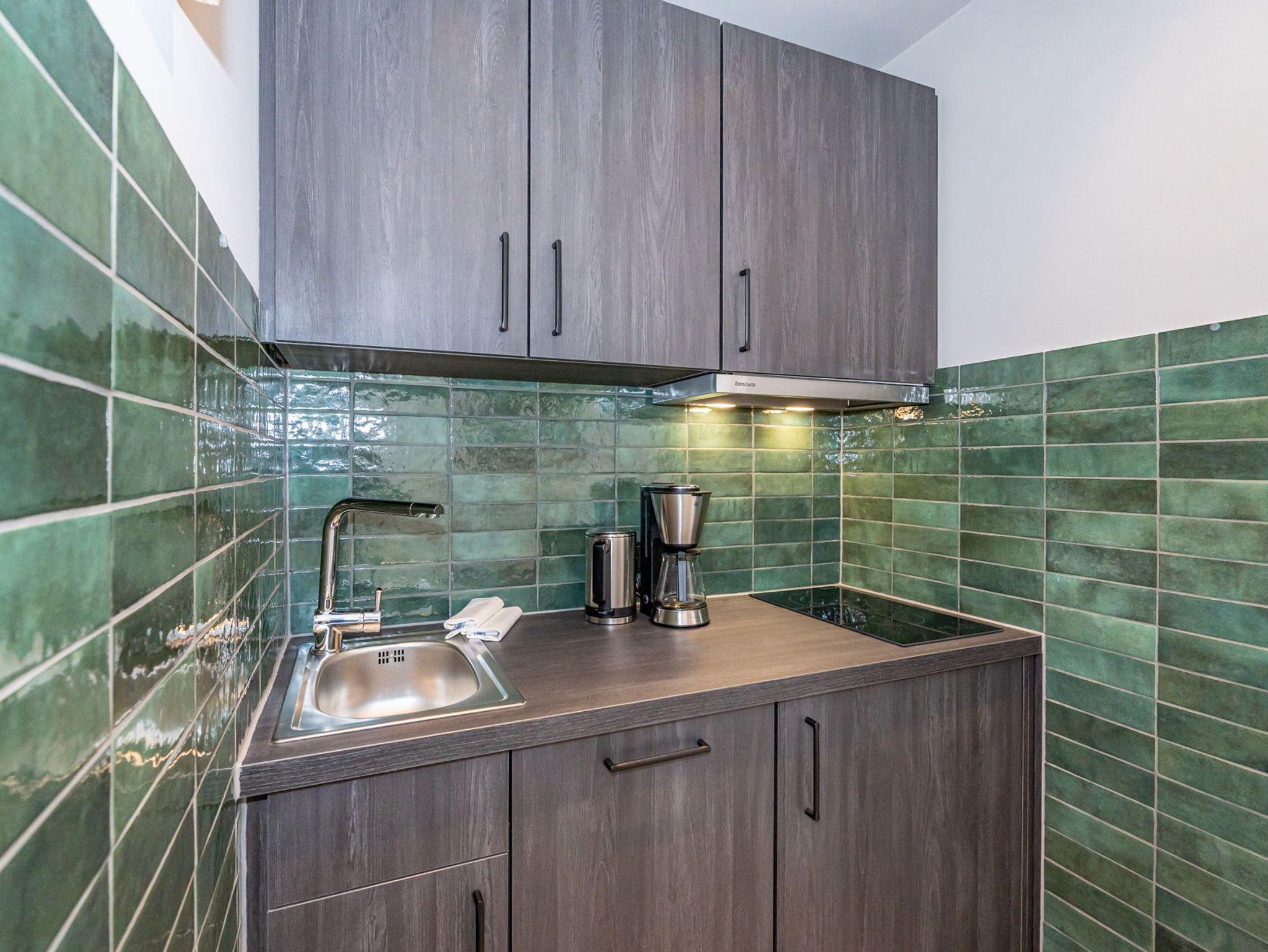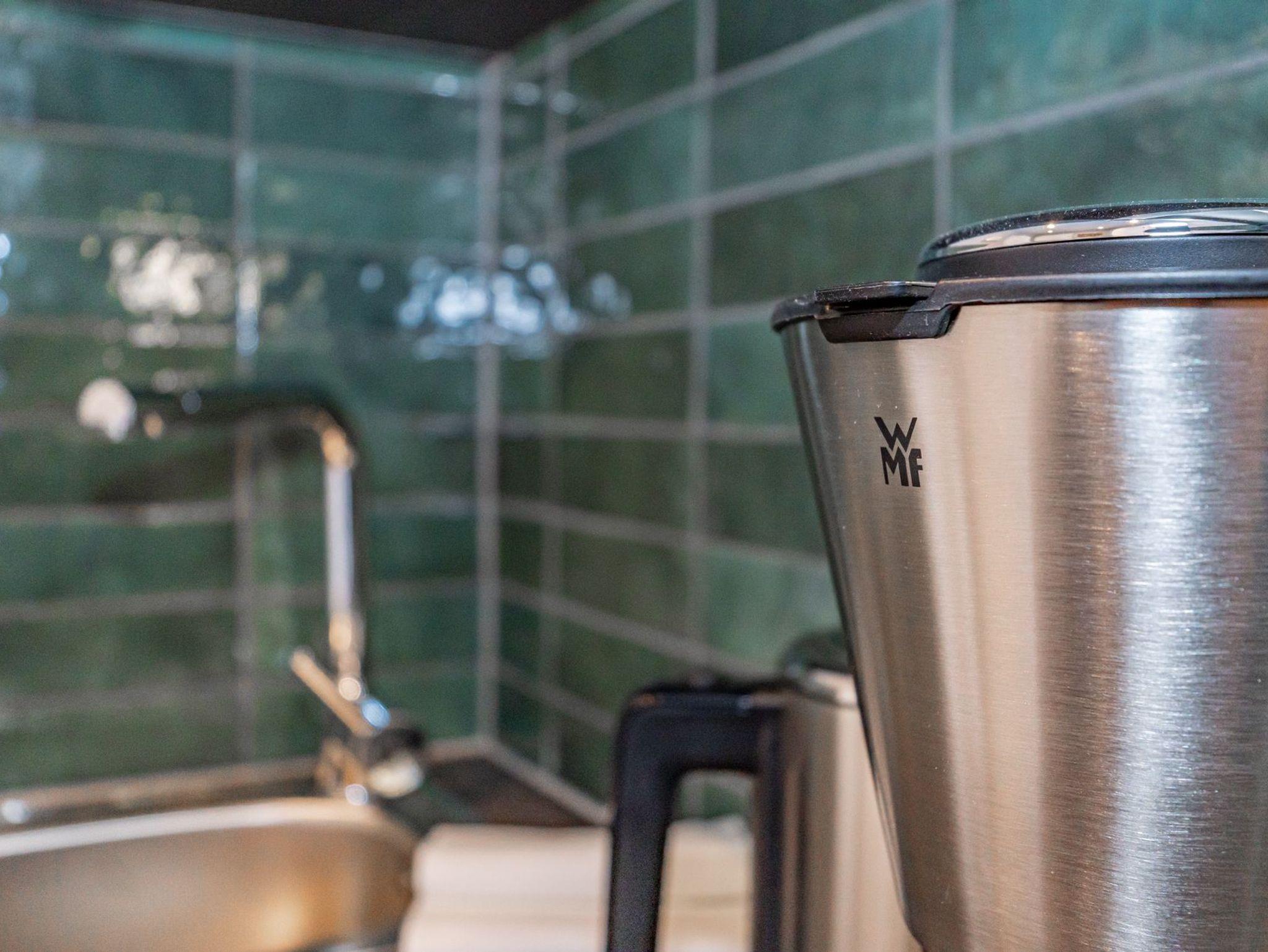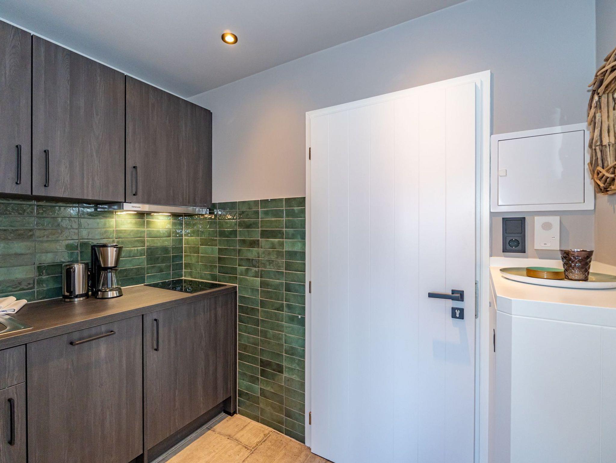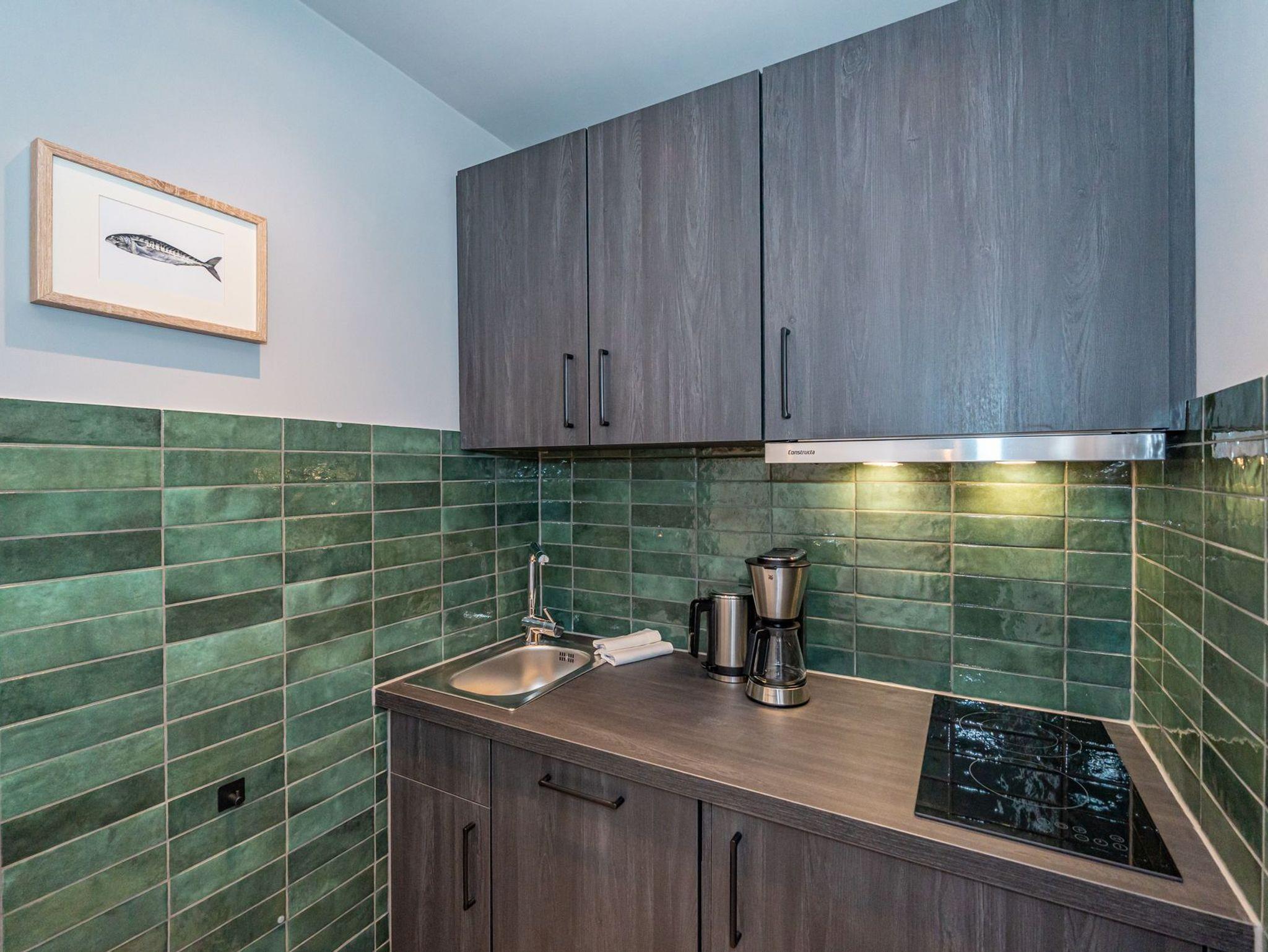 Die offene Einbauküche in der Diele besitzt einen Geschirrspüler, ein Cerankochfeld und einen Kühlschrank mit 3-Sterne-Gefrierfach. Kaffeemaschine, Wasserkocher und Toaster gehören zur Grundausstattung.