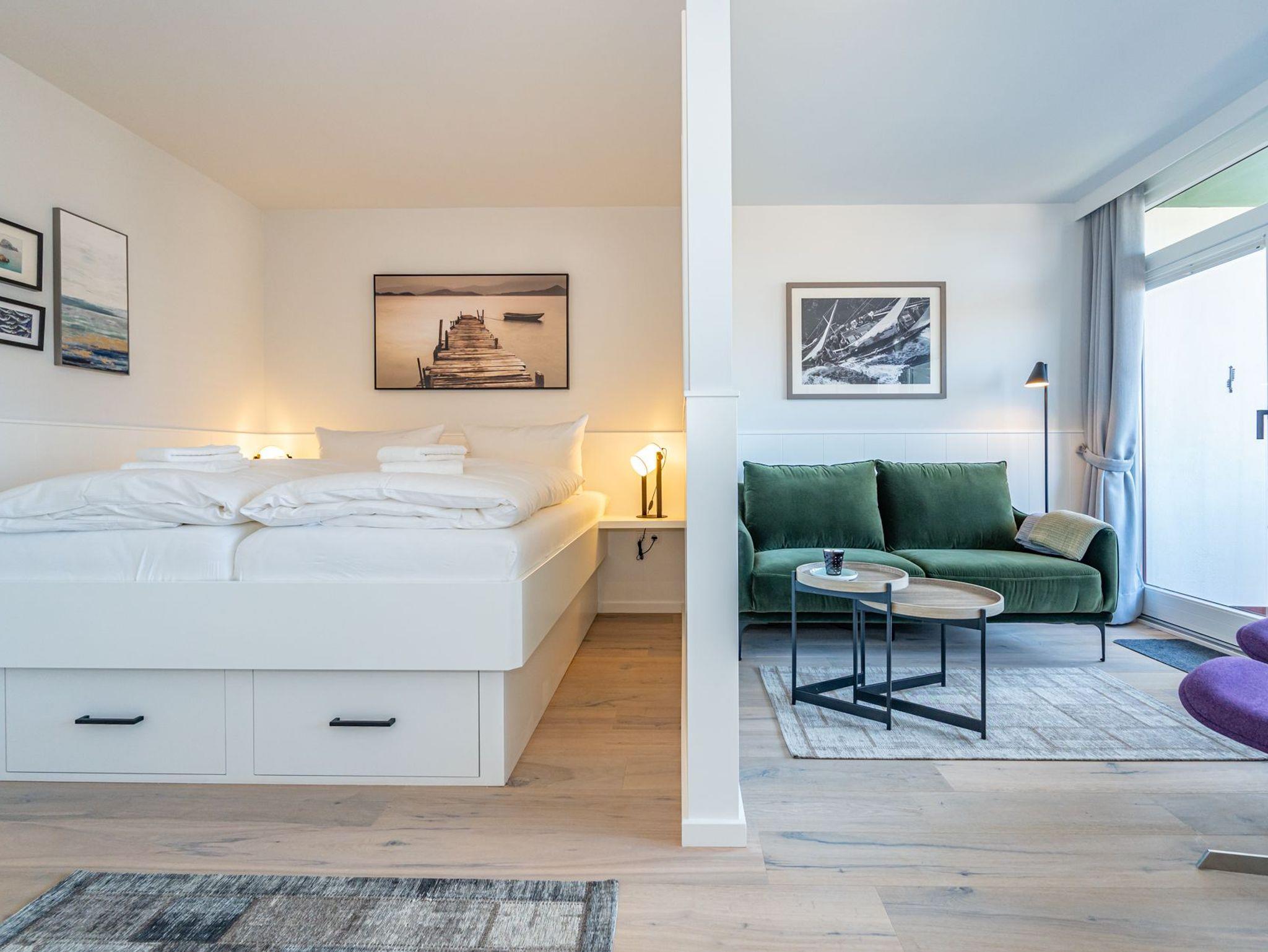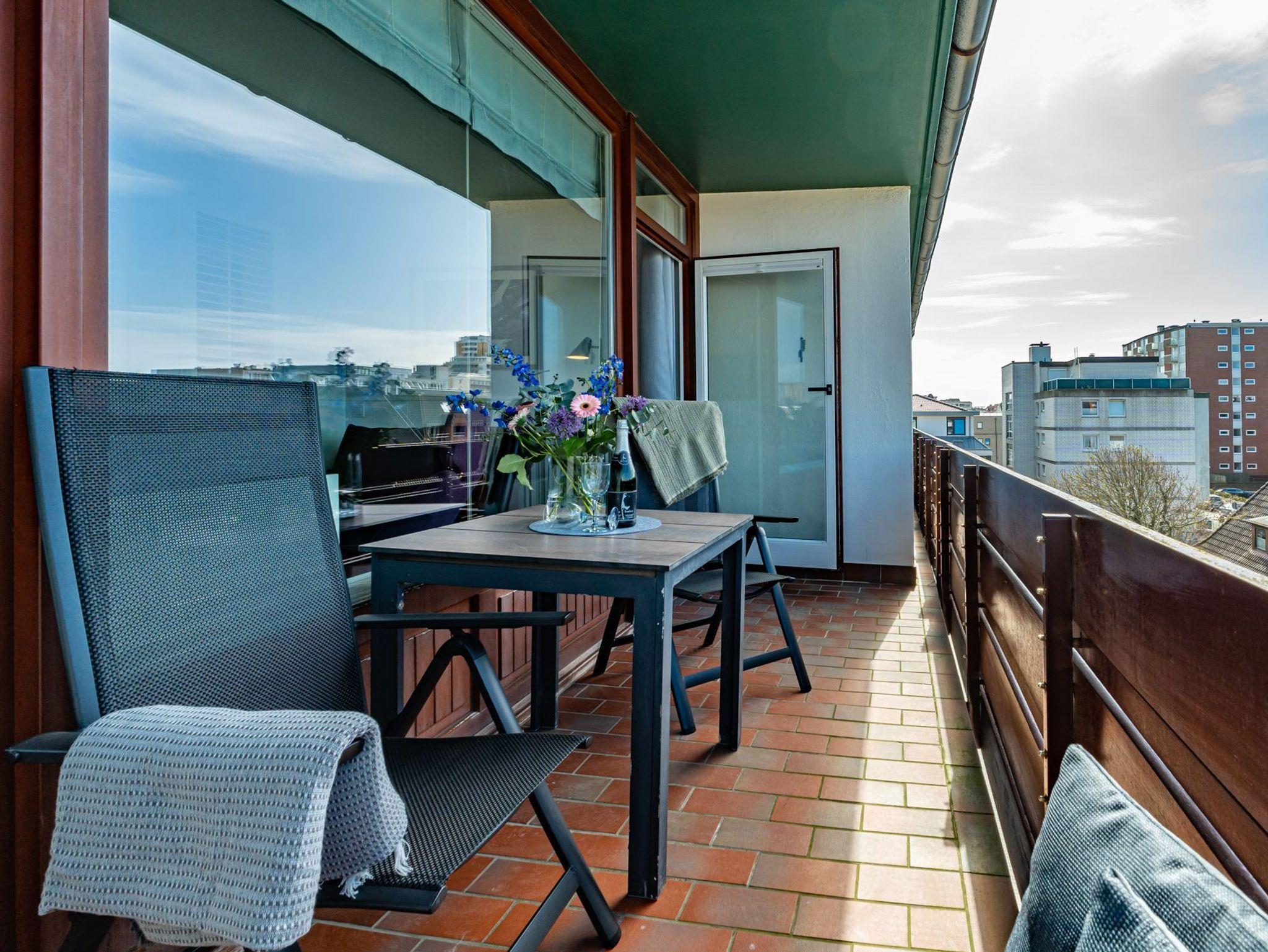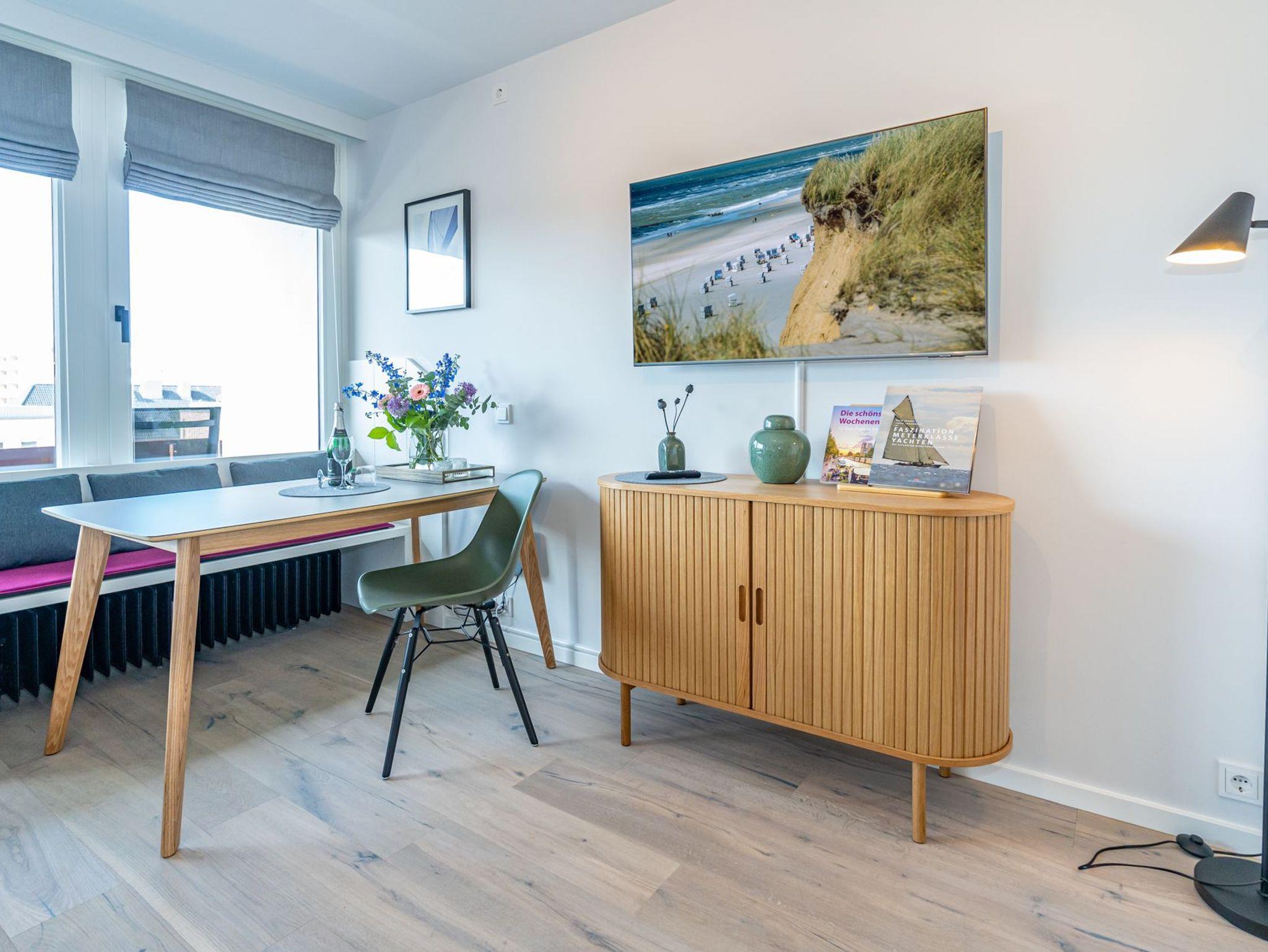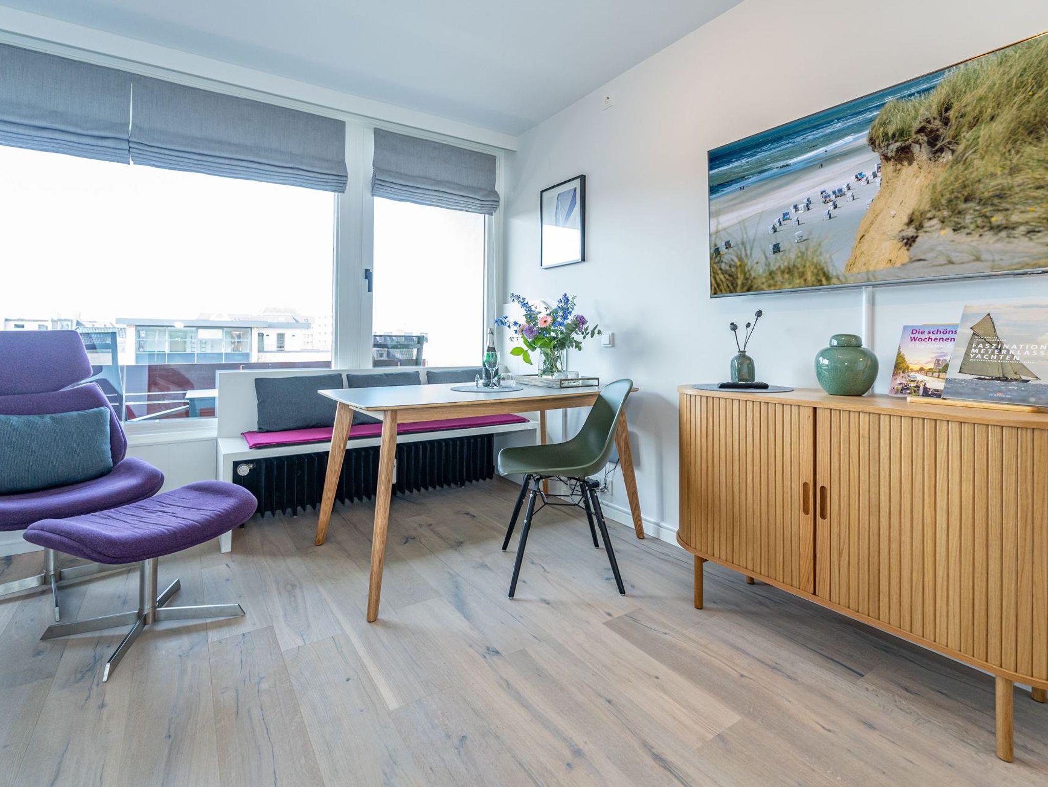 Die geschmackvoll ausgestattete 1-Zimmer-Nichtraucher-Ferienwohnung (ca. 36 qm) in der 3. Etage mit Westloggia (mit Balkonmöbeln und Auflagen) bietet höchsten Komfort auf kleinem Raum für max. 2 Personen.