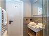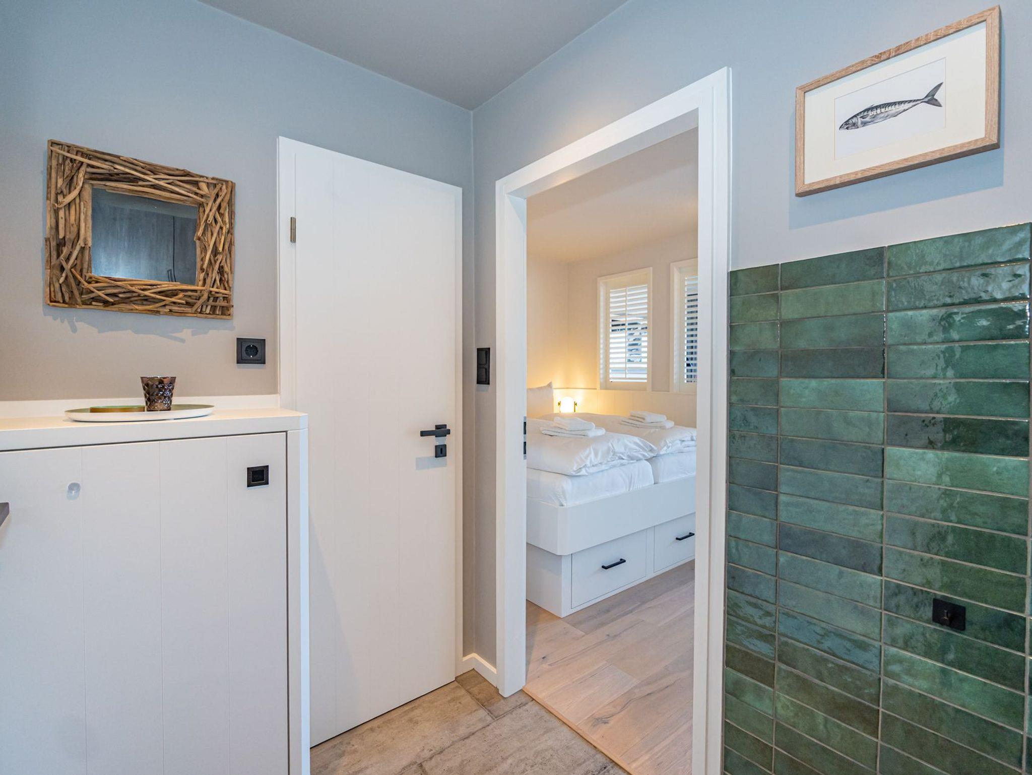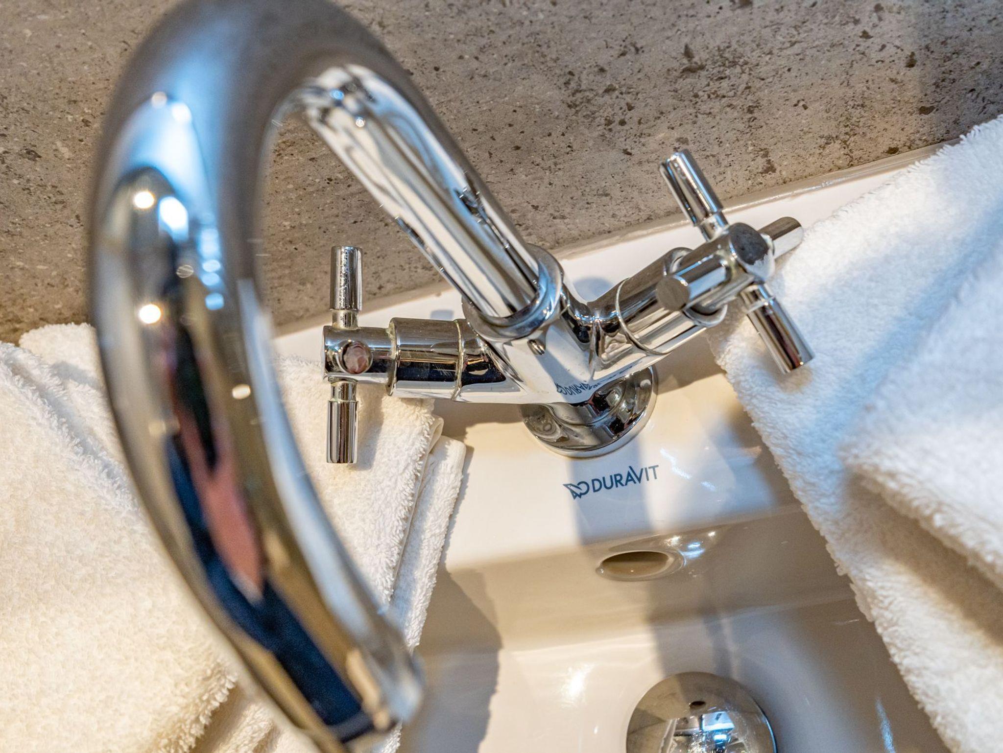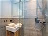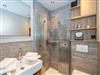 Das moderne Badezimmer ist mit einer extraflachen Dusche, Waschtisch, Handtuchtrockner, Fön, Kosmetikspiegel und WC ausgestattet.