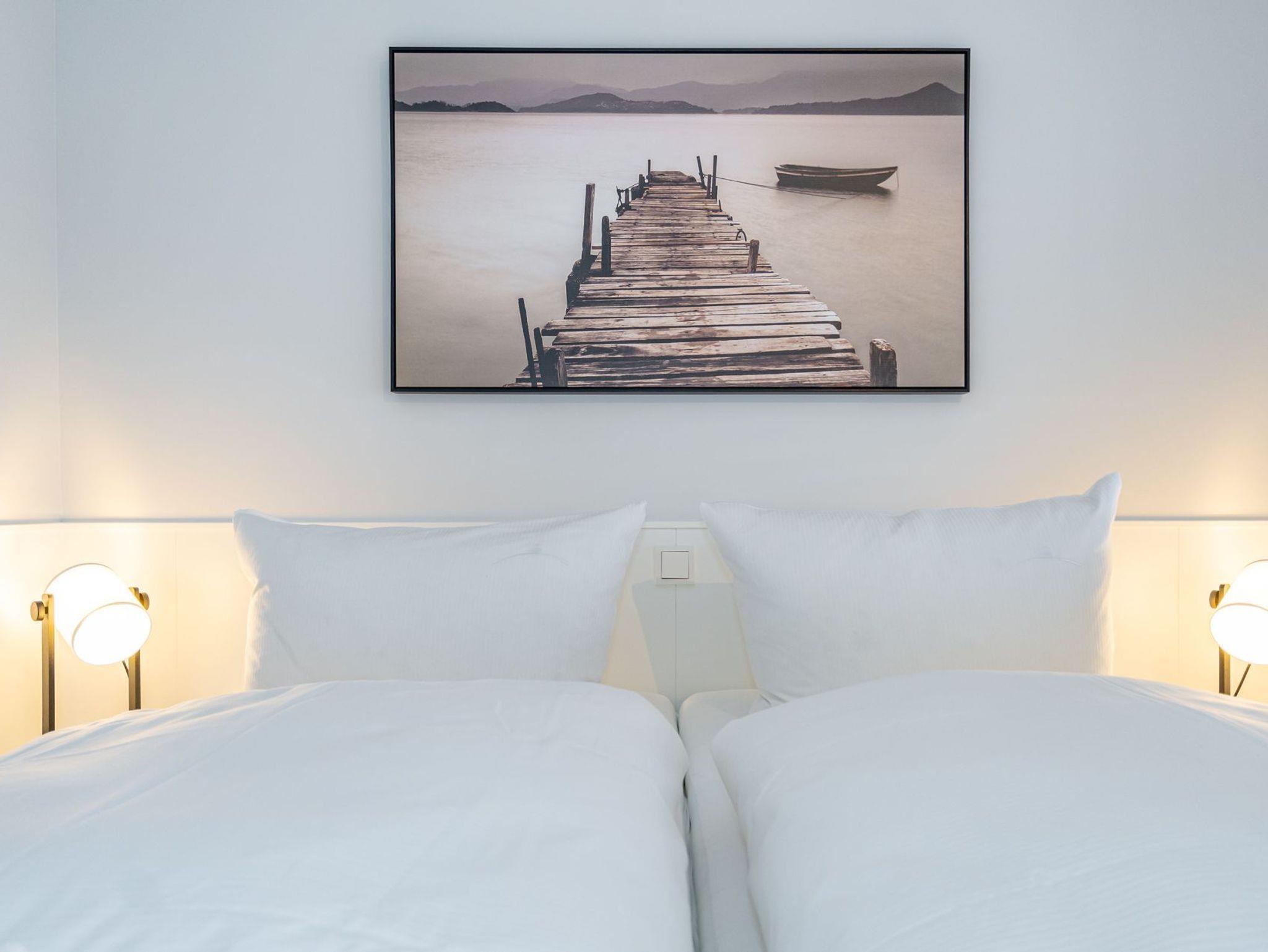 Der Wohn-/Schlafraum ist mit aufwendigen Tischlereinbauten wie einem feststehendem Doppelbett (Liegefläche ca. 1,60 x 2,00m, Einzelmatratzen, Komfortliegehöhe ca. 70 cm), Kleiderschrank, umlaufender Wandpaneele, separaten großzügigen Essplatz mit Sitzbank, hochwertige Türen, sowie einer gemütlichen Zwei-Sitzer-Couch mit Sessel und einem großzügigen Flachbild-TV komplett ausgestattet.