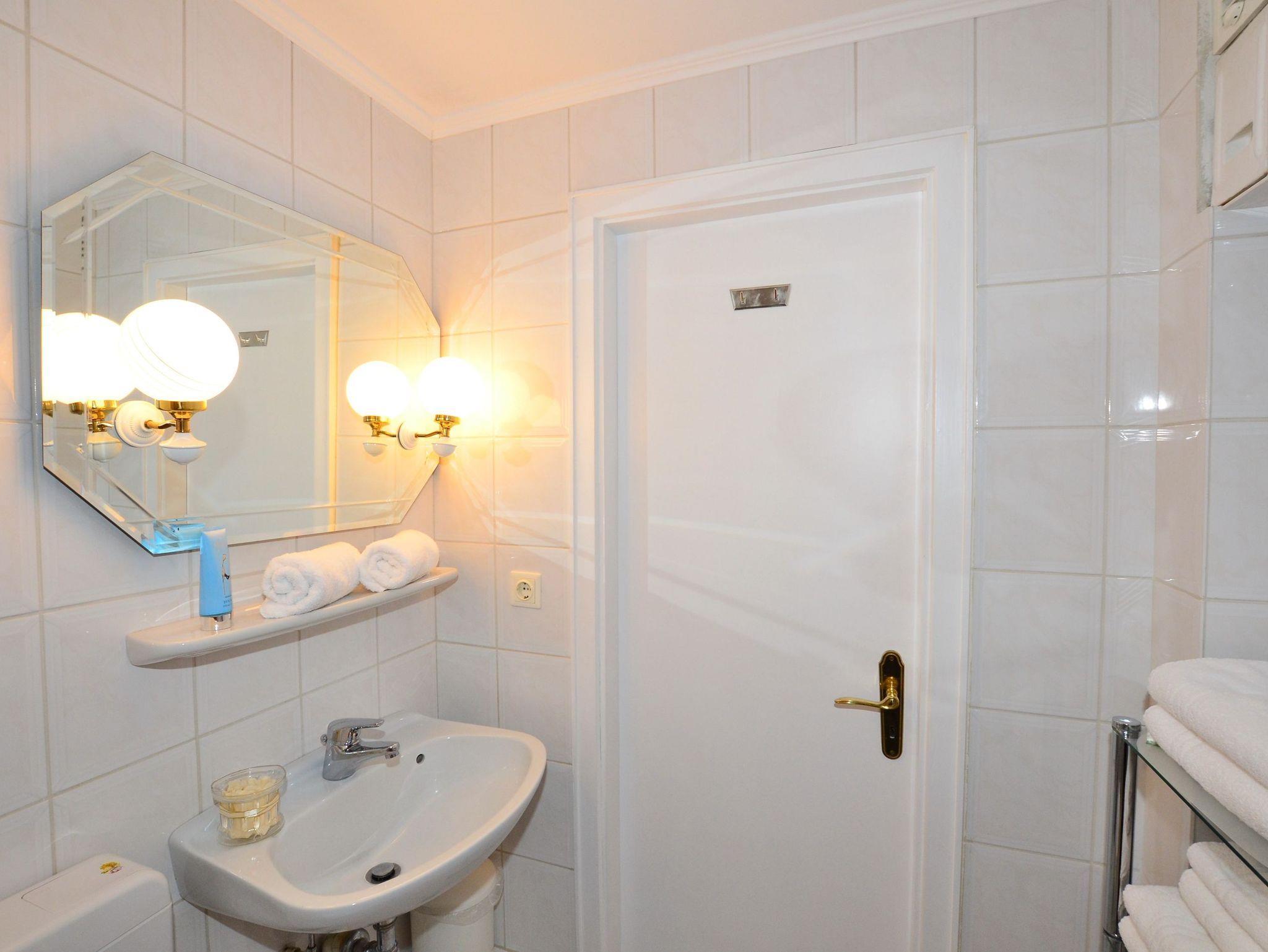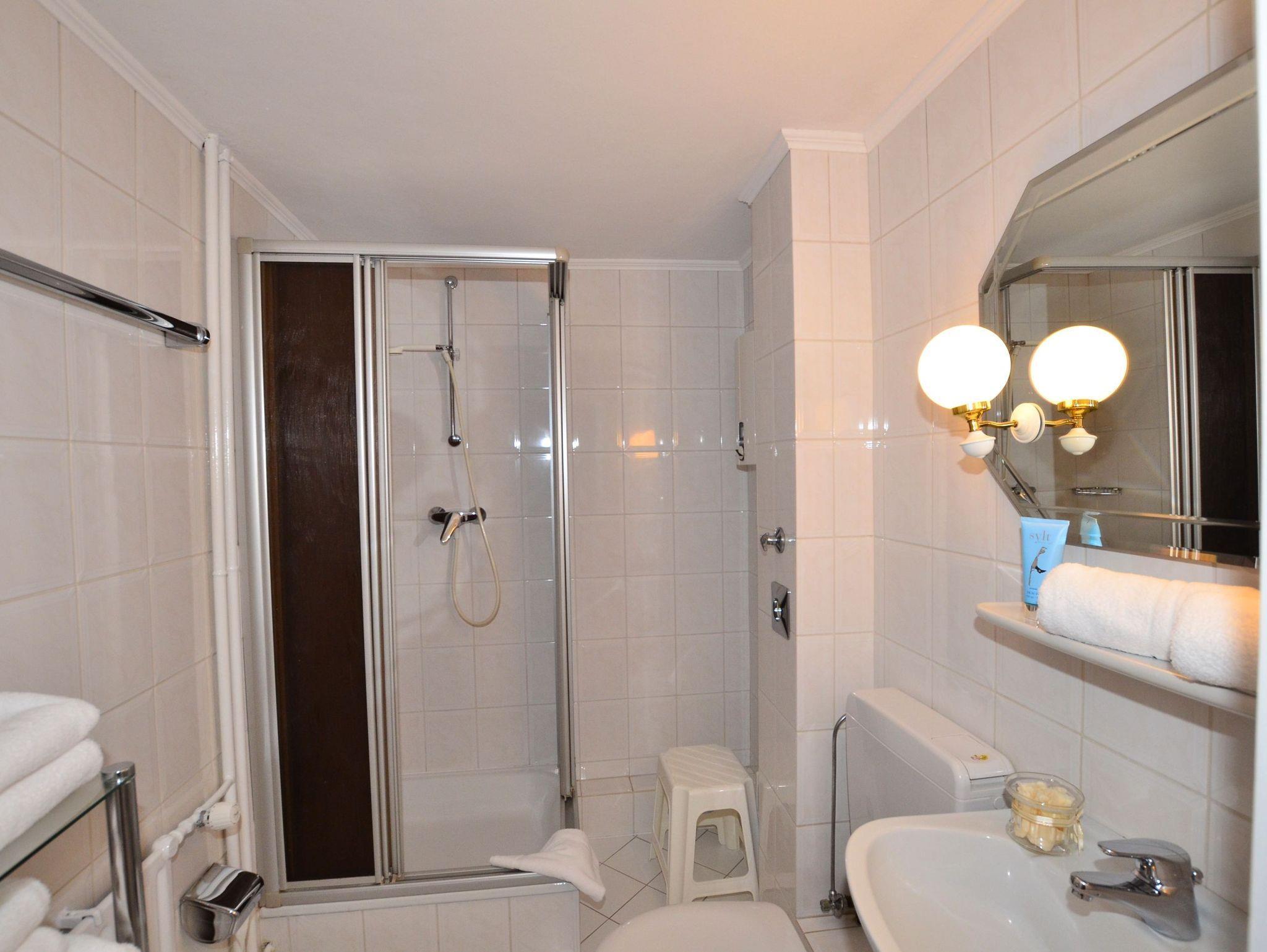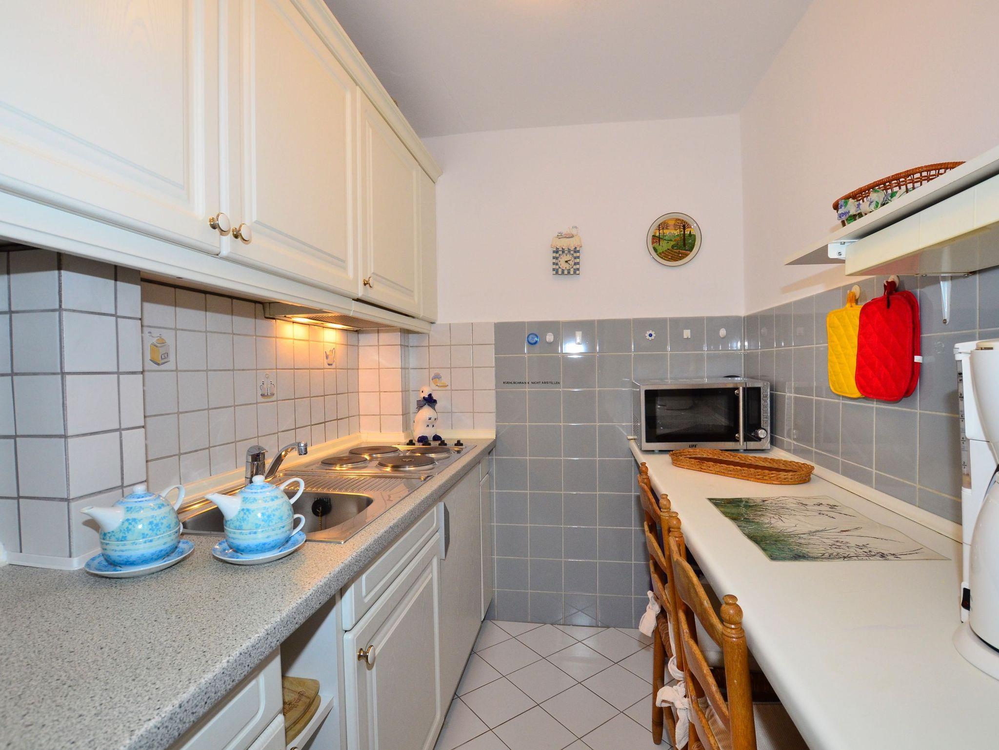 Die separate Küche ist mit Mikrowelle, Kaffeemaschine, Wasserkocher und Toaster gut ausgestattet. Ein funktionales Duschbad mit WC komplettiert das Raumangebot.