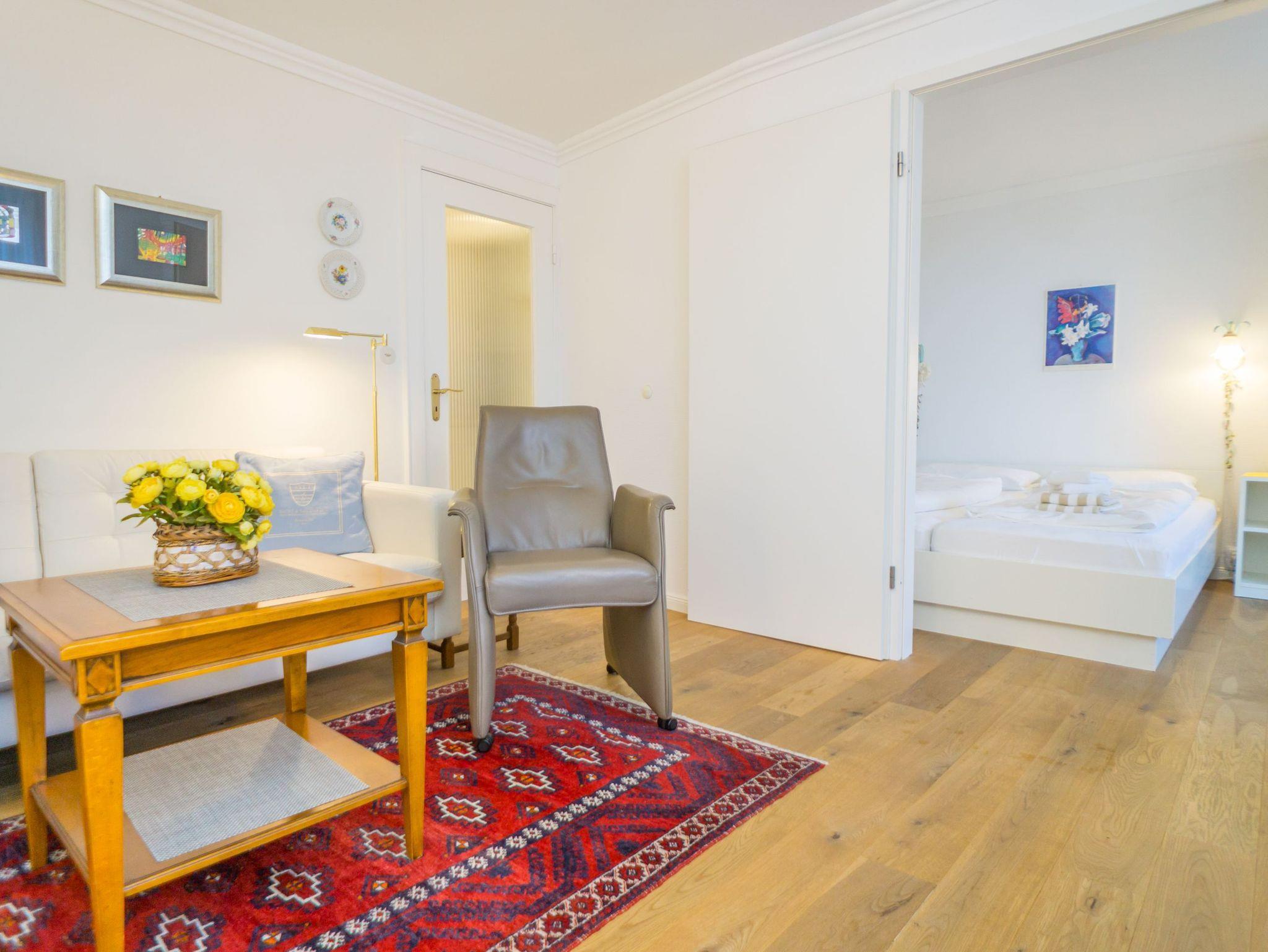 Im separaten Schlafzimmer erwartet Sie ein gemütliches Doppelbett für erholsame Nächte. Der Wohnbereich bietet einen Kabel-TV sowie Zugang zum Westbalkon perfekt, um den Abend bei frischer Nordseeluft ausklingen zu lassen.