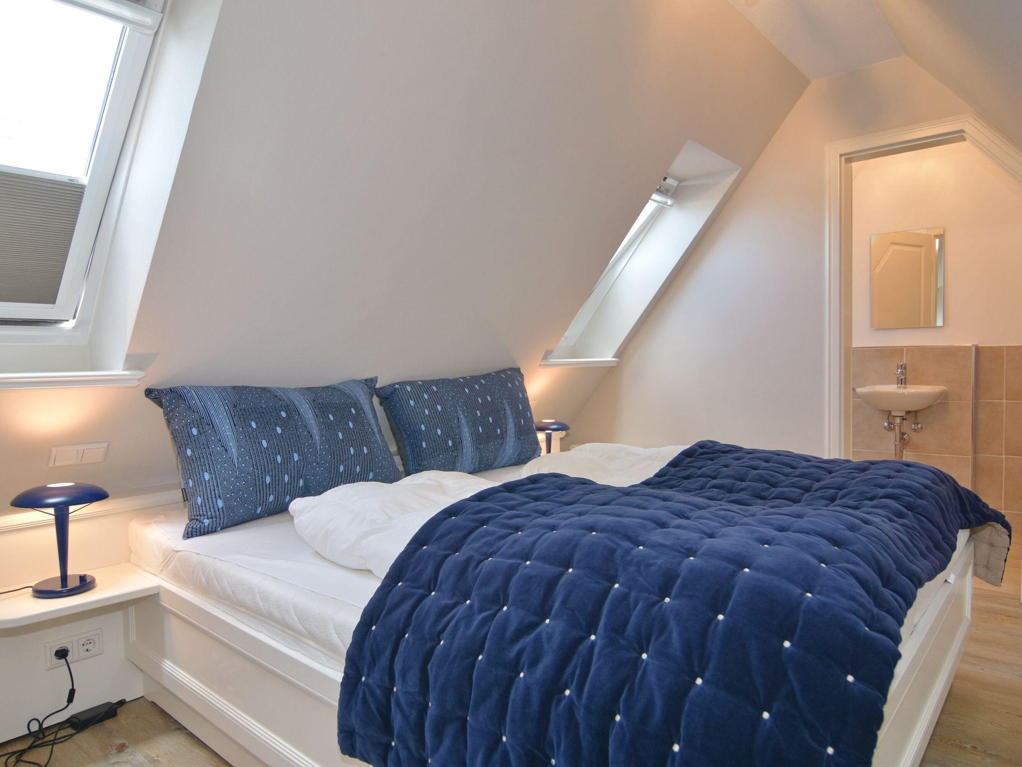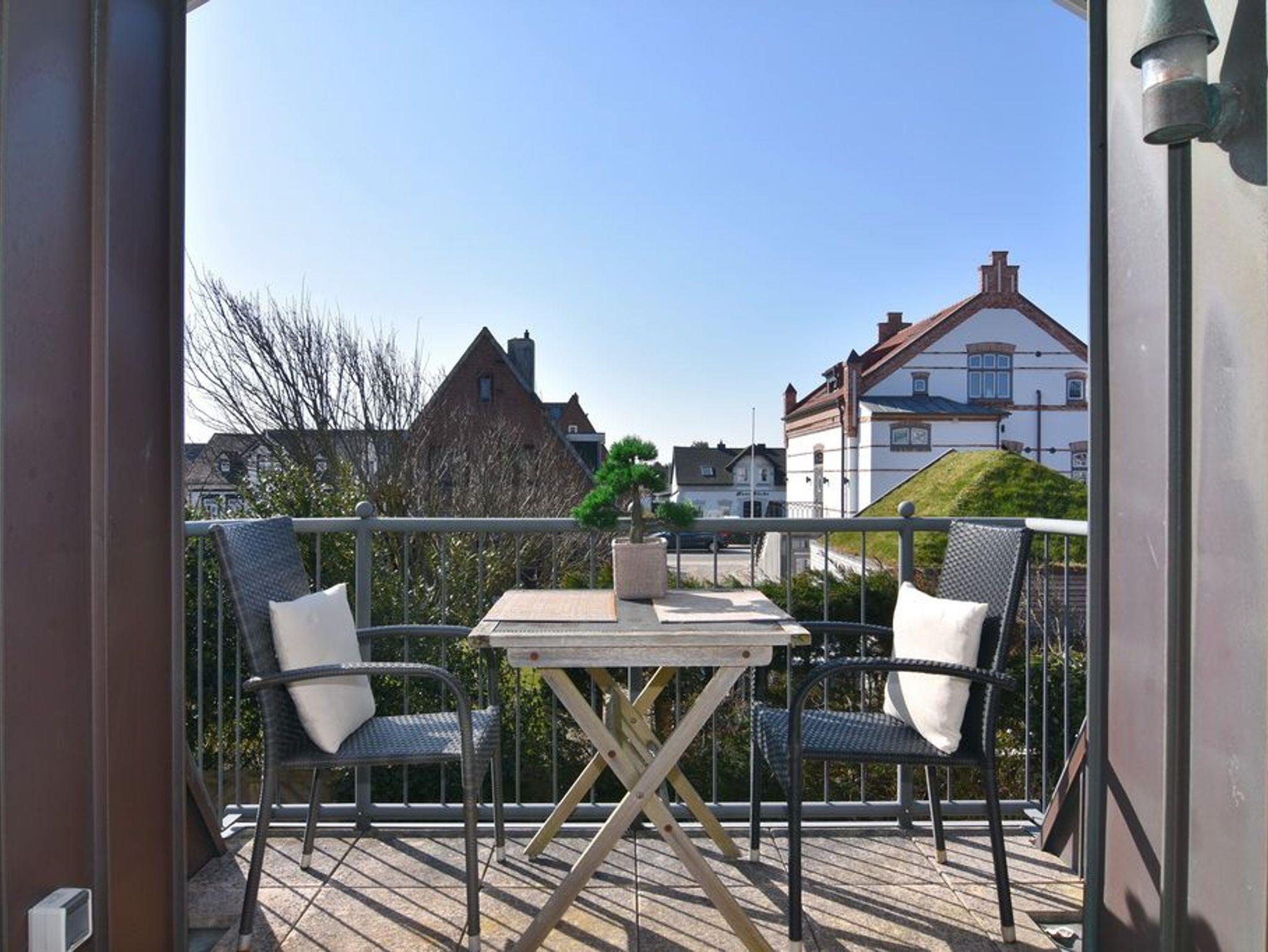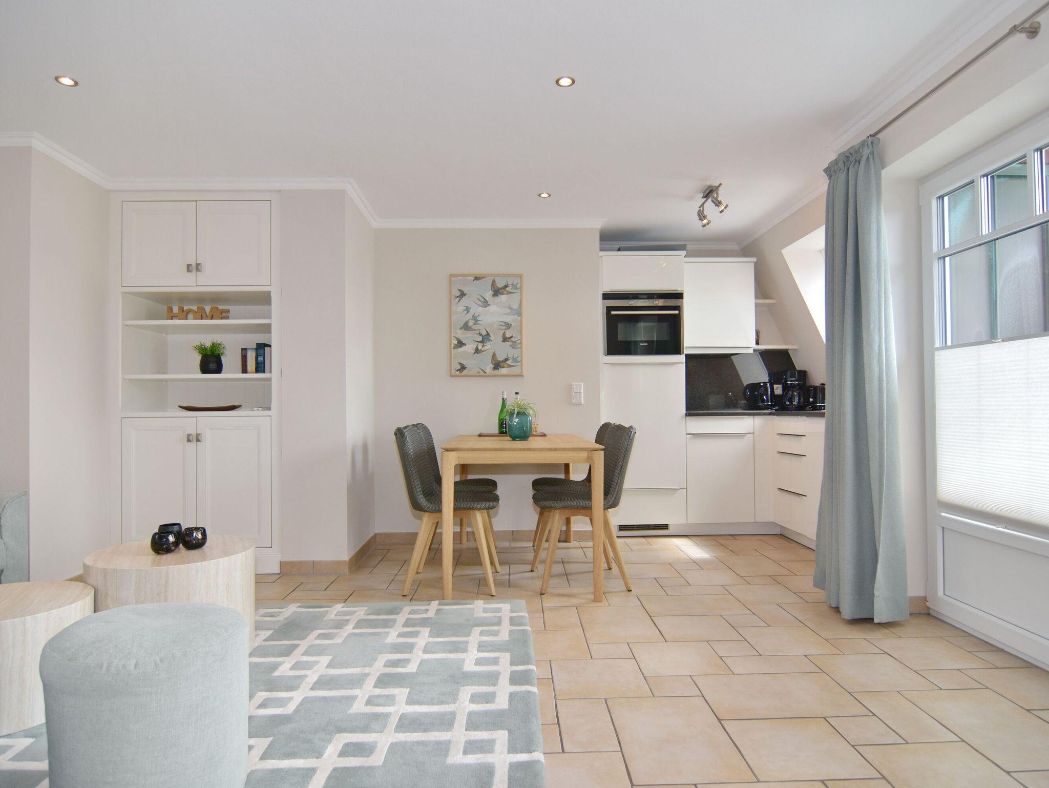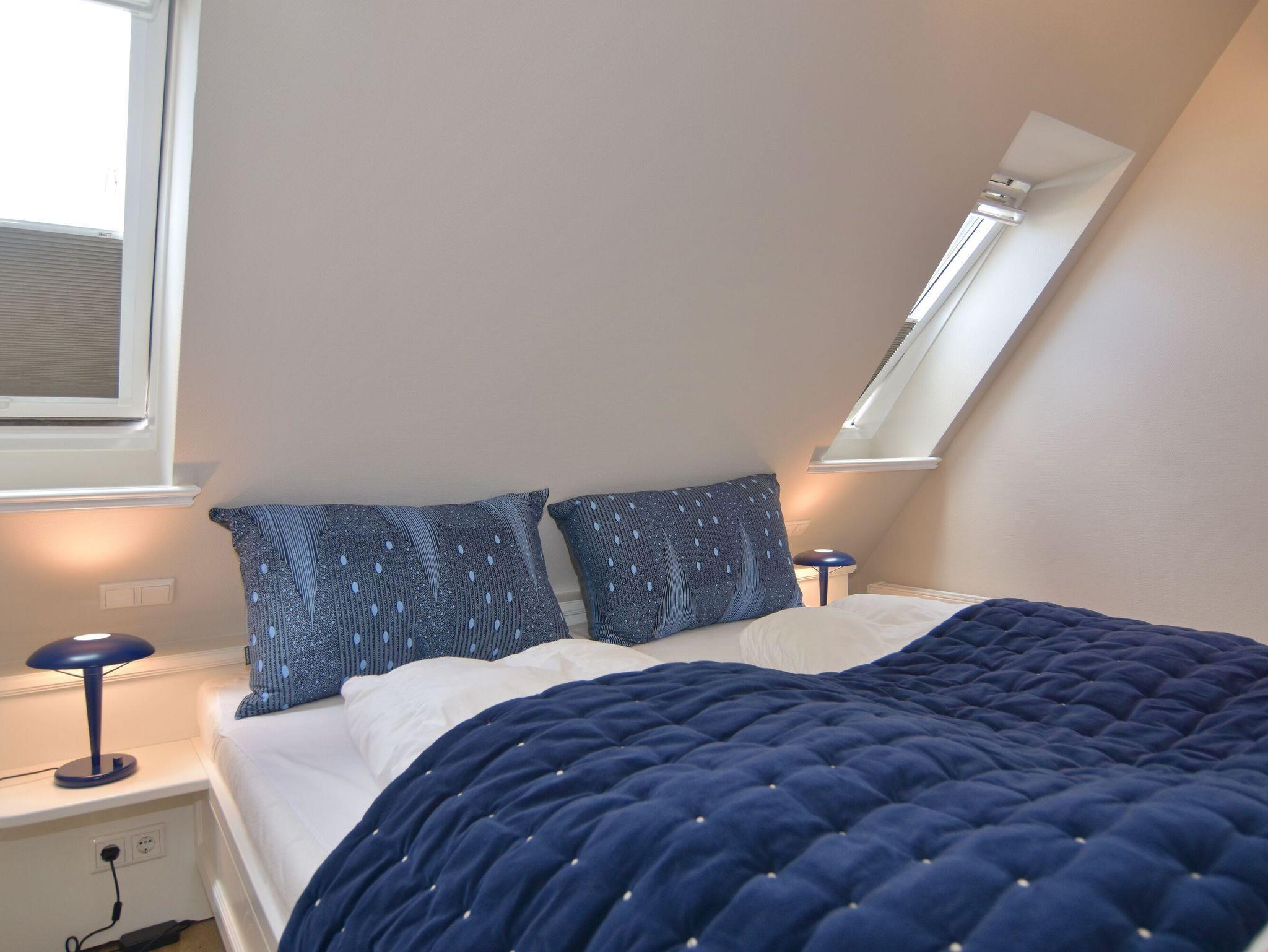Sonniges 2-Zimmer-Apartment im Haus Amerij in erstklassiger Lage am Badestrand, Ca. 55 m², OG/DG, Nichtraucher. OG: Sonniges Wohn-/Esszimmer mit integrierter Küche mit Geschirrspüler, Mikrowelle und Backofen, Ecksofa und Essplatz, TV und DVD, Duschbad/WC, Südbalkon mit Balkonmöbeln. OG ist gefliest. Wasch-/Trocknerkombination, DG: Schlafzimmer mit Doppelbett und Gäste-WC, W-Lan (ohne Gewähr). Pkw-Stellplatz am Haus. Bettwäsche und Handtücher sind zur Anreise aufgezogen. Tierhaltung ist nicht gestattet.