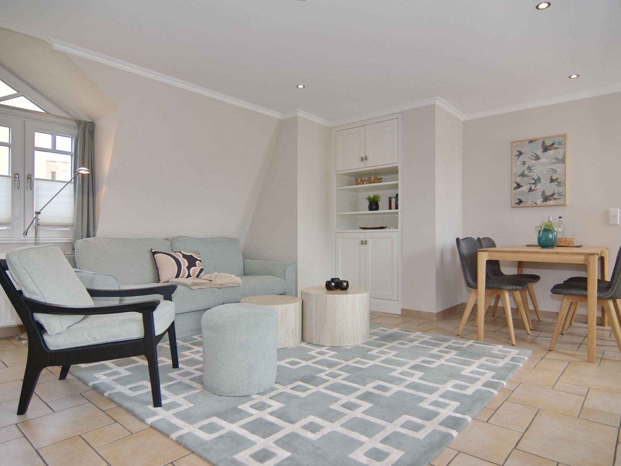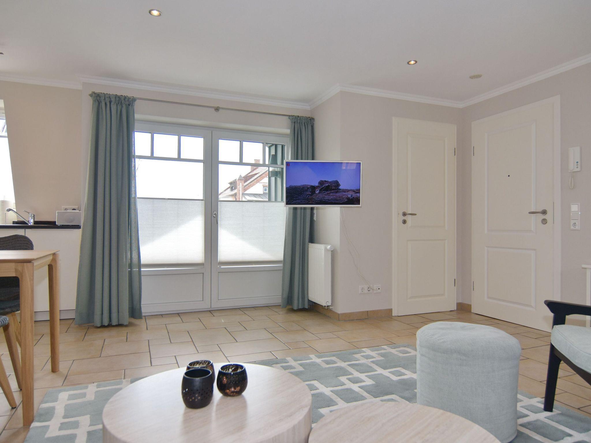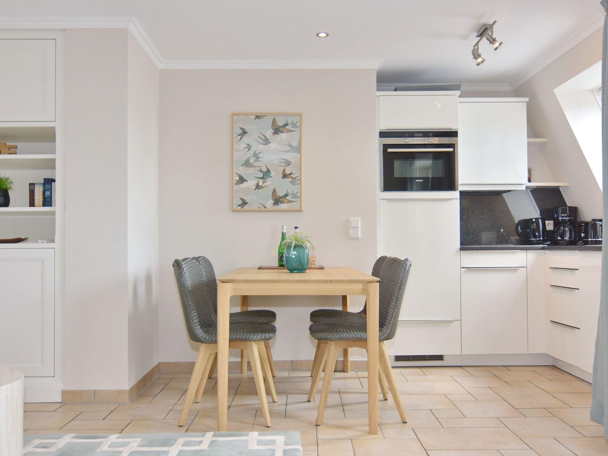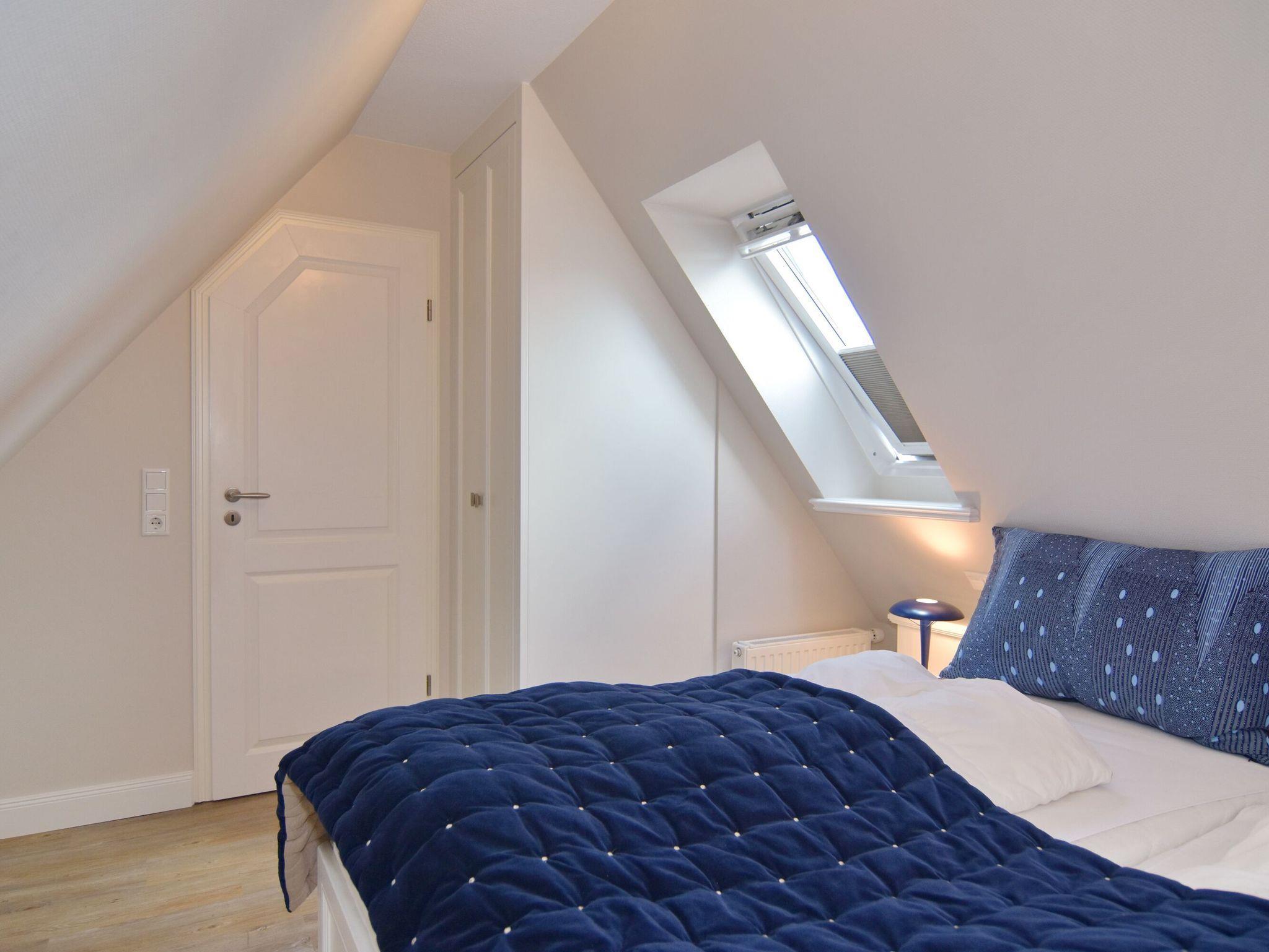 Sonniges 2-Zimmer-Apartment im Haus Amerij in erstklassiger Lage am Badestrand, Ca. 55 m², OG/DG, Nichtraucher. OG: Sonniges Wohn-/Esszimmer mit integrierter Küche mit Geschirrspüler, Mikrowelle und Backofen, Ecksofa und Essplatz, TV und DVD, Duschbad/WC, Südbalkon mit Balkonmöbeln. OG ist gefliest. Wasch-/Trocknerkombination, DG: Schlafzimmer mit Doppelbett und Gäste-WC, W-Lan (ohne Gewähr). Pkw-Stellplatz am Haus. Bettwäsche und Handtücher sind zur Anreise aufgezogen. Tierhaltung ist nicht gestattet.