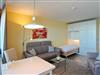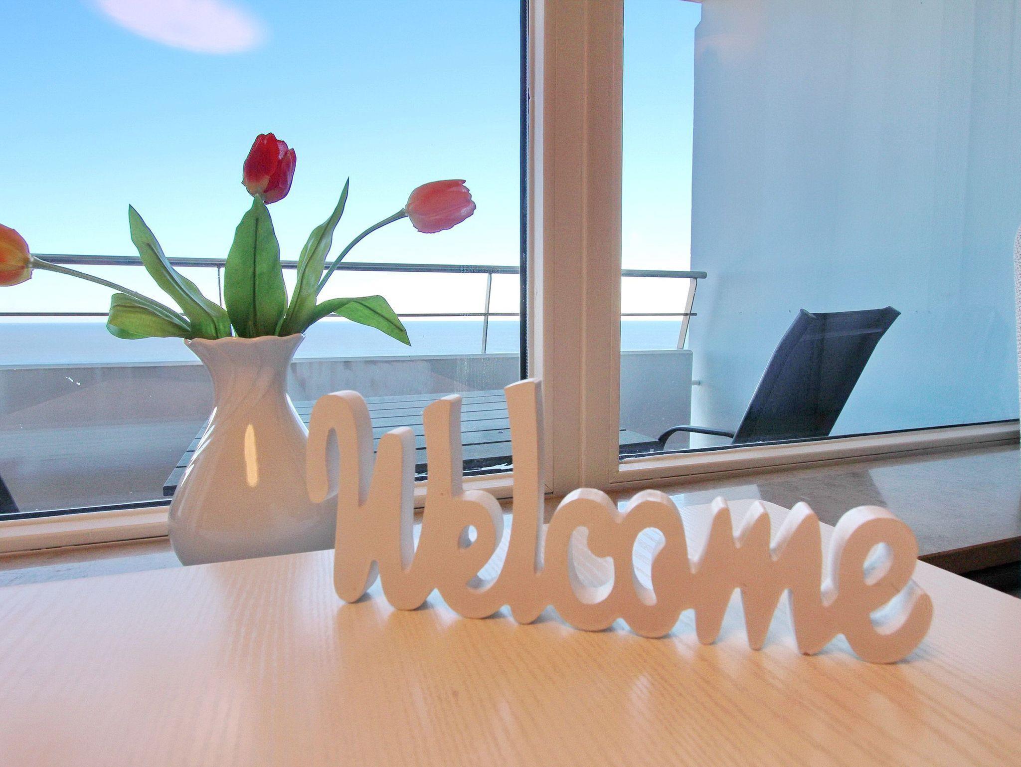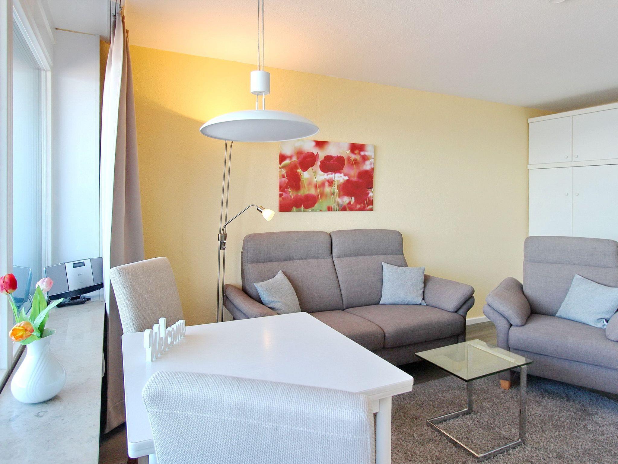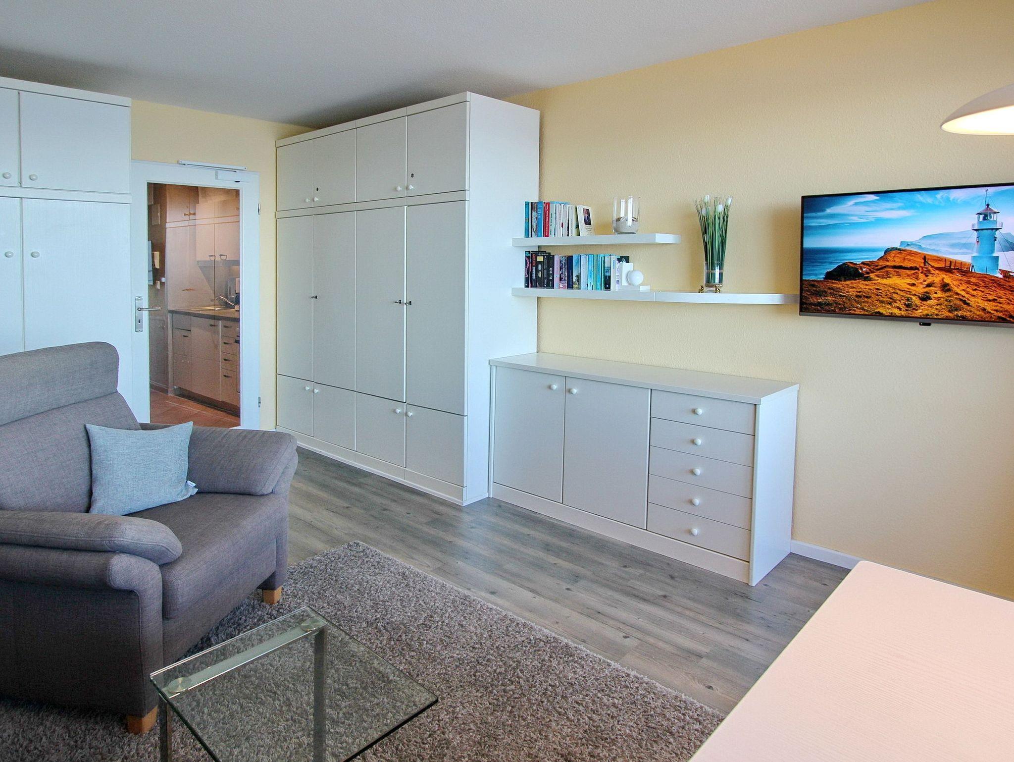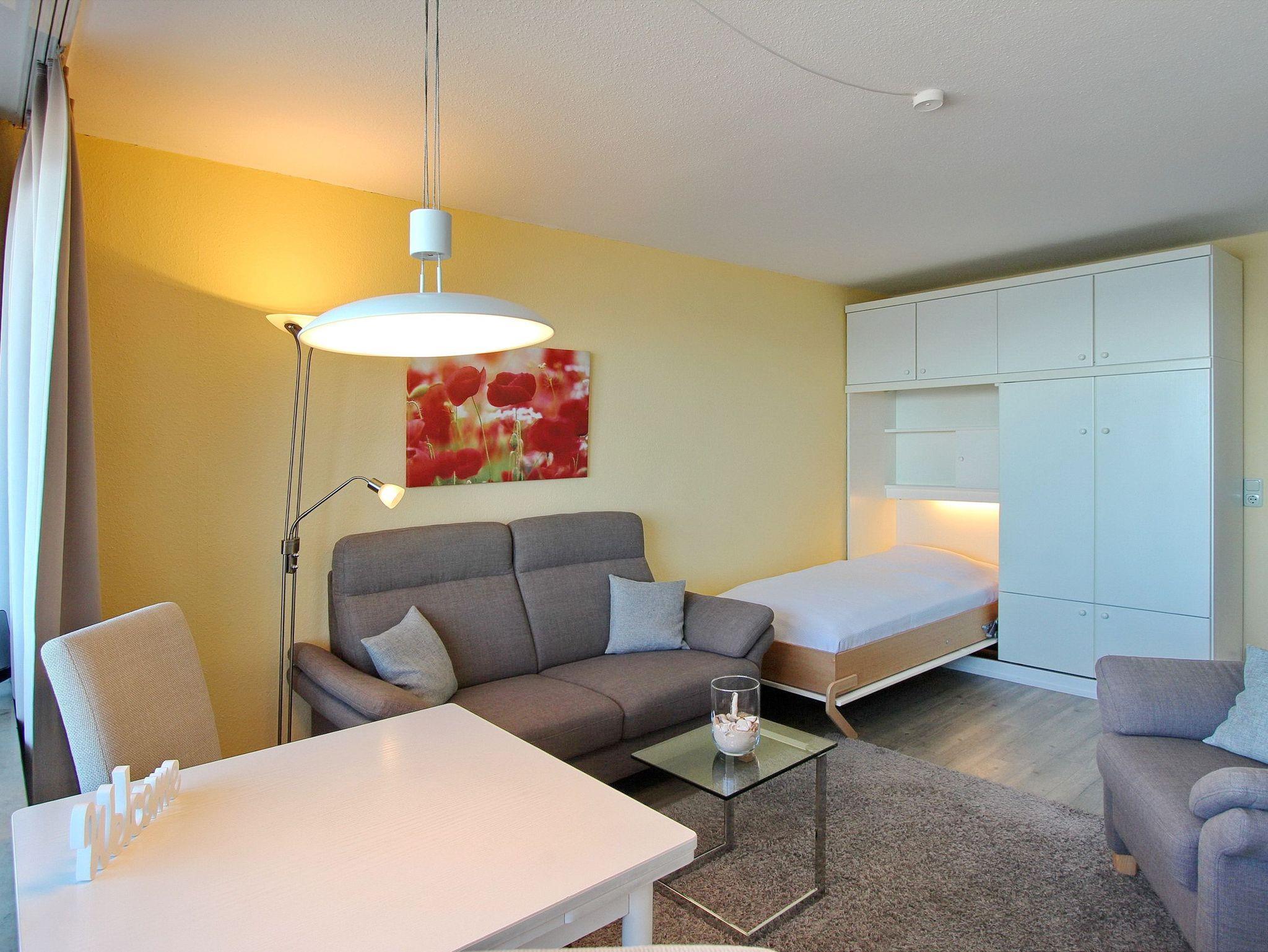 Einen tollen Meeresblick haben Sie aus dieser Einzimmerwohnung in der 8. Etage des Haus Metropol. Der kombinierte Wohn-/Schlafraum mit vorgelagertem Westbalkon (Balkonmöbel mit Kissen sind vorhanden) verfügt über Einzelschrankbetten und einen Essplatz mit 2 Stühlen, der direkt am Fenster steht. In der Wohnung wurde Laminatfußboden verlegt und es gibt eine Couch und einen Sessel. Das Badezimmer hat eine Dusche, Handtuchtrockner und einen Hocker. In der Einbauküche im Flur mit Cerankochfeld und Backofen können sie sich selbst verpflegen. Zur technischen Ausstattung gehört: ein Flachbildfernseher und ein CD Player. Das freie WLAN Netzwerk (WEG Haus Metropol - Passwortfrei - ohne Gewähr) steht ihnen kostenfrei zur Verfügung. Die Wohnungsgröße dieser Nichtraucherwohnung beträgt: ca. 34 m².