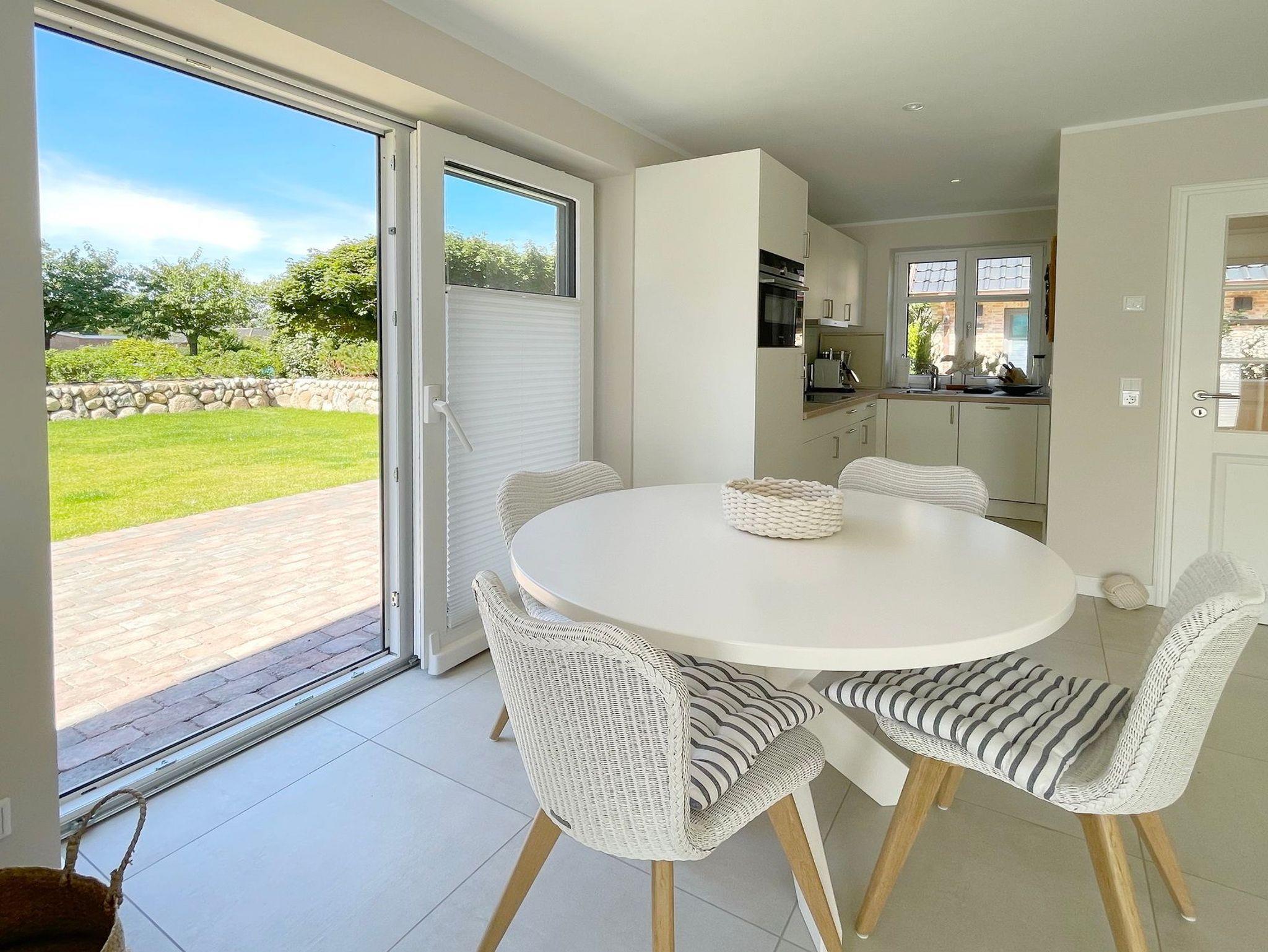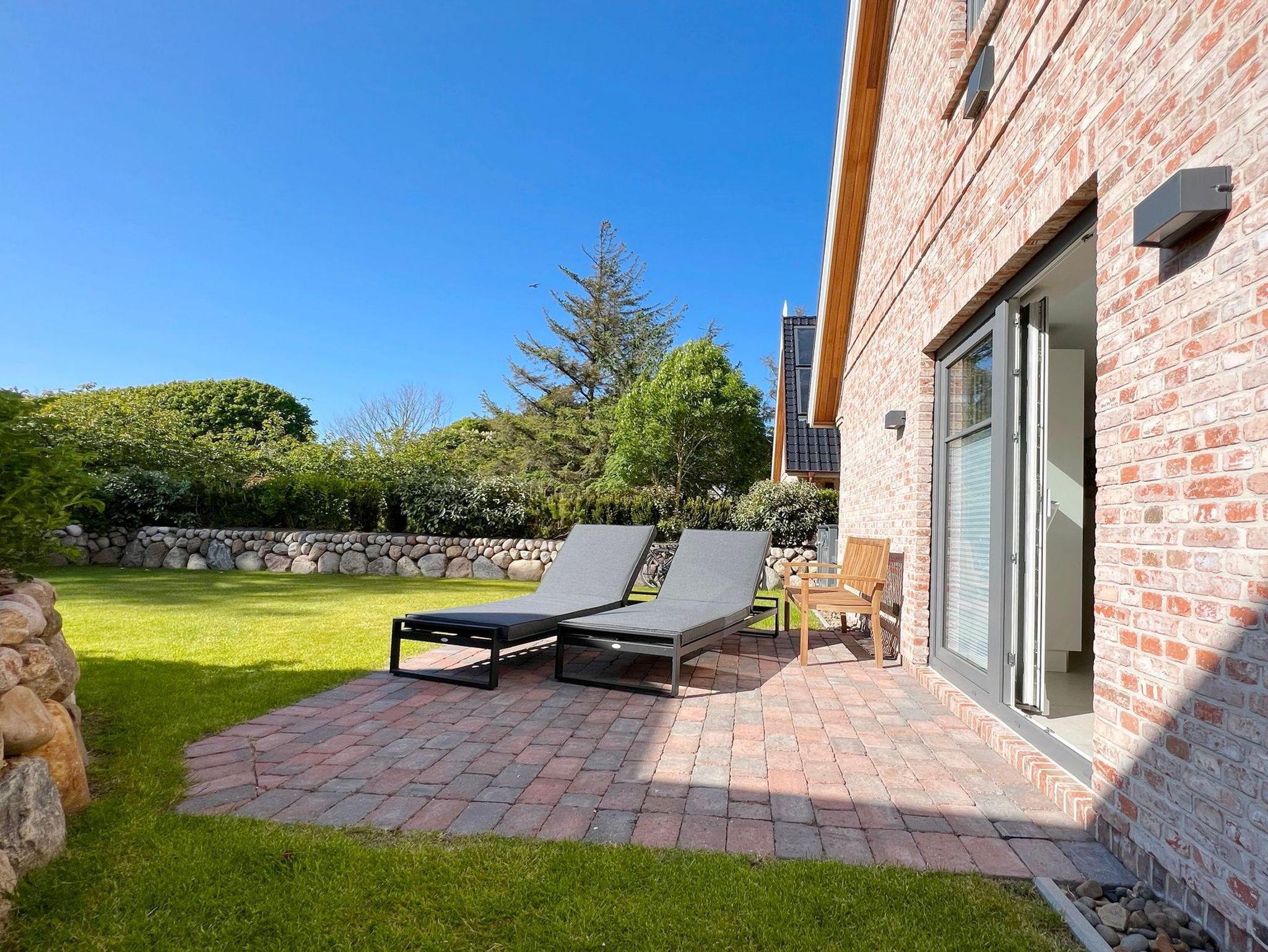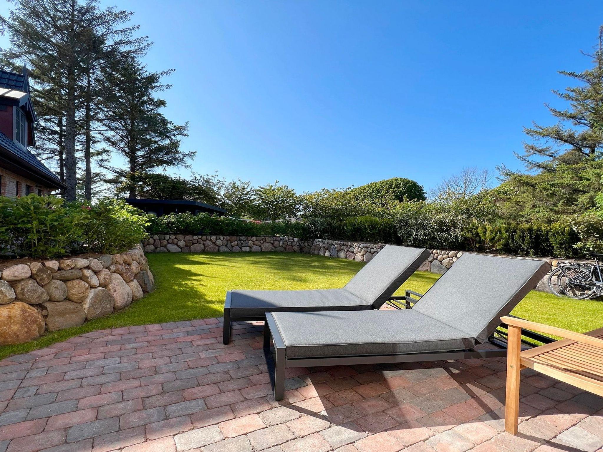 Zwei Terrassen ( Süden und Westen ) mit bequemen Gartenmöbeln und Saisonstrandkorb bieten an sonnigen warmen Tagen genug Platz, um den Urlaub auch im Garten zu genießen.