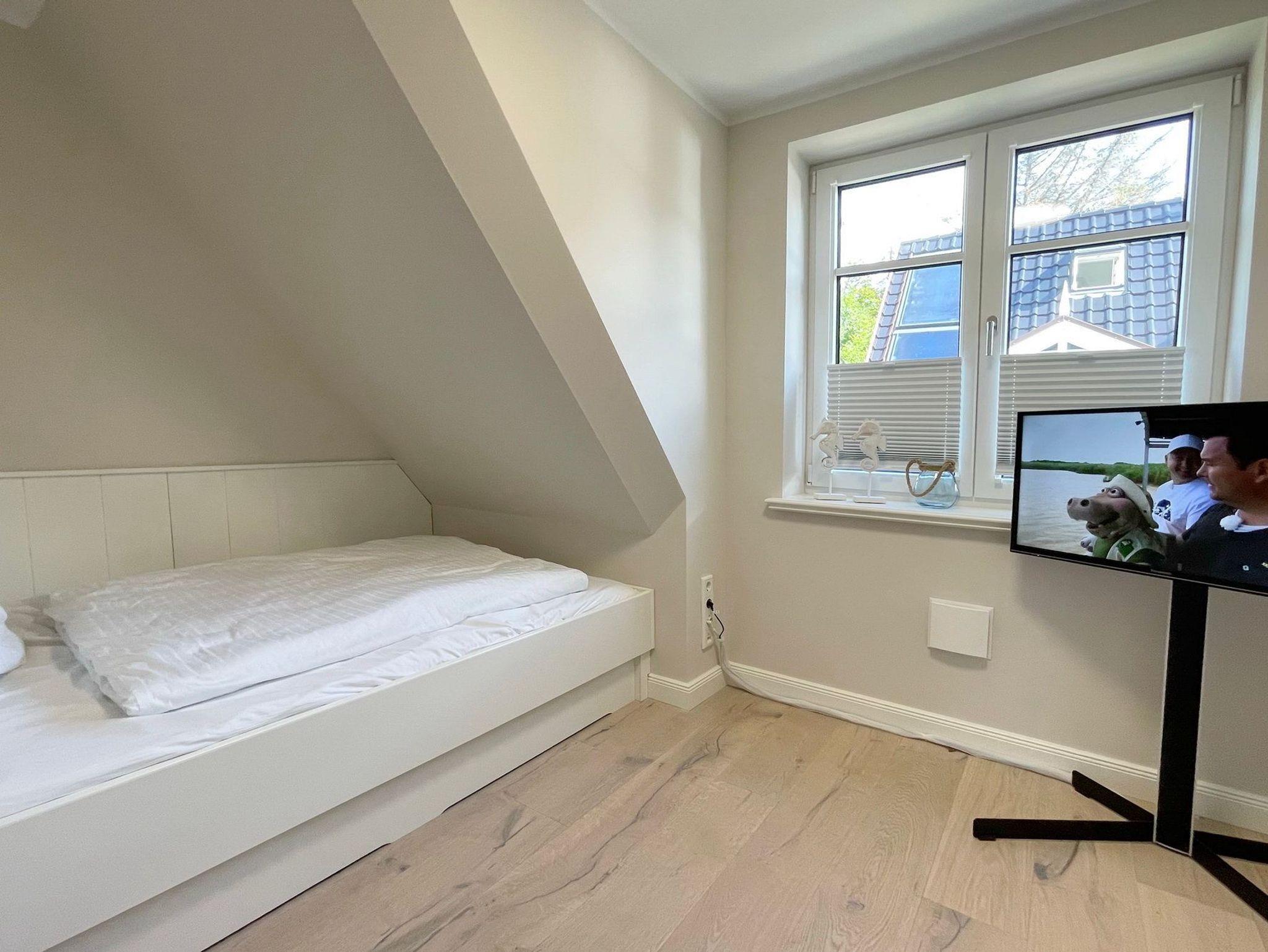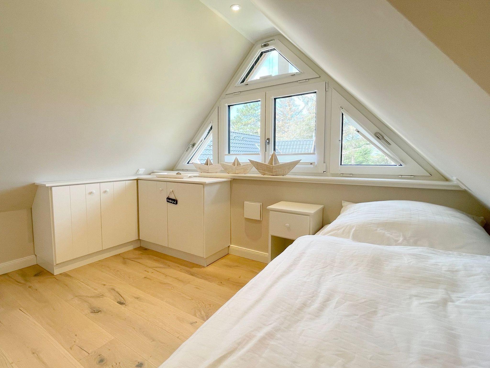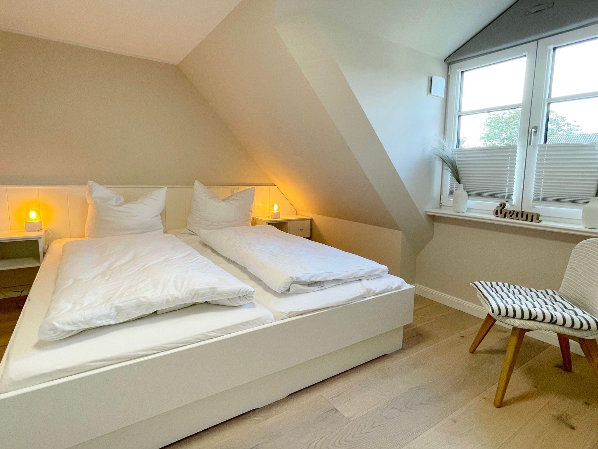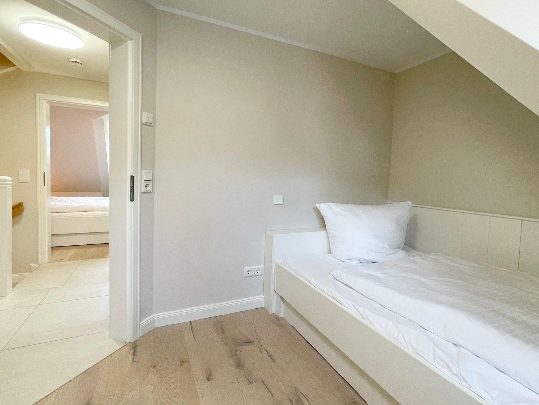 OG: 1 Schlafzimmer mit Doppelbett, 1 Schlafzimmer mit Einzelbett und ein modernes Duschbad. Zusätzlicher Raum im SB mit weiterer Schlafmöglichkeit.
