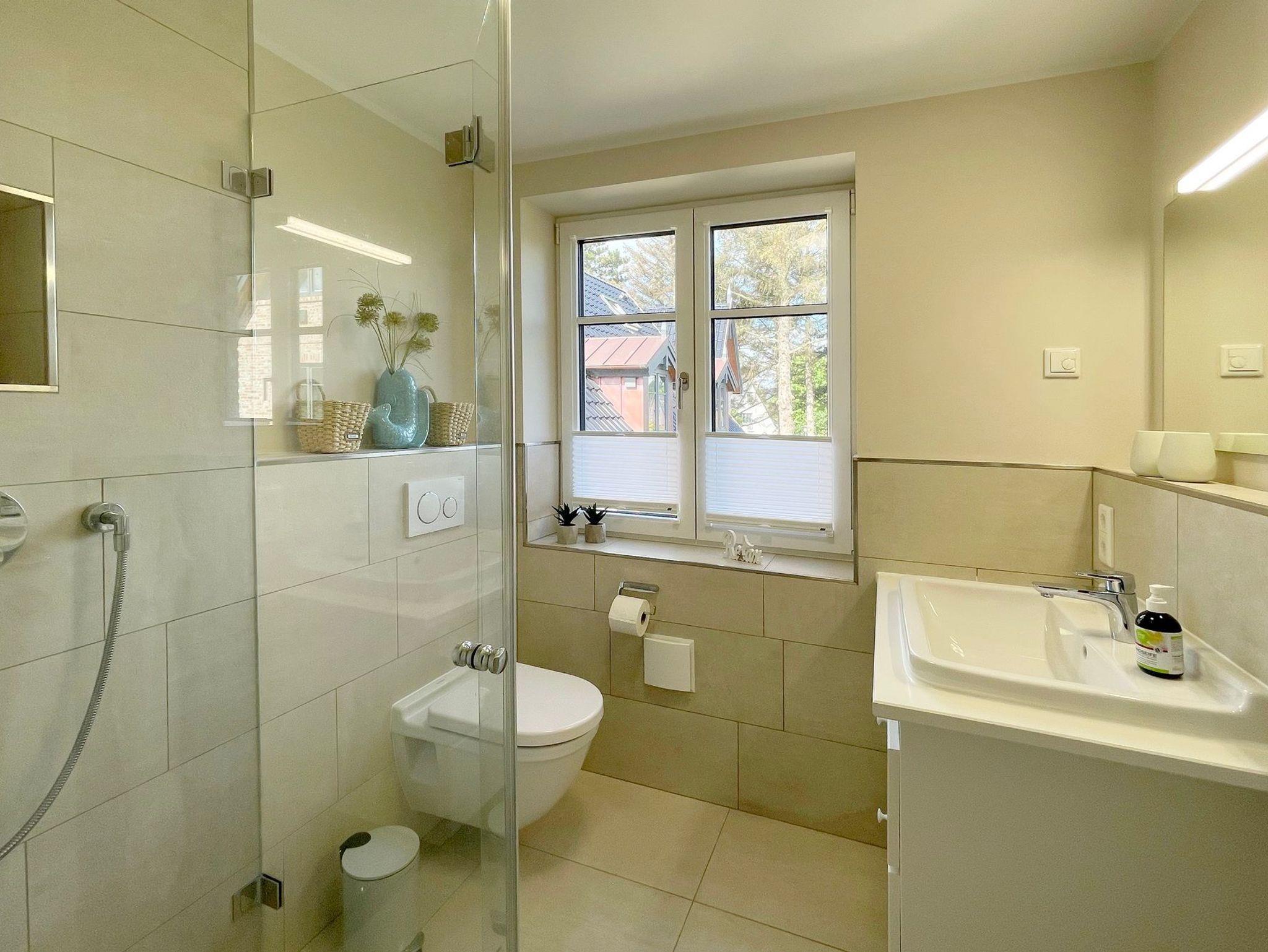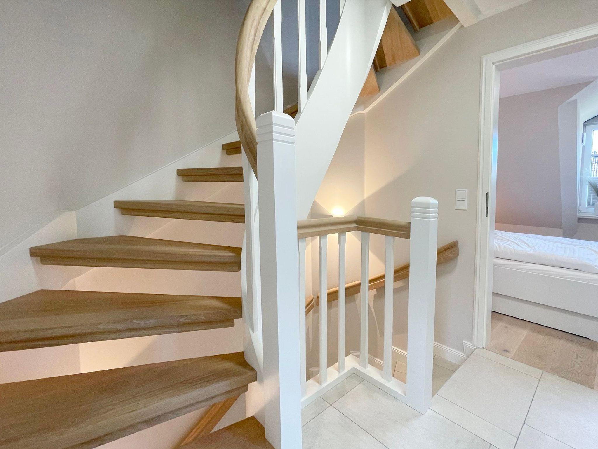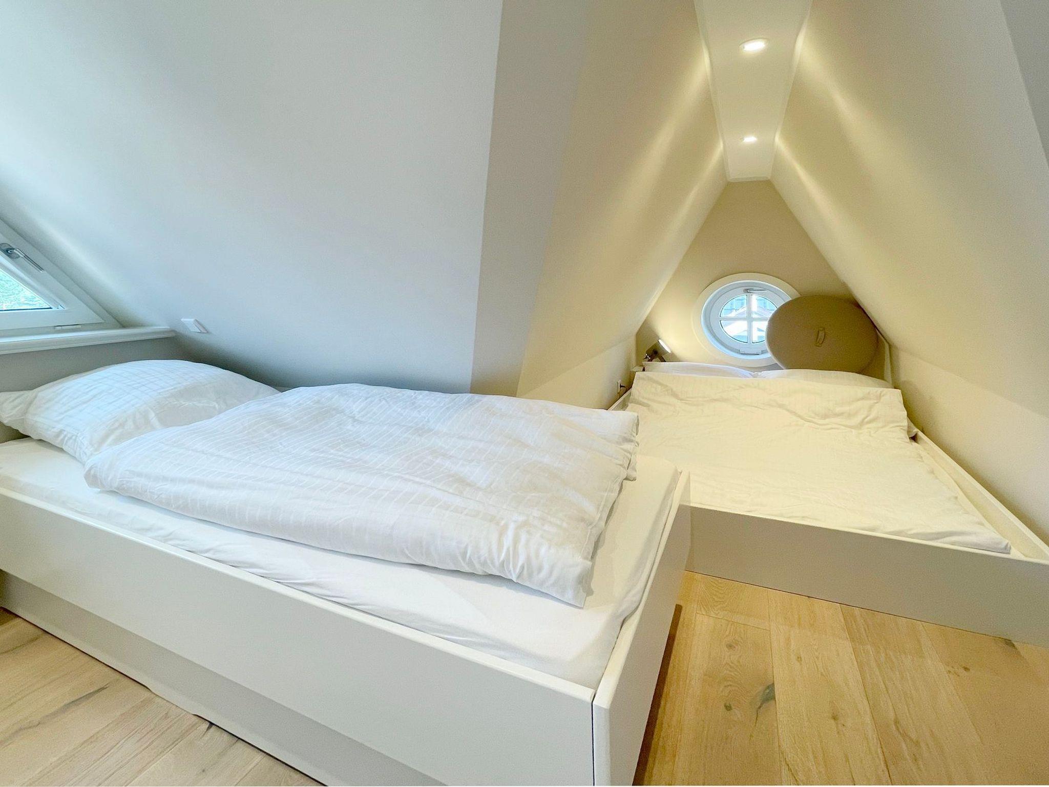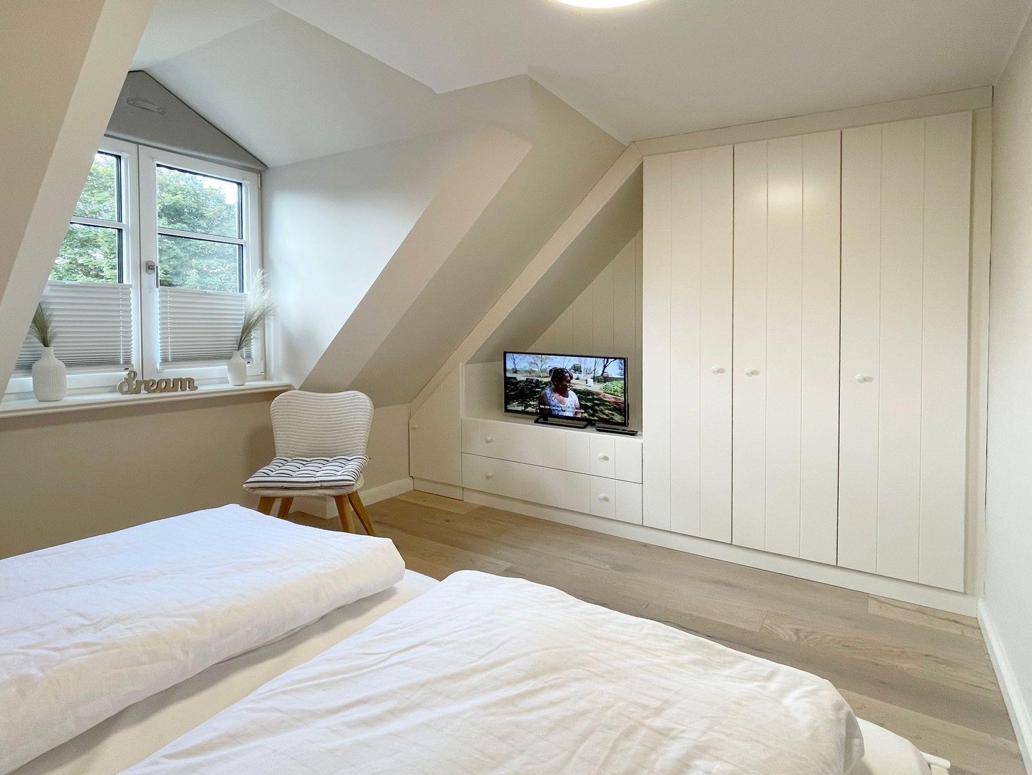 OG: 1 Schlafzimmer mit Doppelbett, 1 Schlafzimmer mit Einzelbett und ein modernes Duschbad. Zusätzlicher Raum im SB mit weiterer Schlafmöglichkeit.