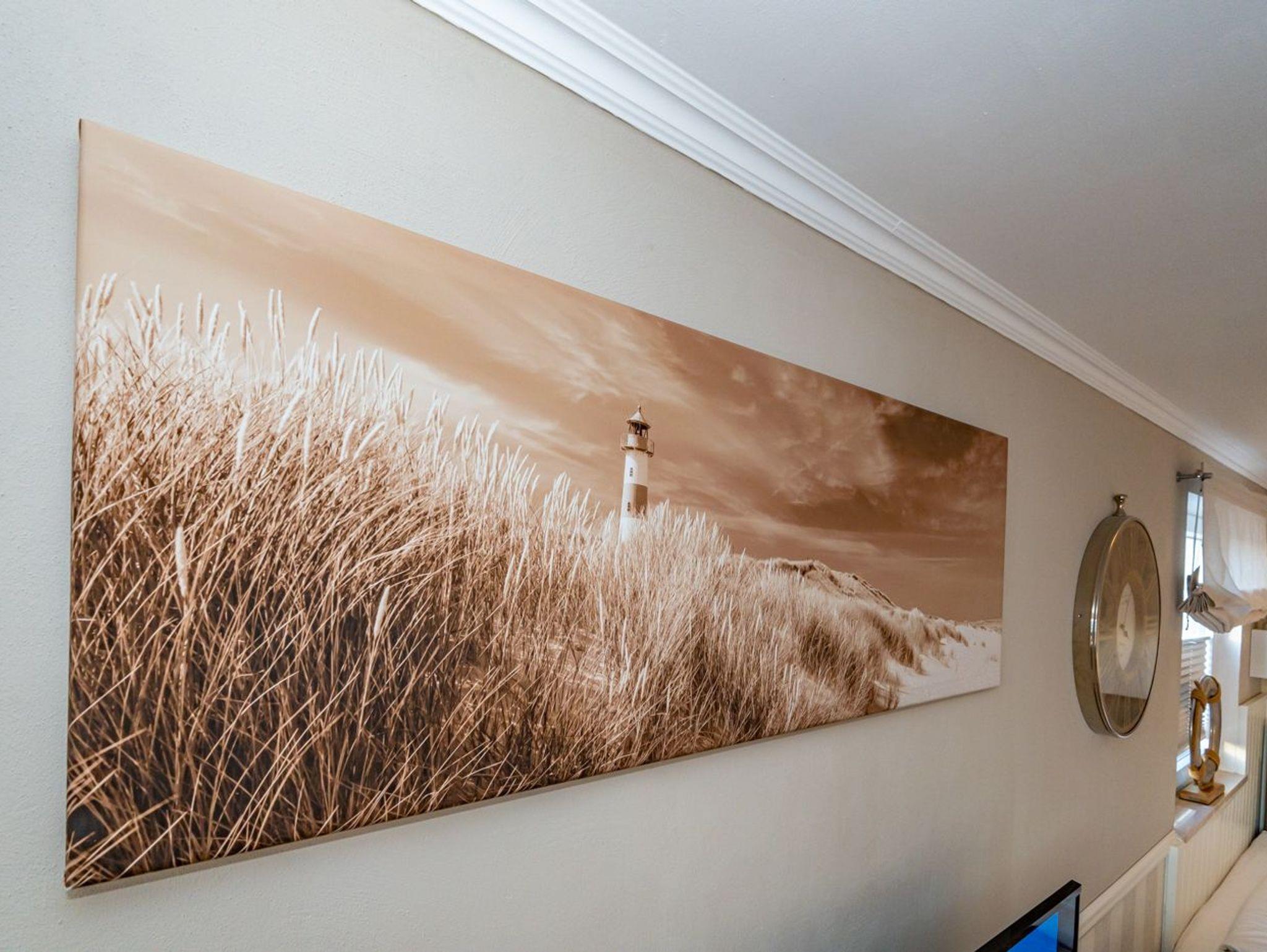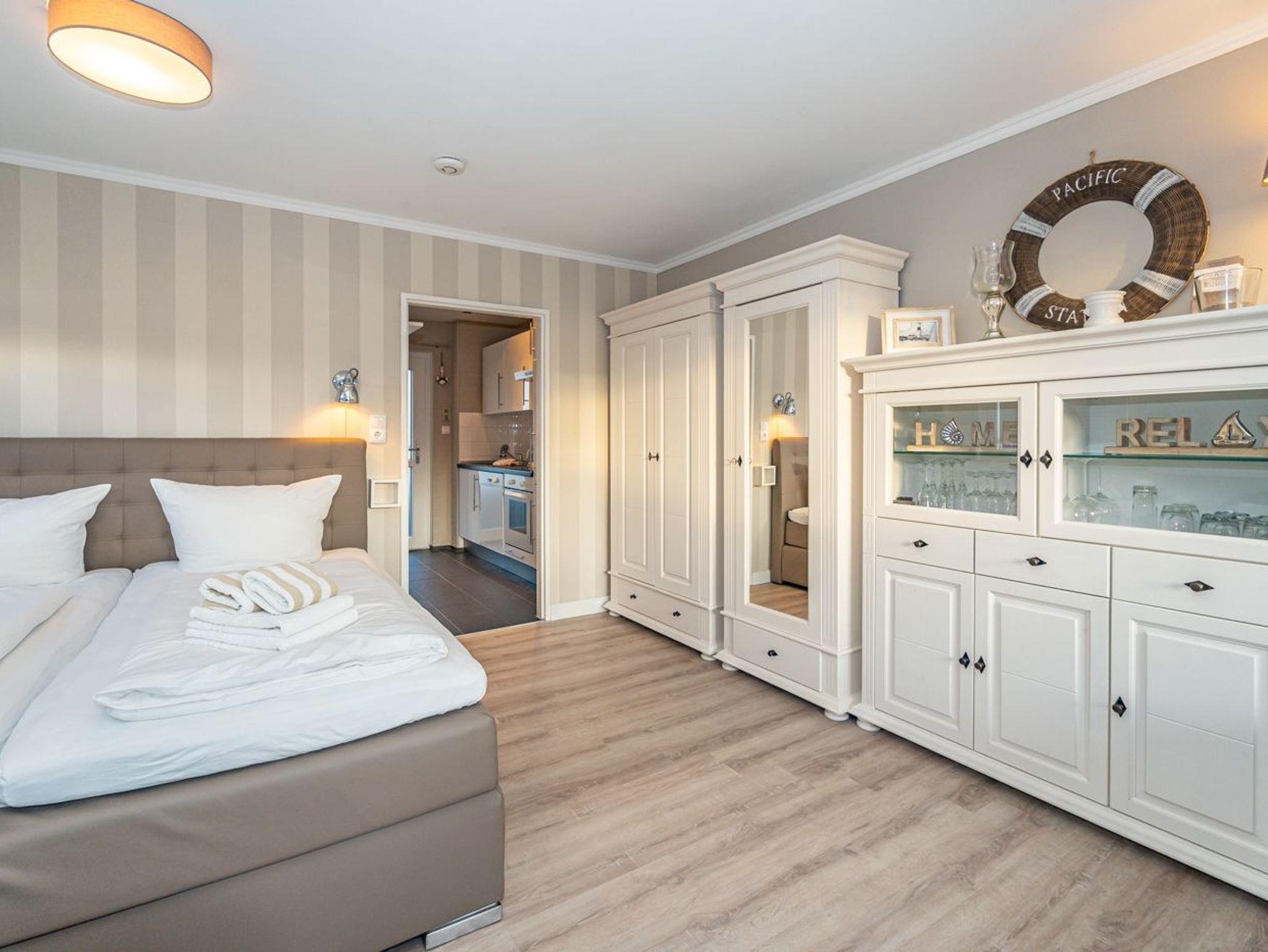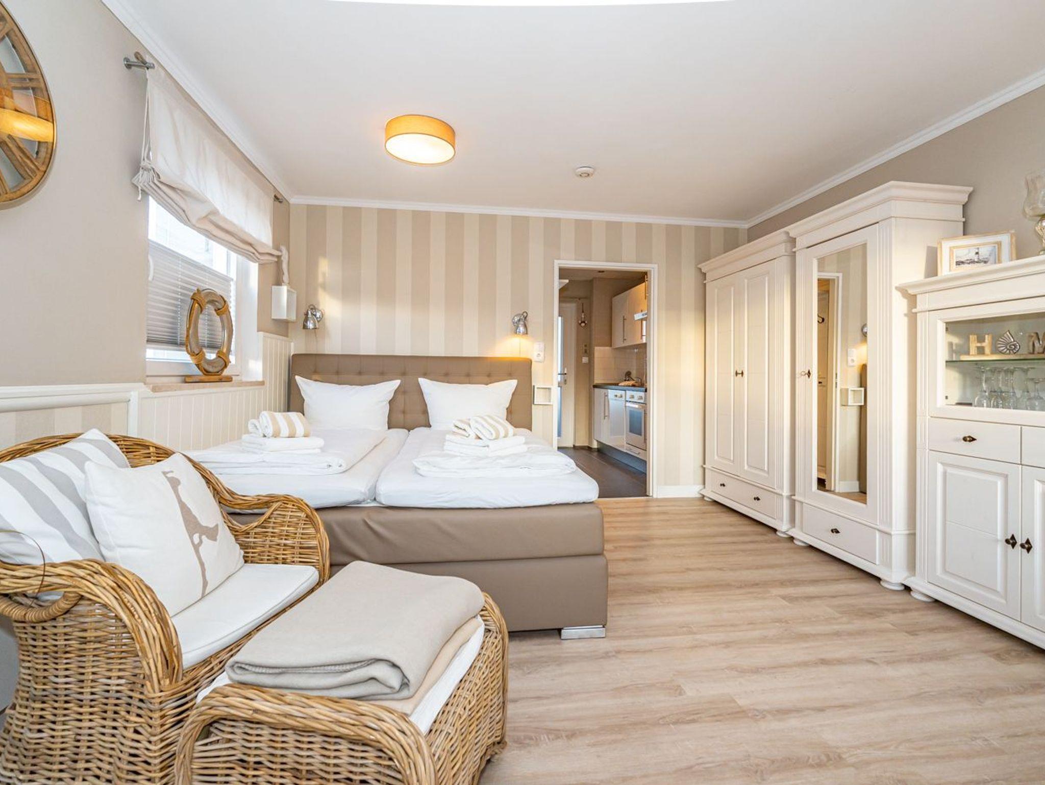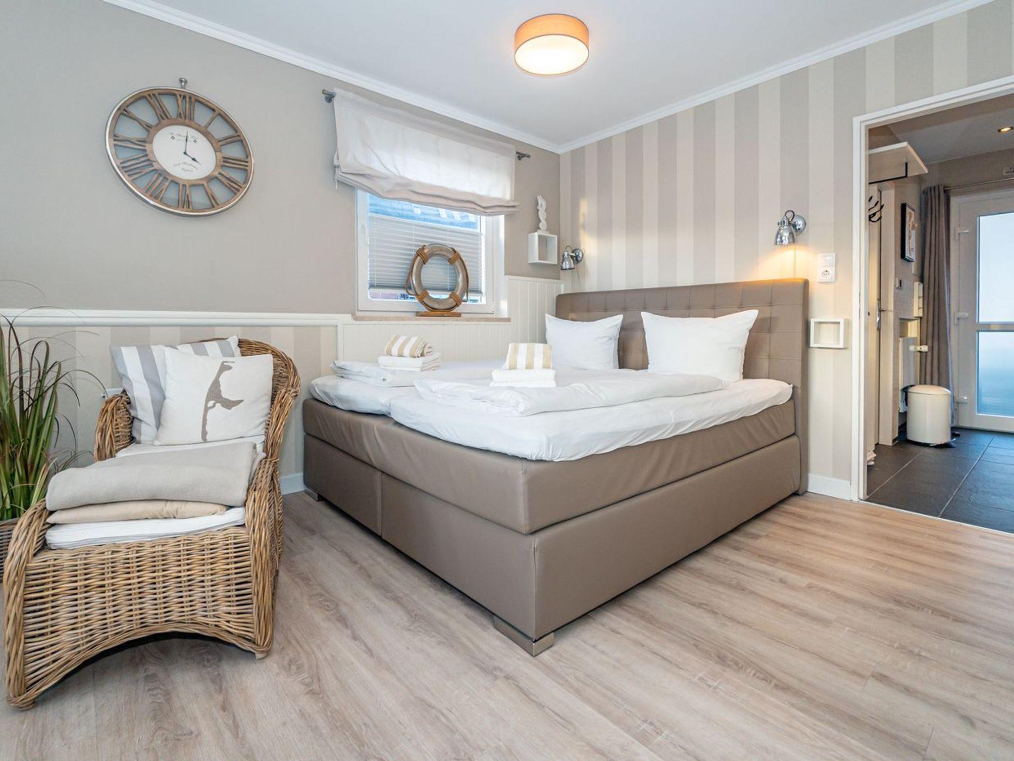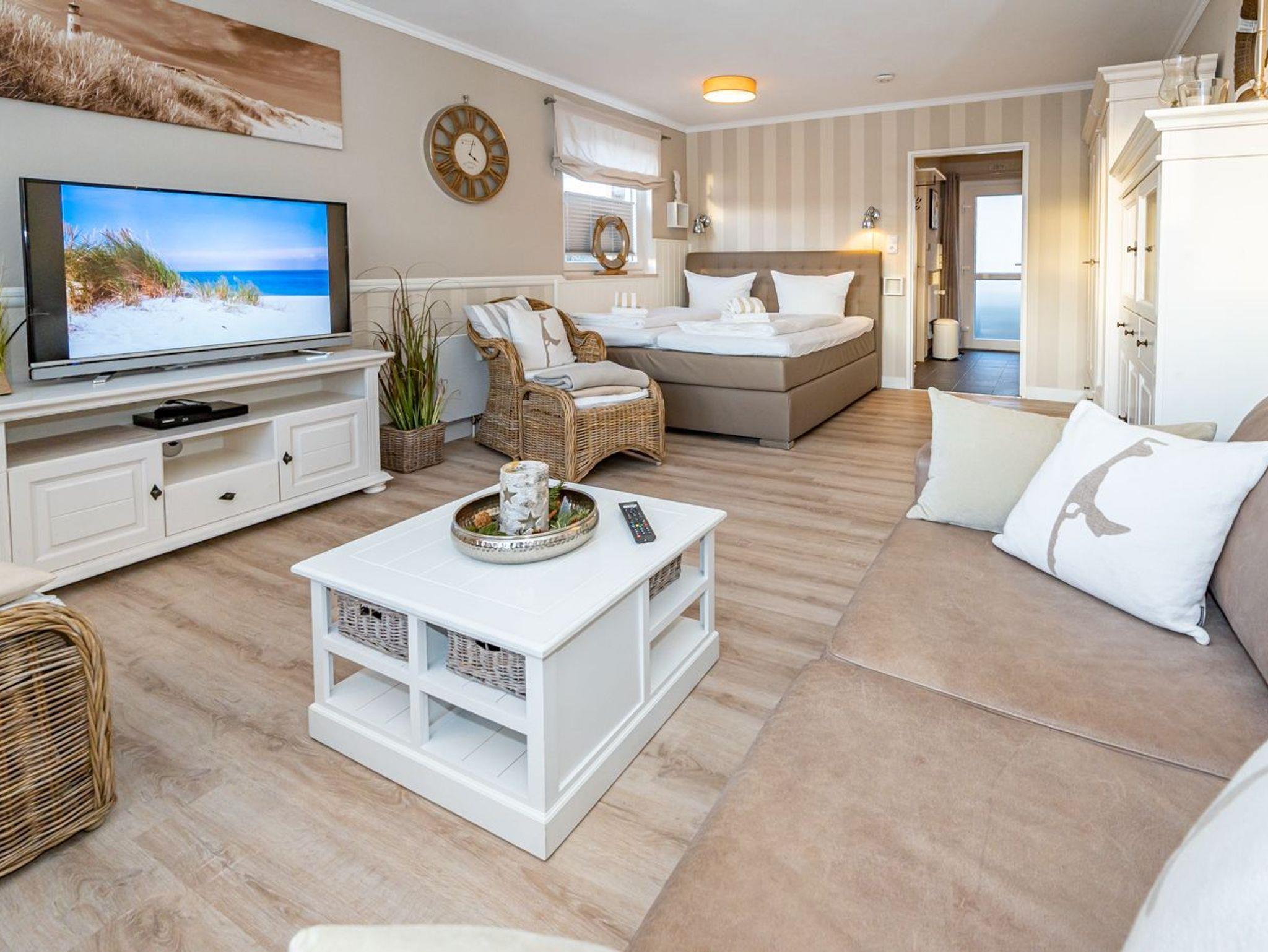 Im kombinierten Wohn-/Schlafraum lässt die Ausstattung mit 49-Zoll-Flachbild-TV, Radio, DVD- und BluRay-Player, CD-Player, MP3-Player, Bluetooth-Lautsprecher keine Wünsche offen. Des Weiteren sorgt ein hochwertiges Boxspringbett (durchgehender Topper ca. 1,80 x 2,00 Meter) für traumhaften Schlafkomfort, Dünenblick inklusive.