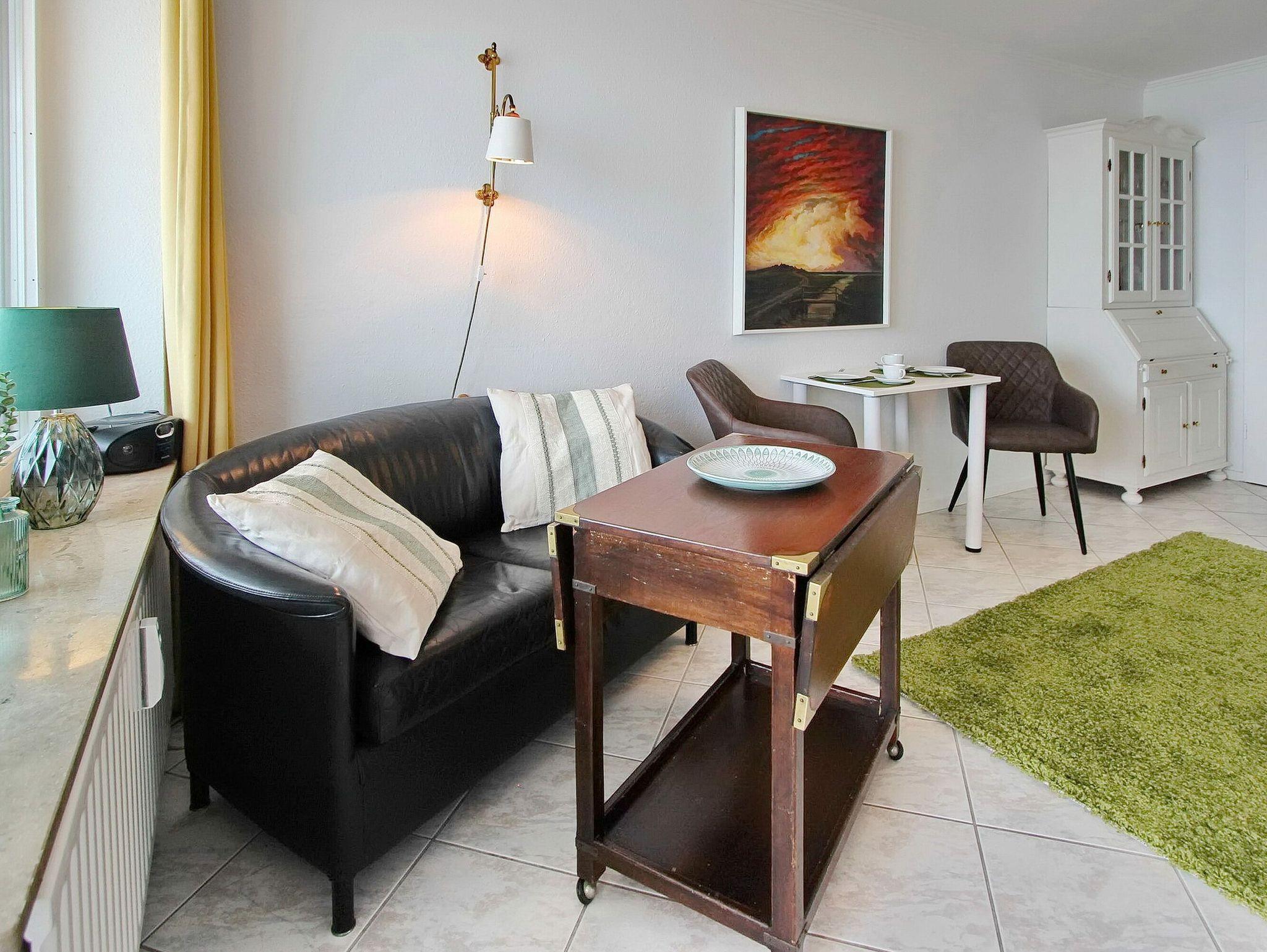 Gemütliche Einzimmerwohnung mit herrlichem Ausblick über den Strand und das Meer im Haus Metropol in der 5. Etage. Der kombinierte Wohn-/Schlafraum mit vorgelagertem Westbalkon (Balkonmöbel inkl.) verfügt über ein Doppelschrankbett, eine Ledercouch und einen Esstisch mit 2 Stühlen. Im Badezimmer gibt es eine Dusche (Fön ist ebenfalls vorhanden) und in der Küchenzeile im Flur mit Ceranfeld und zusätzlicher Nespressomaschine können sie sich selbst verpflegen. Zur technischen Ausstattung dieser Wohnung gehört: ein Smartfernseher von Panasonic und ein Bluetoothdockingstation mit Handyladestation. Ein freies WLAN Netzwerk (WEG Haus Metropol - Passwortfrei - ohne Gewähr) steht Ihnen kostenfrei zur Verfügung. Diese Nichtraucherwohnung hat eine Größe von ca. 25 m².