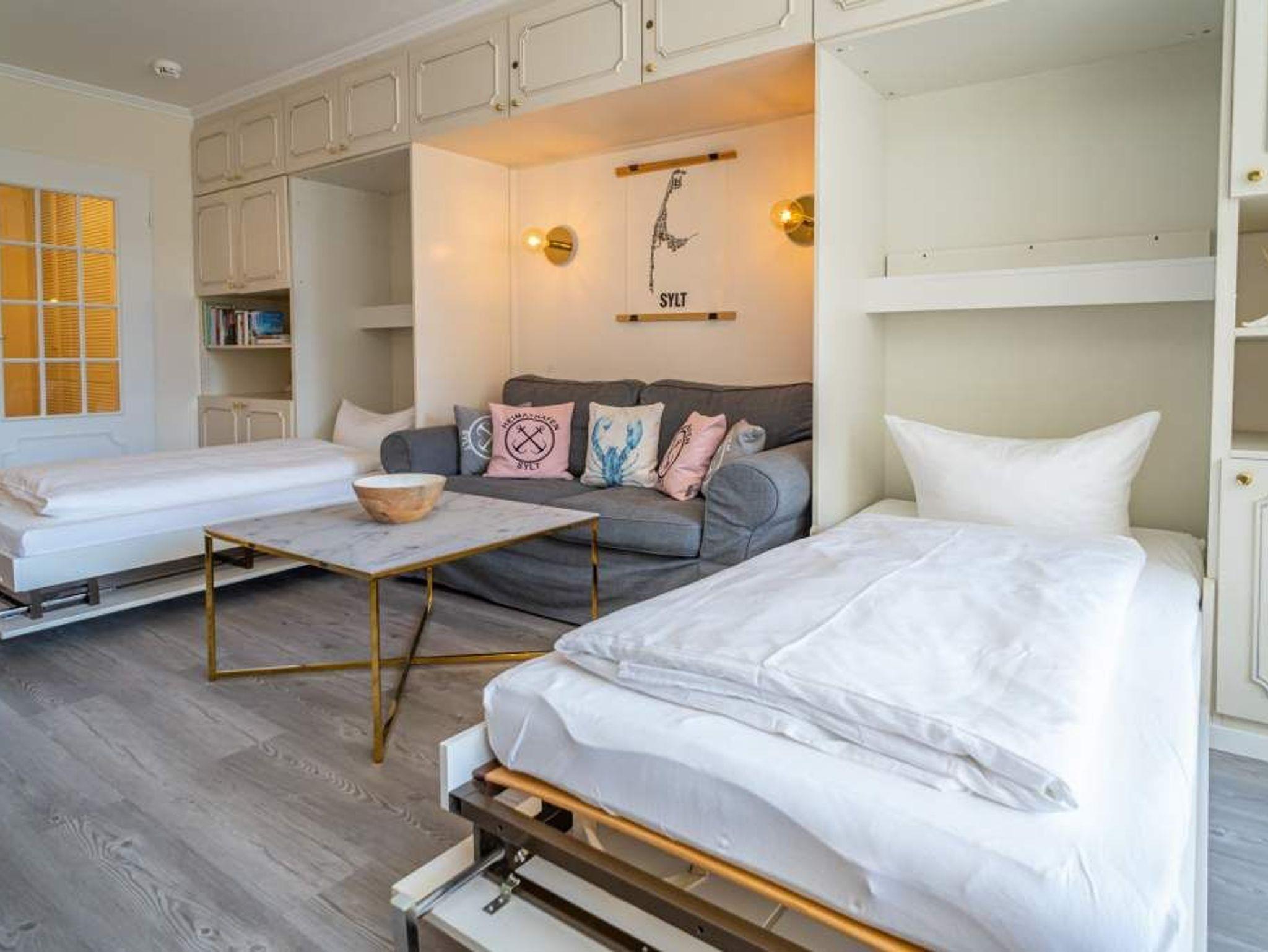In der Schlafnische (mit Glasschiebetür von der Diele getrennt) befindet sich ein Etagenbett (je 0,90 m x 2,00 m).