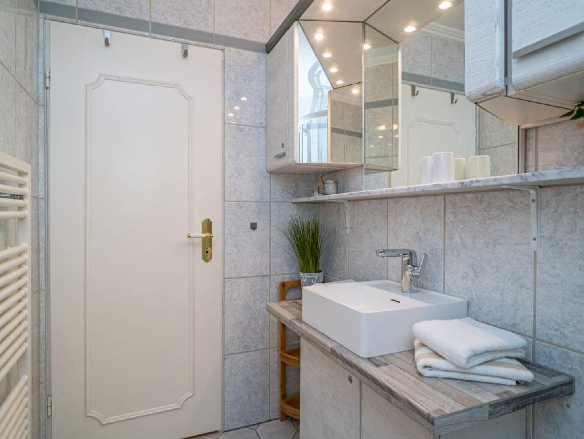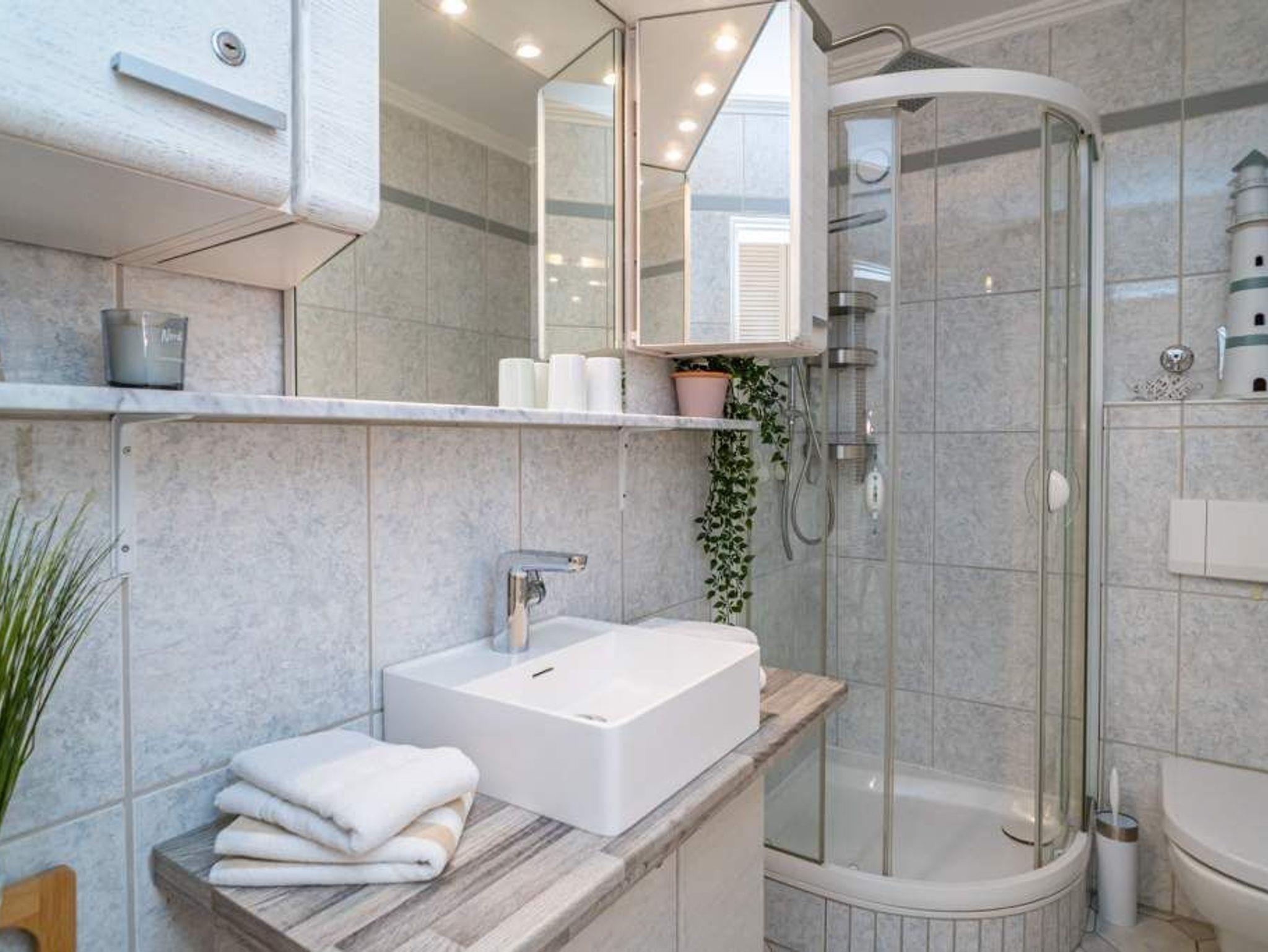 Im Bad befindet sich eine Dusche, ein WC und ein Waschtisch. Ein Fön ist vorhanden. Ein kleiner Tritt für die Kinder ist hier ebenfalls vorhanden.