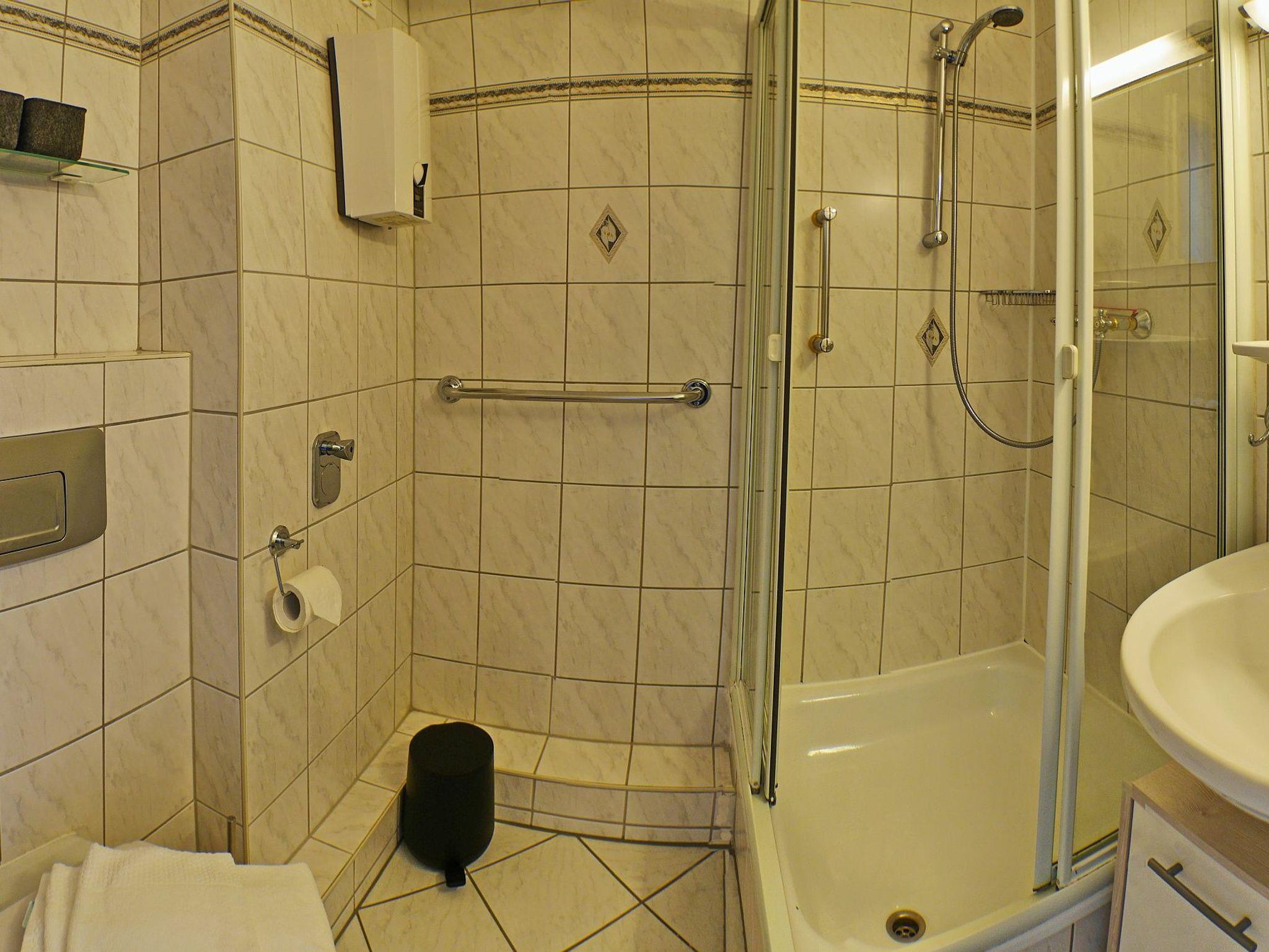 Ein Bad mit Dusche, WC, Waschbecken und Haartrockner.
