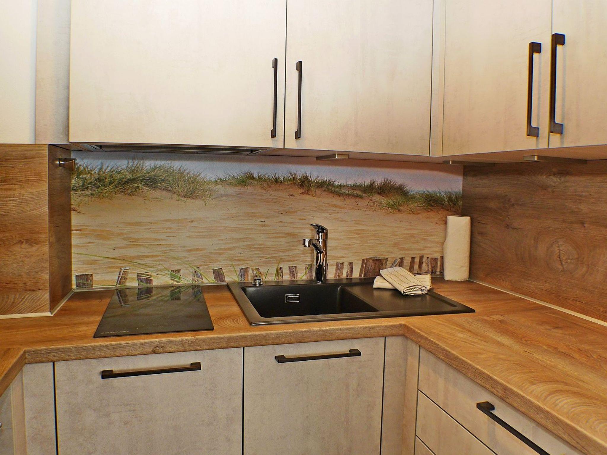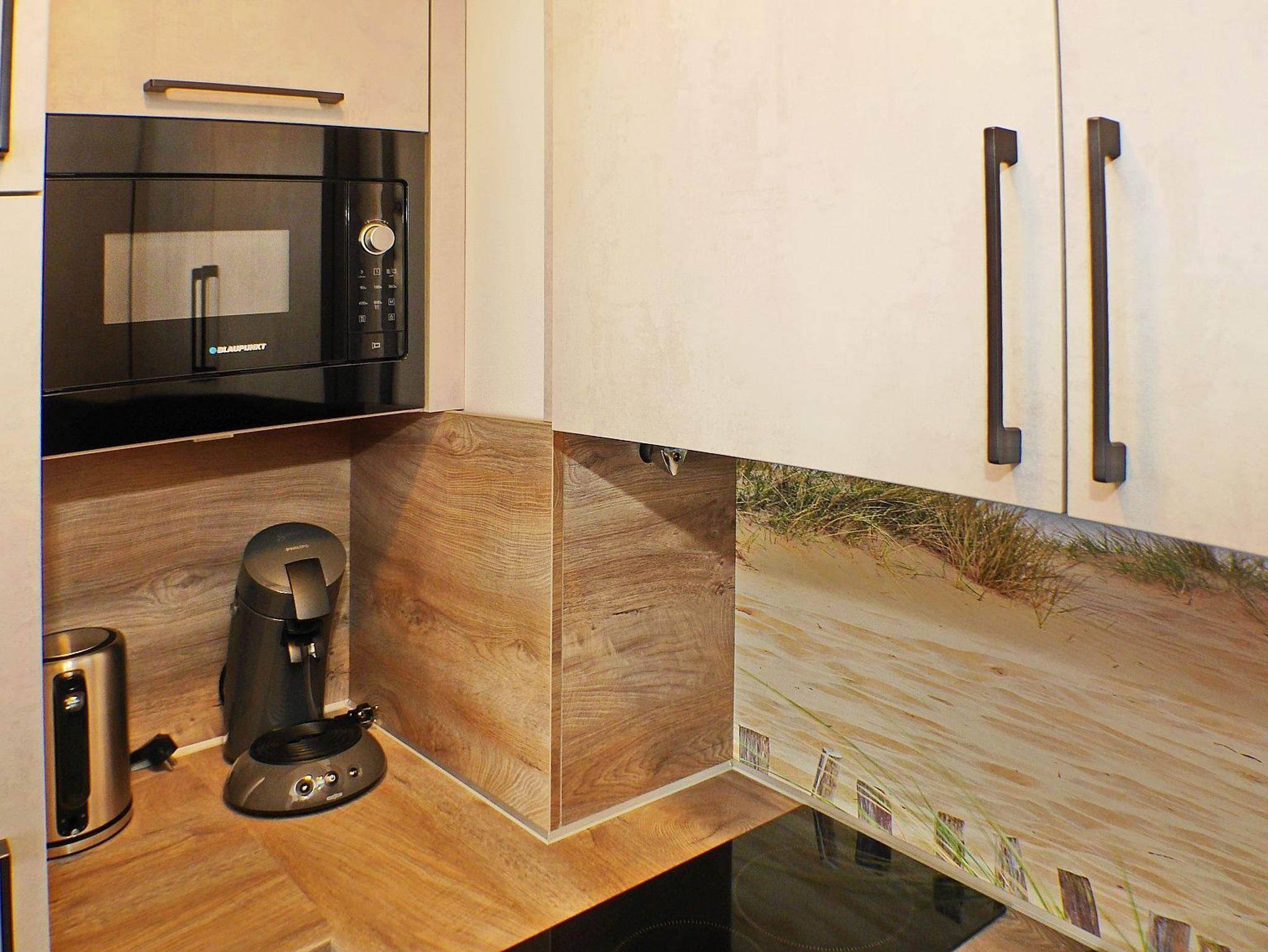 Die moderne Küchennische ist eingerichtet mit 2-Platten Cerankochfeld, Spülmaschine, Mikrowellen/ Backofenkombi, Kühlschrank mit Gefrierfach und neuen Küchenutensilien.Eine Filterkaffeemaschine sowie Senseo Kaffeepadmaschine, Wasserkocher, Toaster und Geschirr für den täglichen Bedarf sind selbstverständlich.