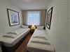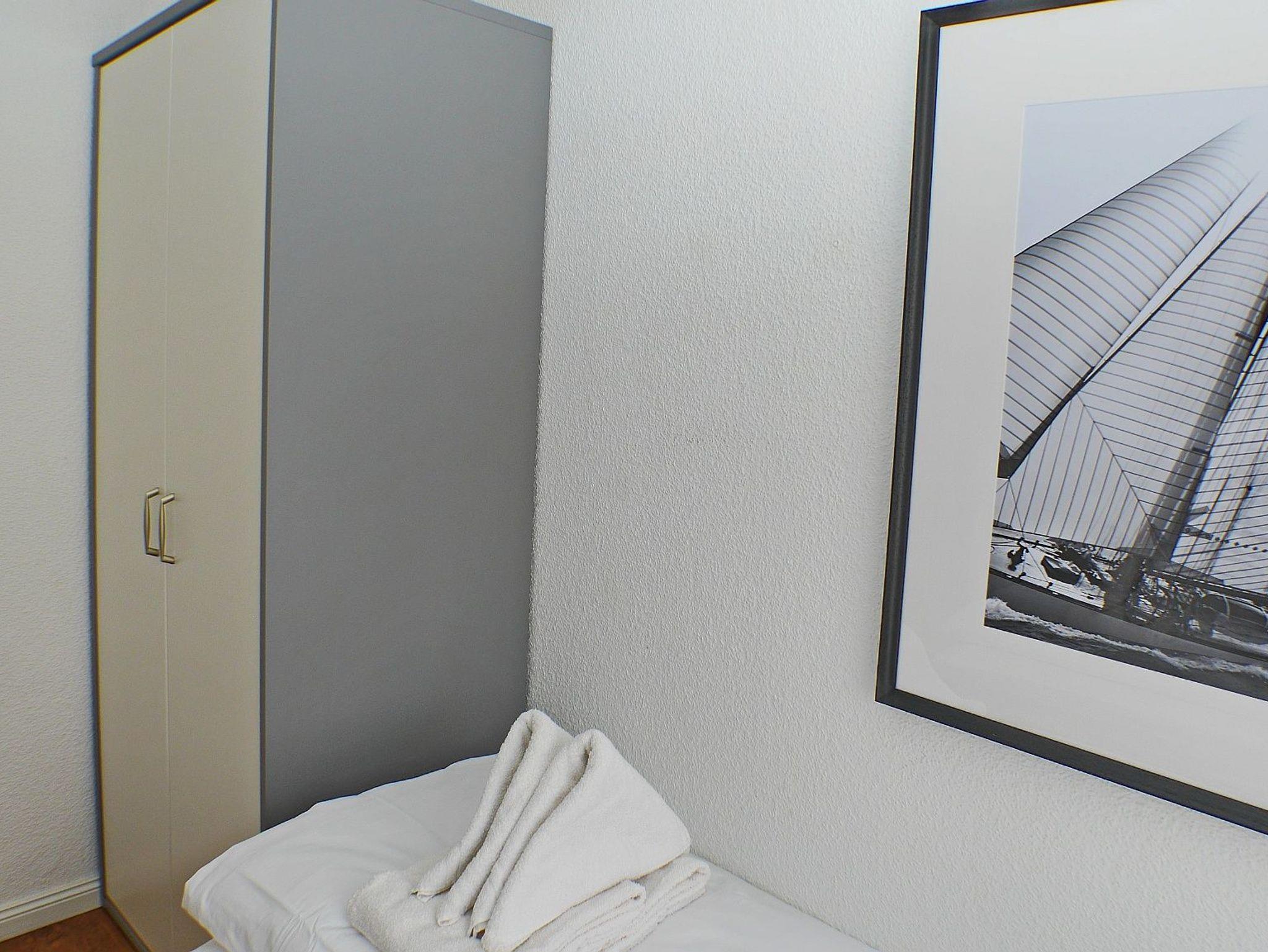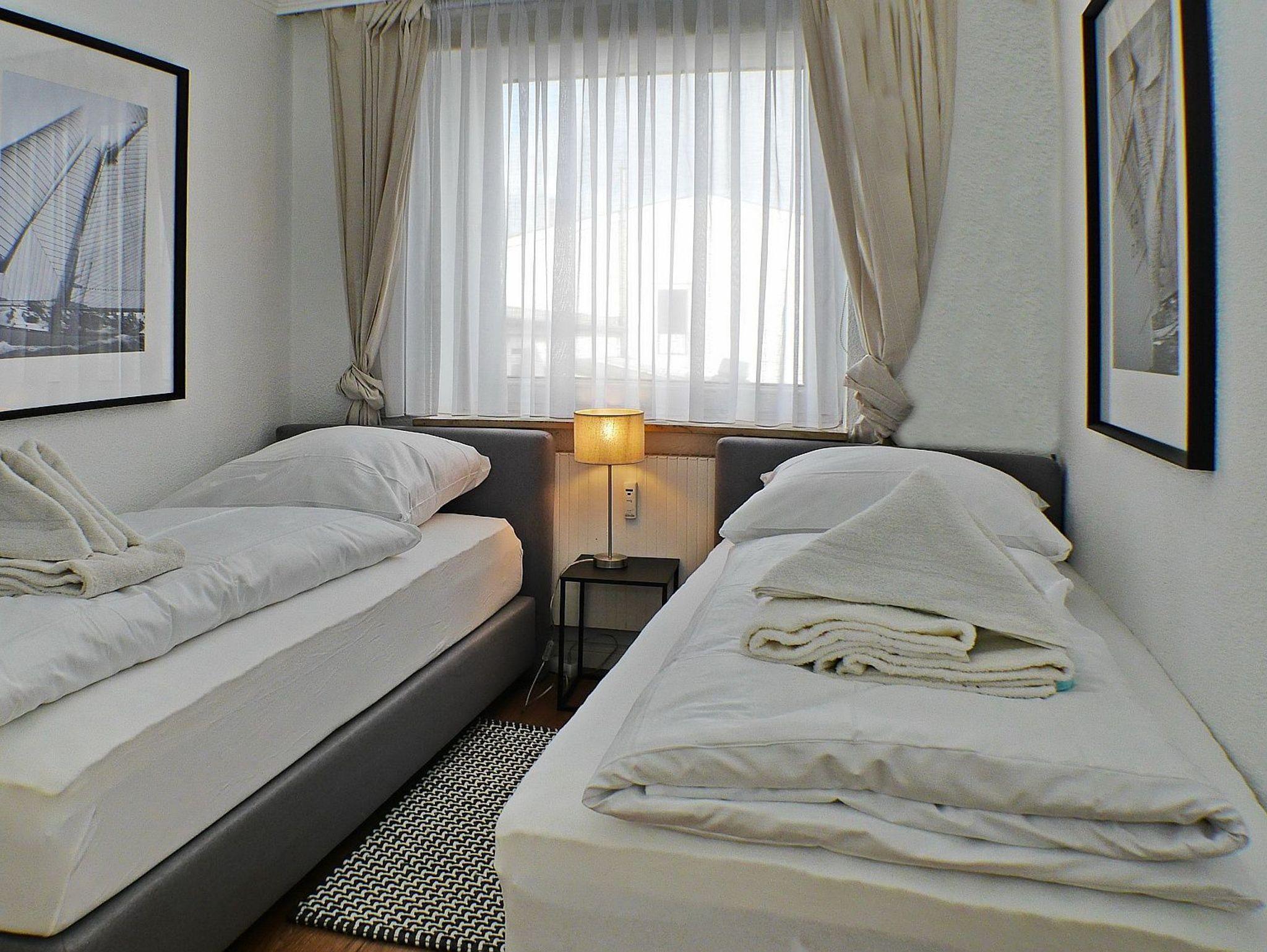 Ein Schlafzimmer mit hochwertigem Boxspringbett (90x200) und offenem Fußende laden zum erholsamen Schlaf ein. Die auseinander stehenden Betten können zusammen gestellt werden. Zusätzlich ist das gemütliche Schlafzimmer mit Nachttischen, Leselampen, Kleiderschrank ausgestattet. Die Betten sind für Sie bezogen.