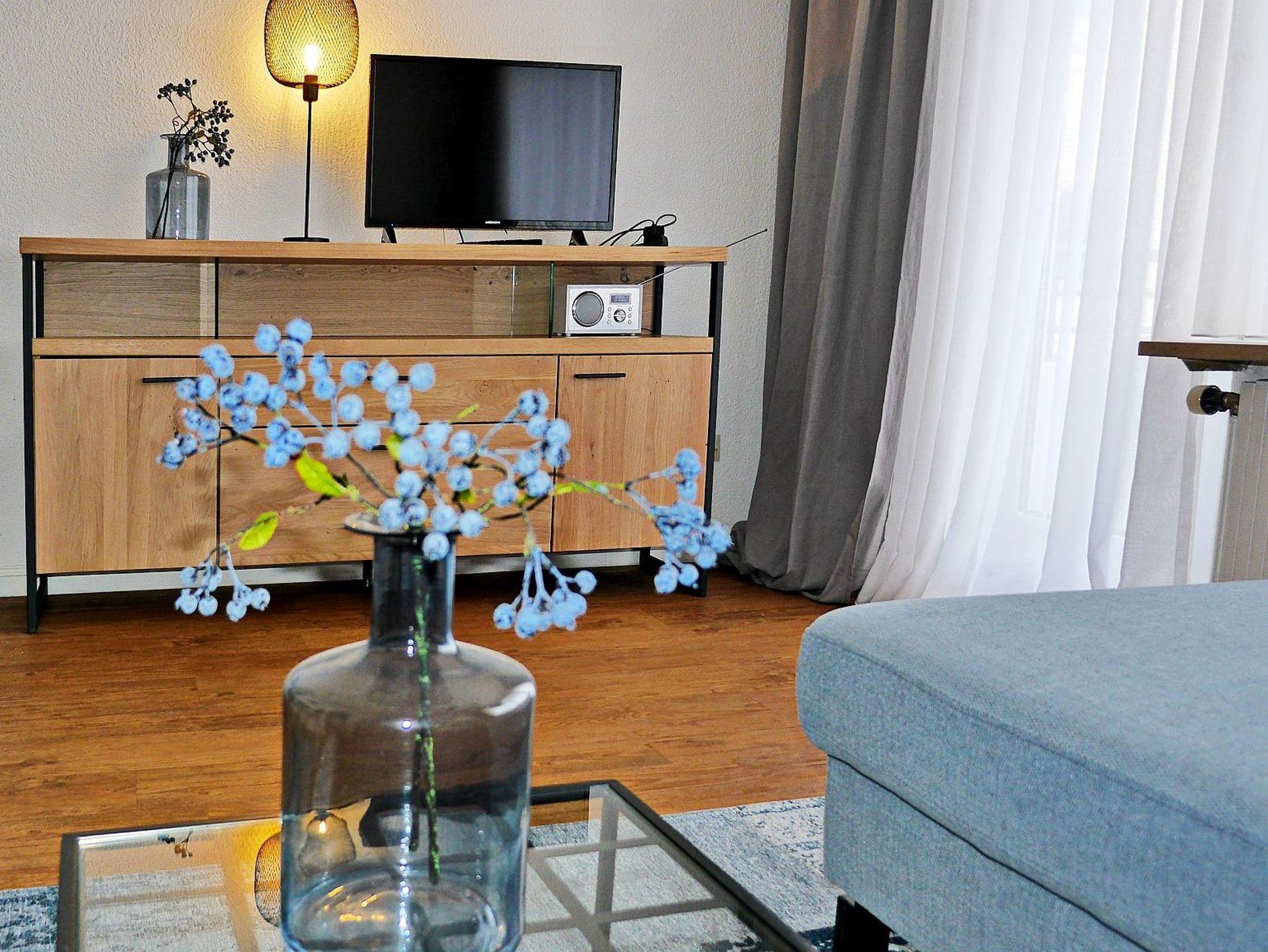 Ein gemütliches Wohnzimmer mit Couchgarnitur, Flachbild-TV und Essecke ist der Mittelpunkt der Wohnung.