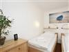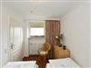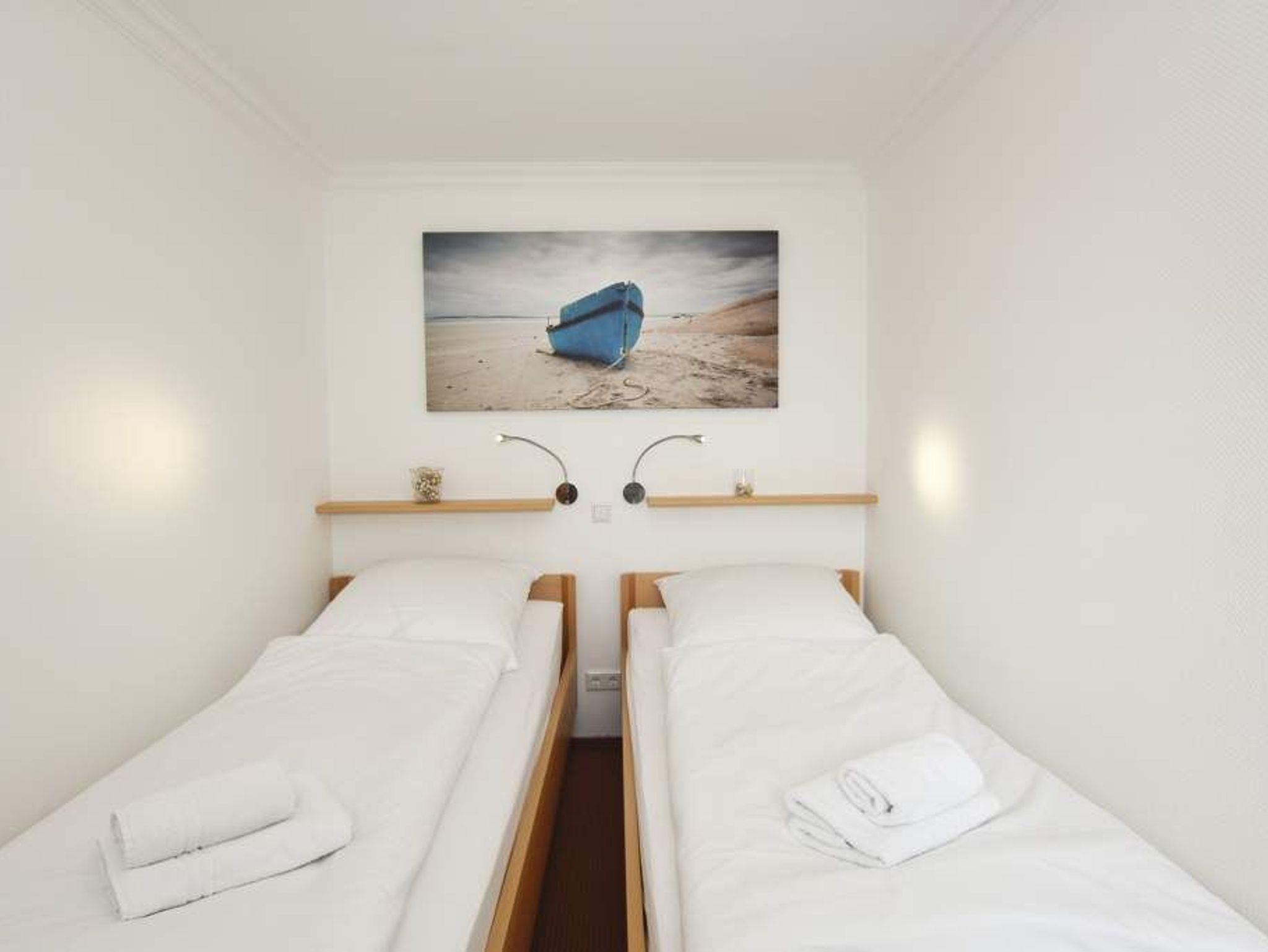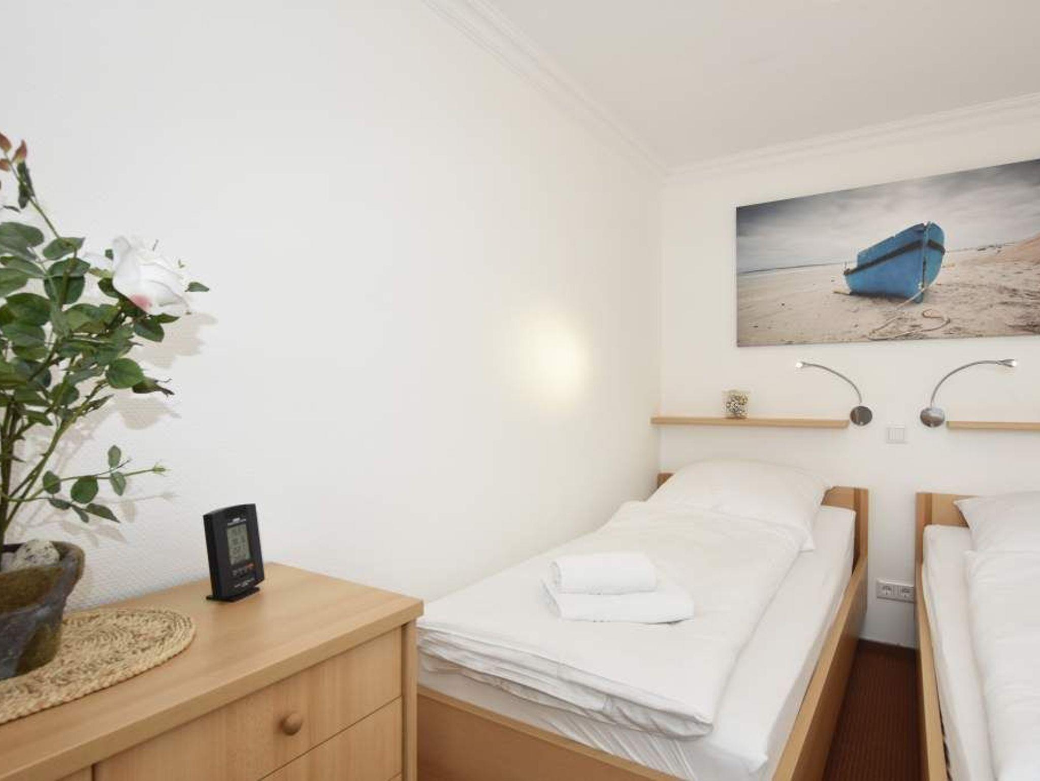 Das Schlafzimmer ist mit zwei auseinander stehenden Einzelbetten.