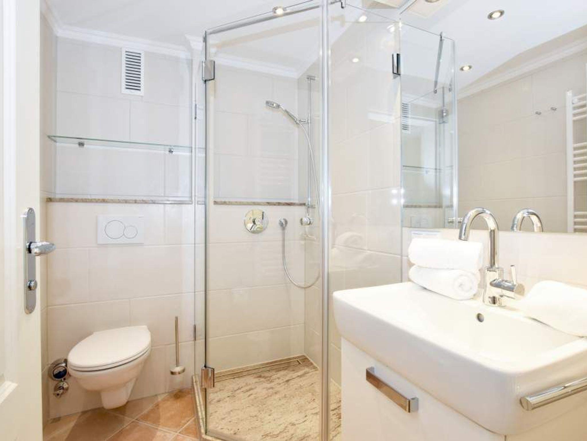 Im Bad befinden sich eine Dusche, ein WC und ein Waschtisch.