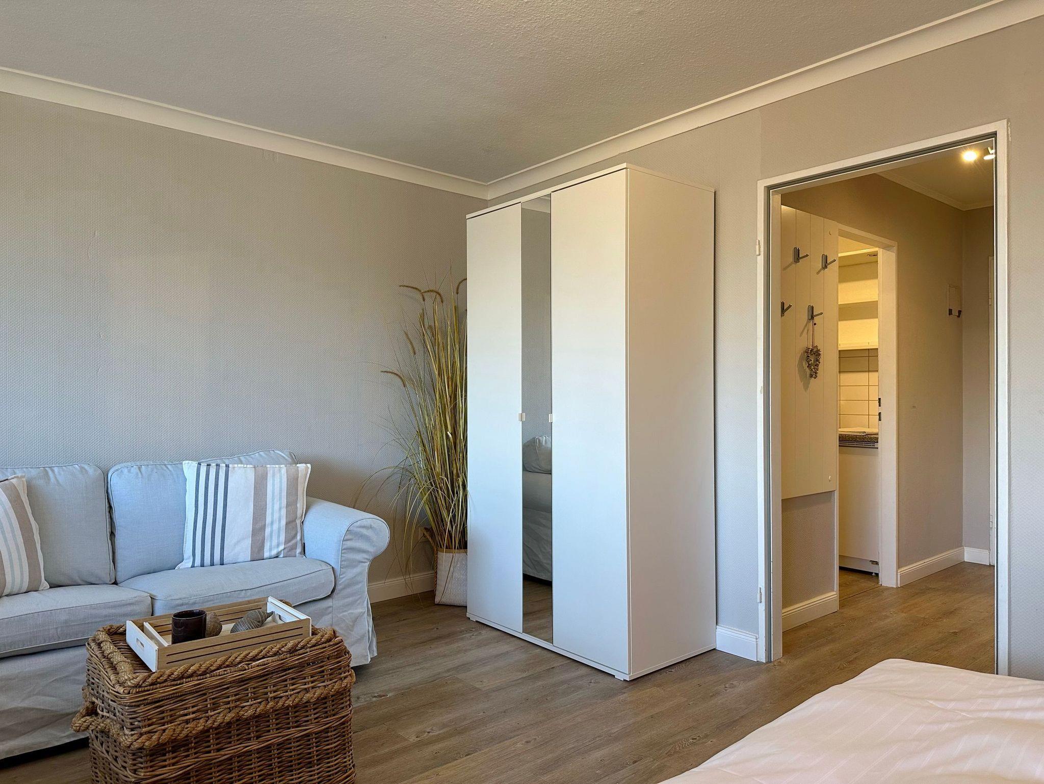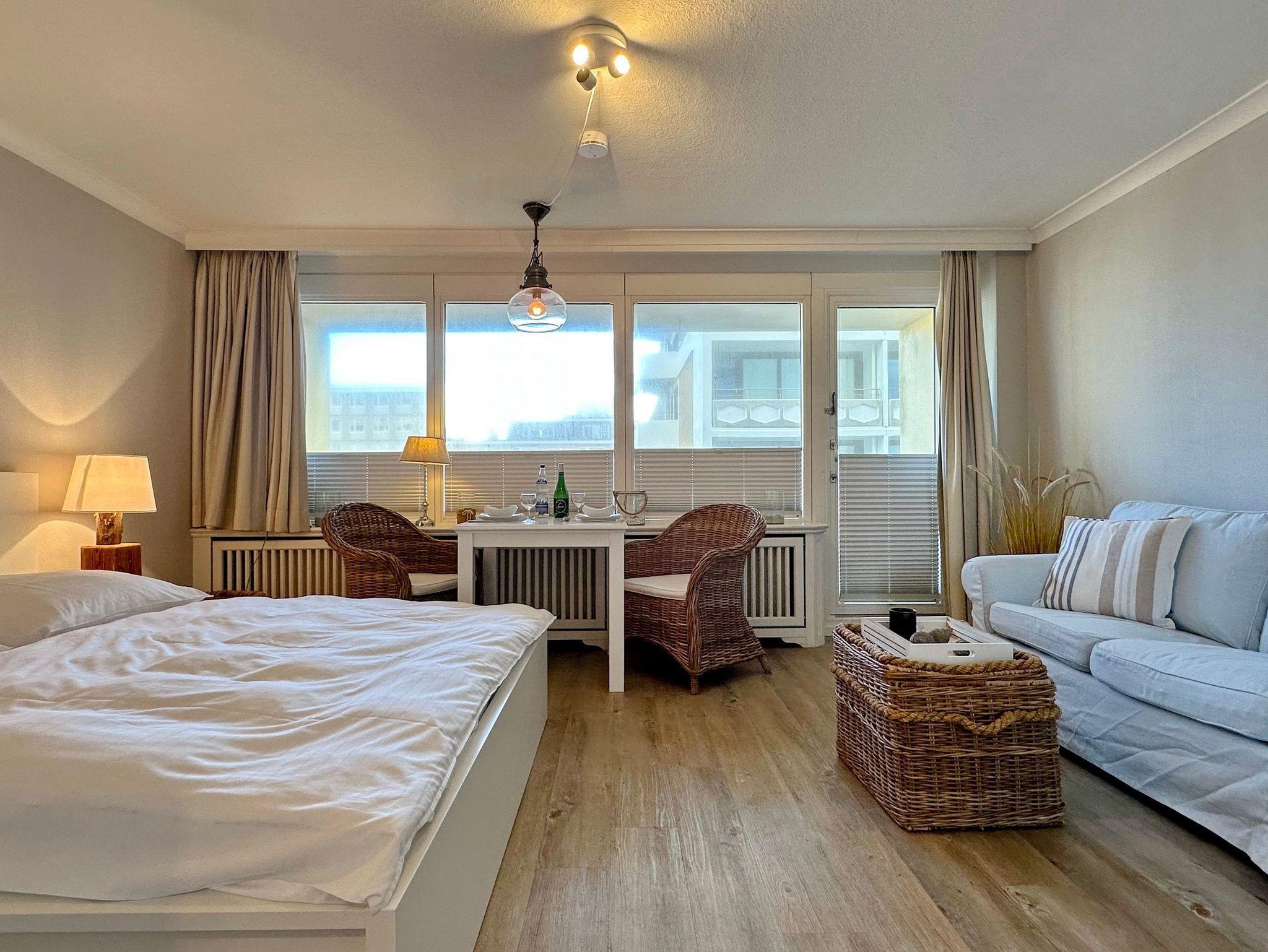 1-Zimmer-Ferienwohnung im Haus Metropol, ca. 38m², Nichtraucher ! 1. OG, Landseite. Wohn-/ Schlafraum mit Doppelbett (180x200), 2-Sitzercouch, Esstisch mit 2 Stühlen, Flat-TV und Radio, W-Lan (ohne Gewähr), Ostbalkon mit Balkonmöbeln, separate Küche mit Mikrowelle und 4-Plattenherd. Duschbad / WC. Tierhaltung ist nicht gestattet. Bettwäsche und Handtücher sind zur Anreise aufgezogen. Ein PKW-Stellplatz kann kostenpflichtig zugebucht werden.