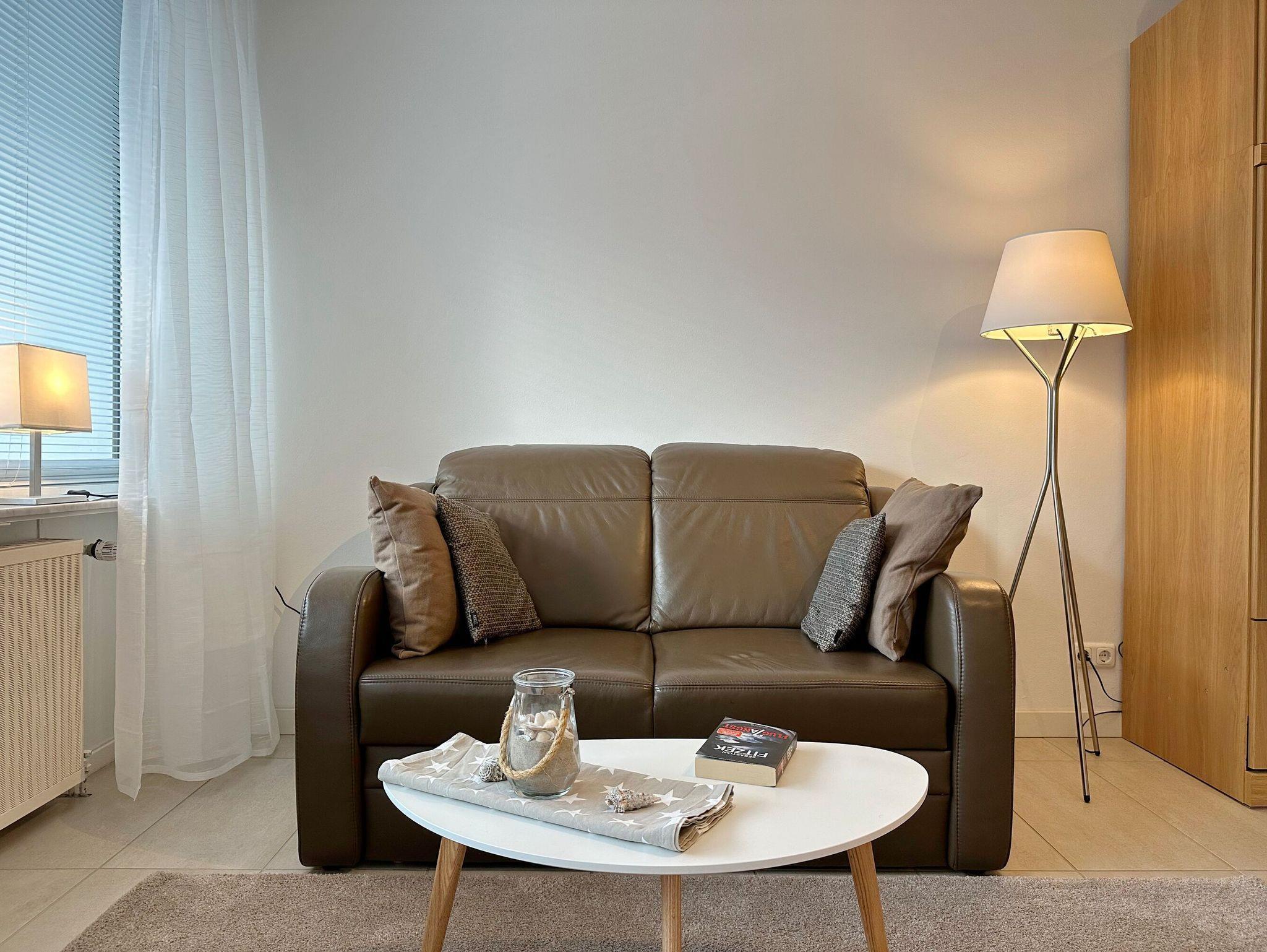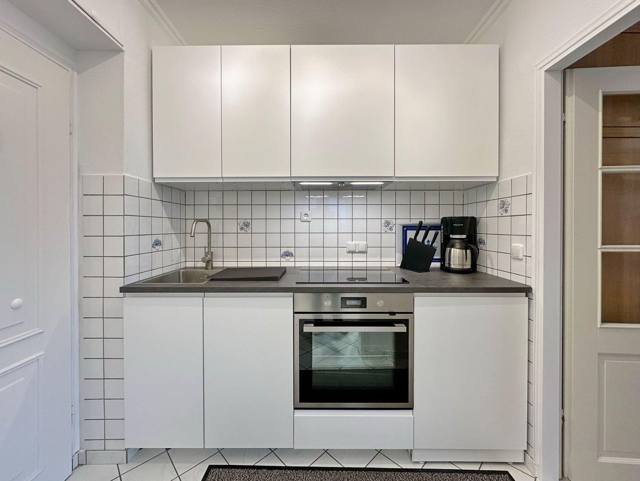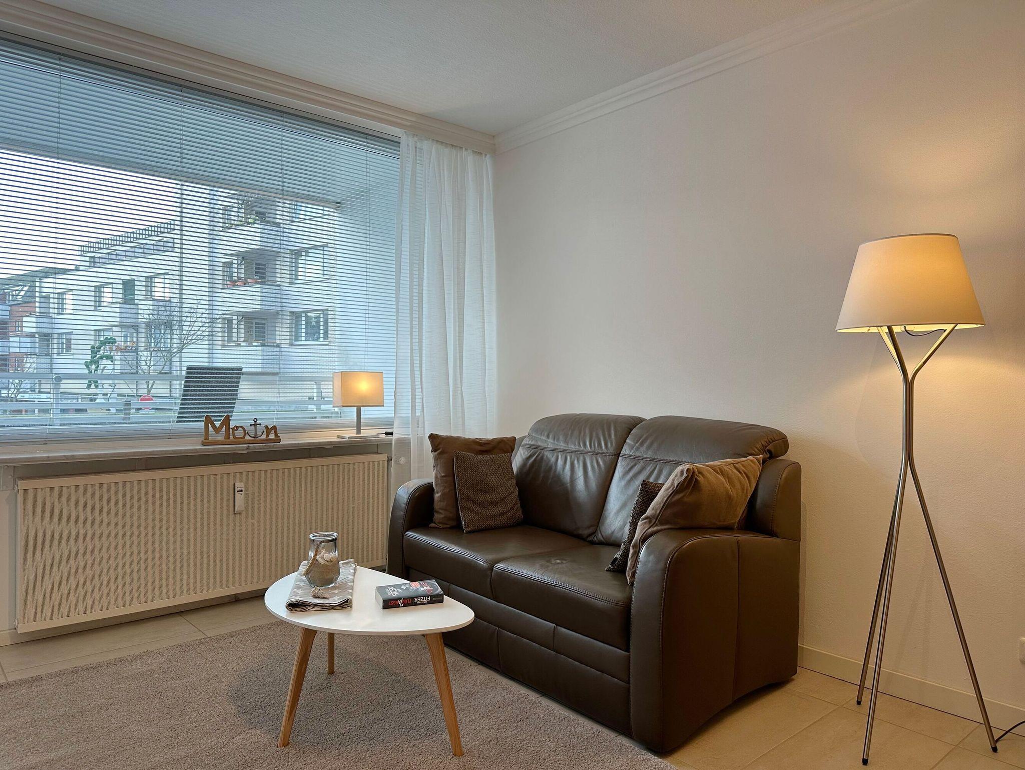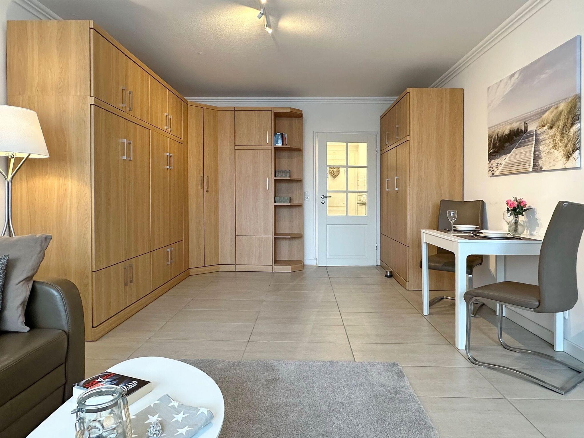 1-Zimmer-Wohnung in zentraler Lage Westerlands, nur wenige Meter bis zum Strandübergang. Kombinierter Wohn-/ Schlafraum mit Einzelschrankbetten, Essplatz und Sofa, TV und WLAN, Zugang zum möblierten Südbalkon. Im Flurbereich der Wohnung befindet sich die Garderobe und die neue Küchenzeile mit Induktionsherd, Geschirrspüler, Backofen und Kühlschrank mit Gefrierfach. Geräumiges Duschbad / WC mit Fenster. Tiefgaragenstellplatz inklusive. Fahrstuhl im Haus vorhanden und ebenerdig zu erreichen. Zur Wohnung gehört der Garagenstellplatz Nr. 139.