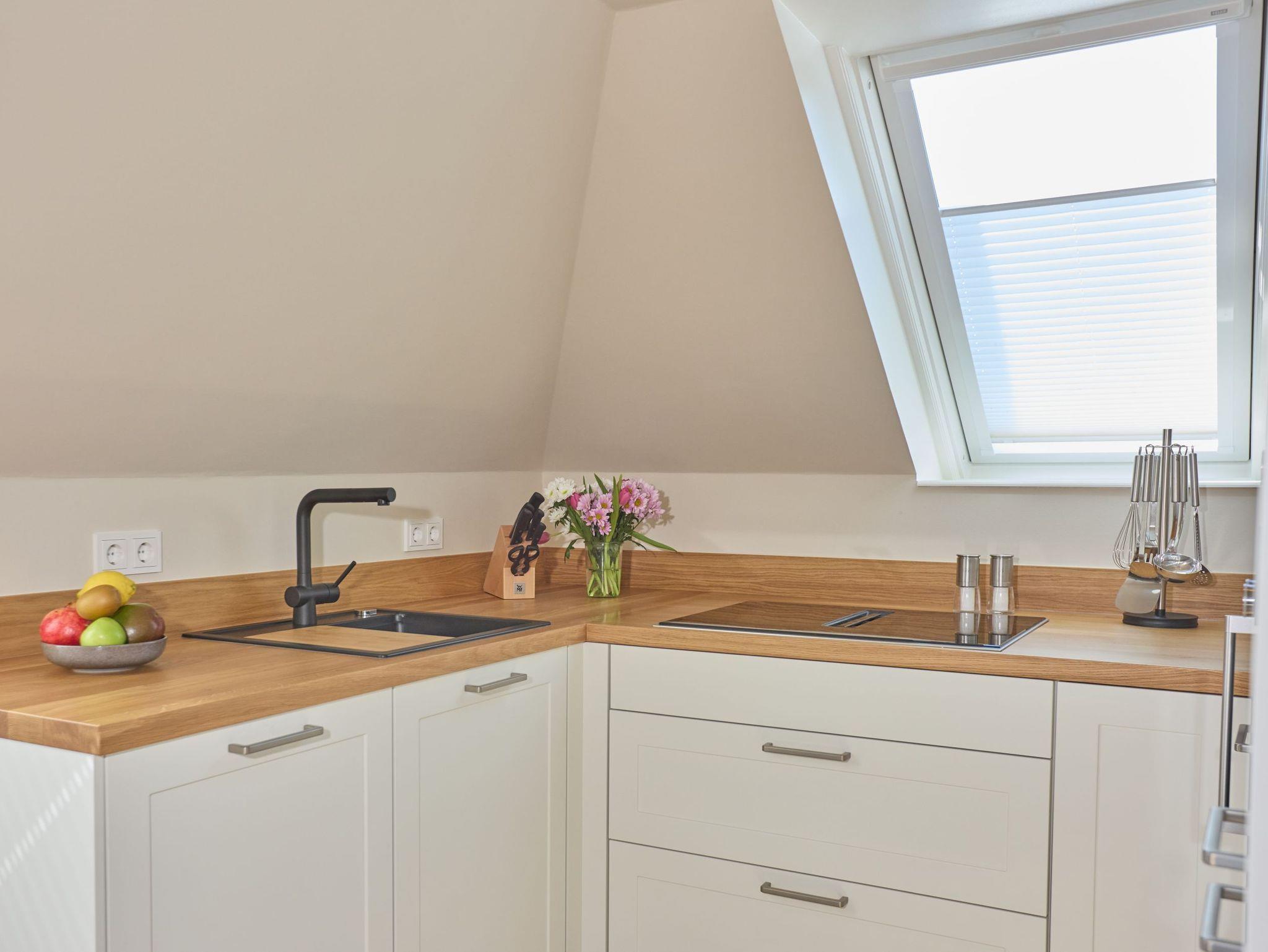Sobald Sie eintreten stehen in einem großzügigen, durch die vielen Fenster sehr hellen, Wohn- und Essbereich. Die Holzbalken und Stahlträger geben ein modernes und gemütliches Ambiente. Die stylische Küche lässt mit modernen Elektrogeräten und hochwertiger Ausstattung keine Wünsche offen.