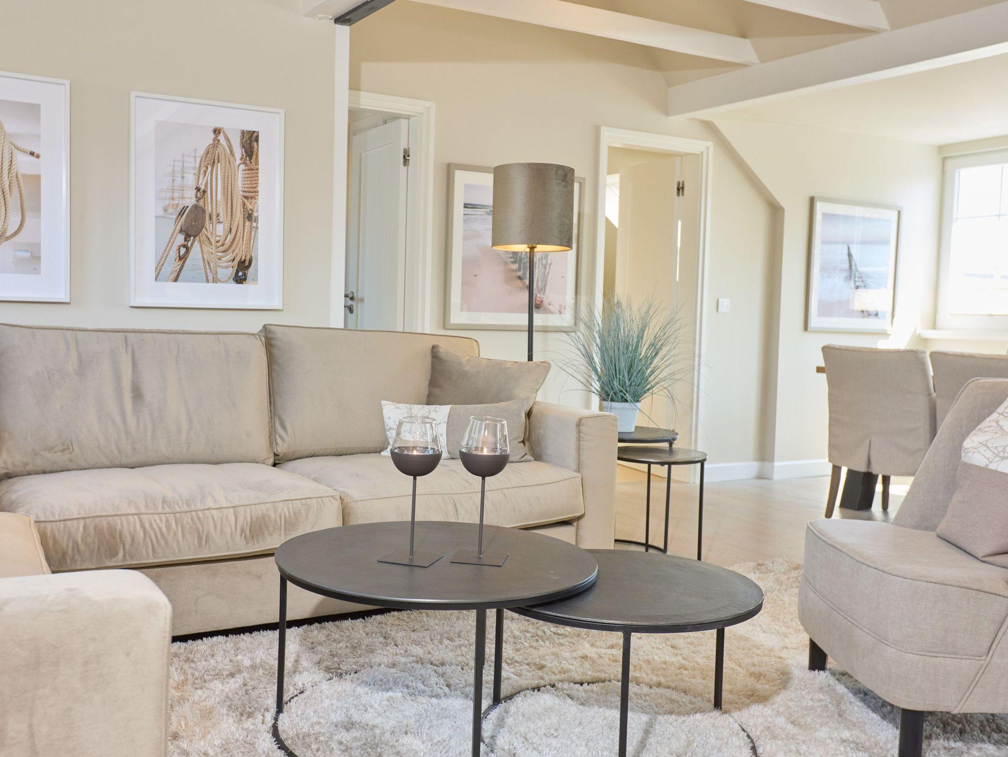 Ein gemütliches Sofa sowie ein großer Esstisch laden zum Verweilen und Genießen ein.