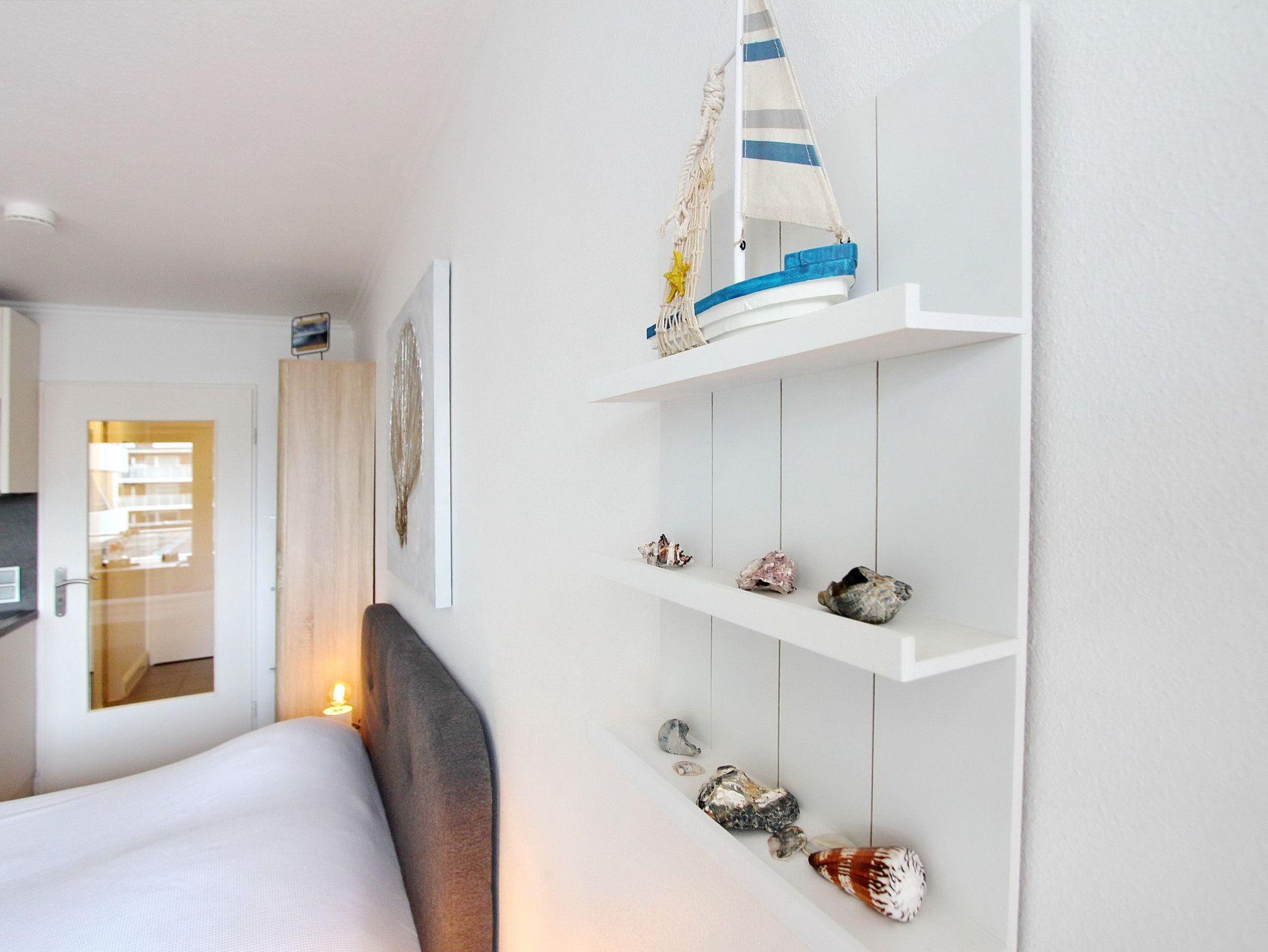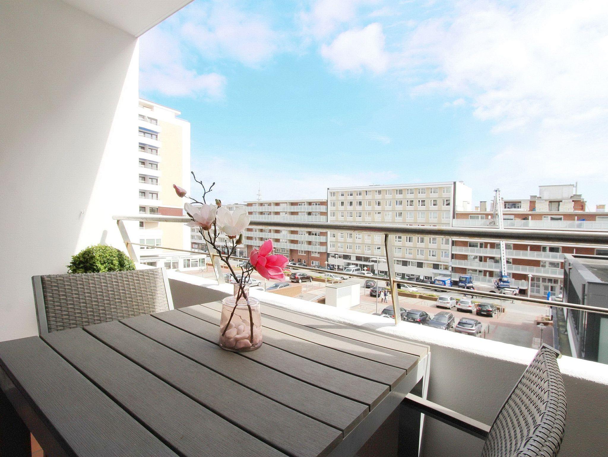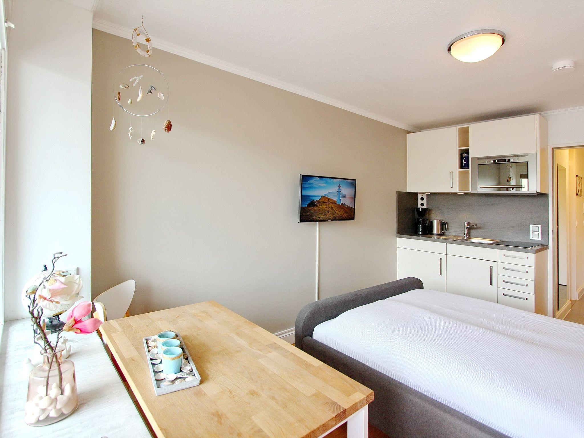 Einzimmerappartement in der 1. Etage im Haus Metropol mit Balkon (ausgestattet mit 2 Stühlen und Tisch) zur Landseite.