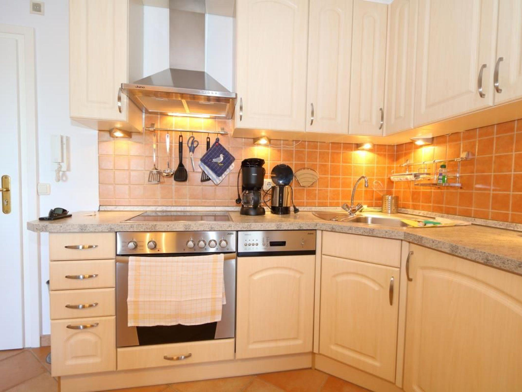Küche: Herd mit zwei großen und zwei kleinen Platten, Backofen, Spülmaschine, Kühlschrank mit Gefrierfach, Dunstabzugshaube, Wasserkocher, Filterkaffeemaschine, Toaster