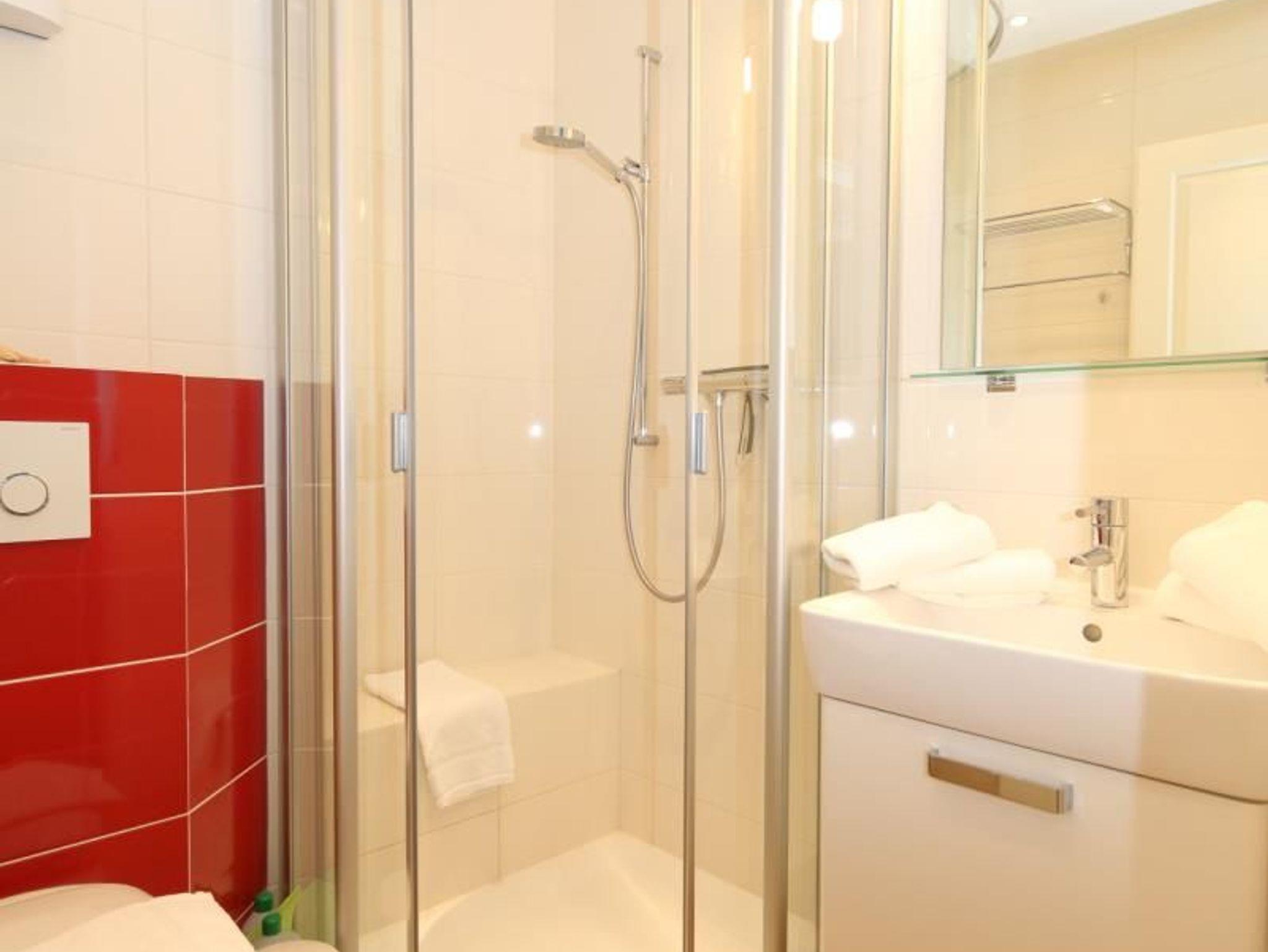Badezimmer mit Dusche, WC, Waschtisch. Ausreichend Handtücher und Vorleger.