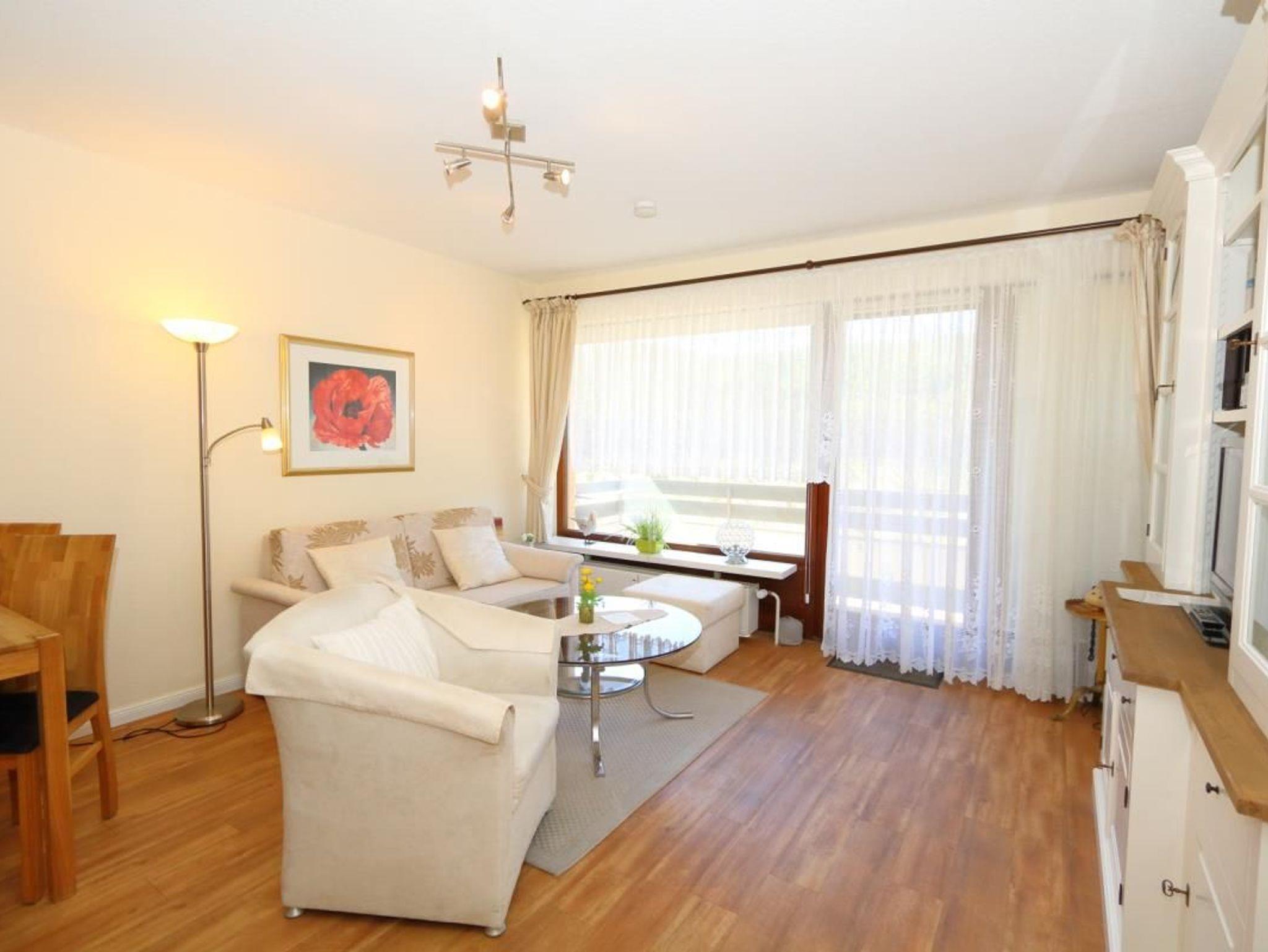 Ein helles Wohnzimmer mit großer Fensterfront zum möblierten Balkon und Dünen mit Sitzecke und Strandkorb. Großer Smart-Tv mit Sat-Anschluß, Eßecke und Couchgarnitur, W'Lan