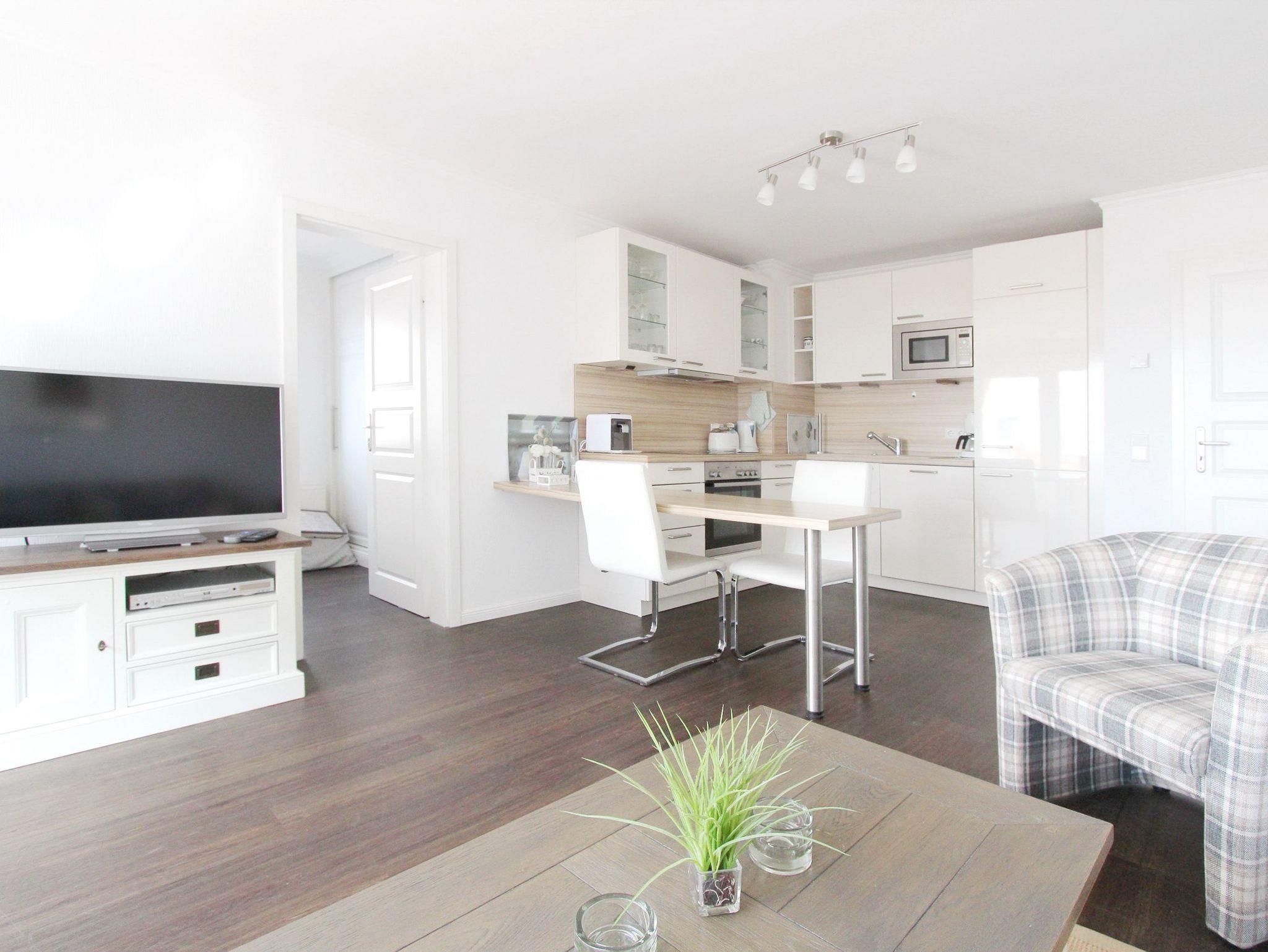 Gemütliche 2 Zimmerwohnung in der 3. Etage im Haus Westerhörn im Beach House Stil wenige Schritte vom Strand entfernt. Hell und freundlich eingerichteter Wohnraum mit vorgelagertem Westbalkon, kleines Meerblickchen inklusive. In der Wohnung steht ihnen eine große Couch und ein Fernsehsessel zur Verfügung, sowie ein Schreibtisch zum erledigen ihrer Urlaubspost und ein Essplatz mit 2 Stühlen. In der offenen Küchenbar mit Backofen, Ceranfeld, Mikrowelle, zusätzlicher Kaffeekapselmaschine und Spülmaschine können sie sich selbst verpflegen. Das separate Schlafzimmer verfügt über ein Doppelbett und einen großen Kleiderschrank mit viel Stauraum. Designfussboden in Holzoptik wurde in der ganzen Wohnung verlegt. Im hellen Badezimmer gibt es eine Dusche und einen Handtuchtrockner. Zur technischen Ausstattung der Wohnung gehört: ein Flachbildfernseher, ein DVD Player, eine IPod Station und ein Radio. Freies WLAN ist kostenfrei vorhanden (die Zugangsdaten stehen auf der Telekom Speedbox). Wohnungsgröße: ca. 45 m².