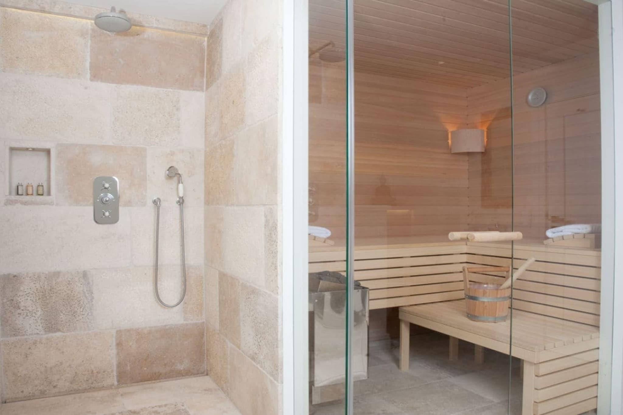 Stueetage: (Stue(Fjernsyn, pejs, stereoanlæg), Køkken(, elkedel, brødrister, kaffemaskine, opvaskemaskine , køleskab, fryser), soveværelse(, , dobbeltseng, Fjernsyn), badeværelse(, toilet, bruser, håndvask, varme), guest toilet(, toilet, håndvask)) Mellemetage: (loungerum(, , sauna, badekar, badekar, bruser, håndvask)) , , Internetadgang, tørretumbler, vaskemaskine, varme, terrasse(, Strand, havemøbler), parkering, strygebræt, strygejern, telefon