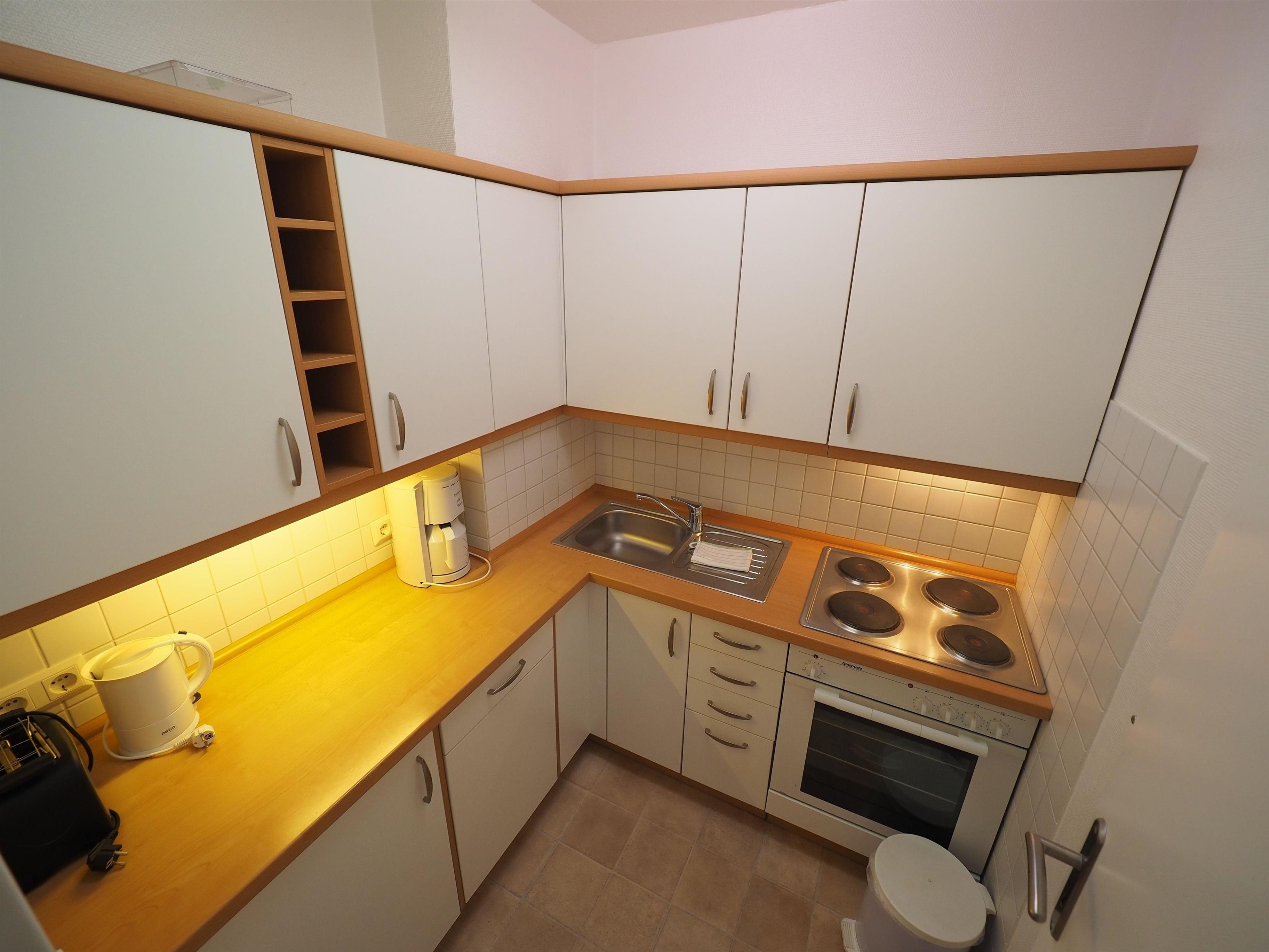 Die offene Küche ist komplett ausgestattet und lässt keine Wünsche offen: Neben einem E-Herd mit 4-Plattenkochfeld finden Sie hier einen Geschirrspüler und einen Kühlschrank – ideal für die Zubereitung leckerer Mahlzeiten.