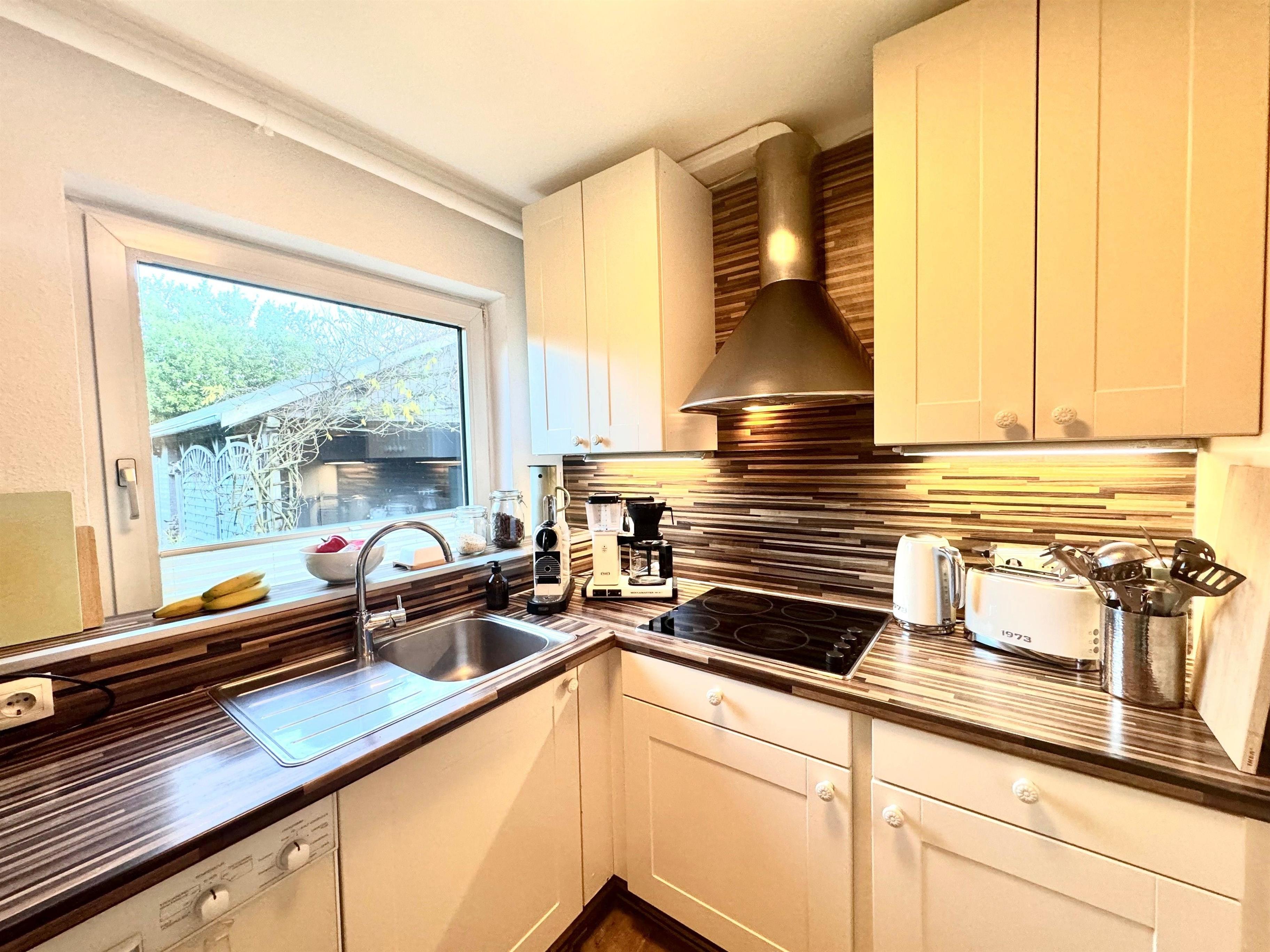 Die Küche ist voll ausgestattet mit Cerankochfeld, Backofen, Spülmaschine, Mikrowelle, Kühl-Gefrierkombination, Kaffee und Nespresso Maschine sowie einem umfangreichen Angebot an Koch- und Backutensilien.