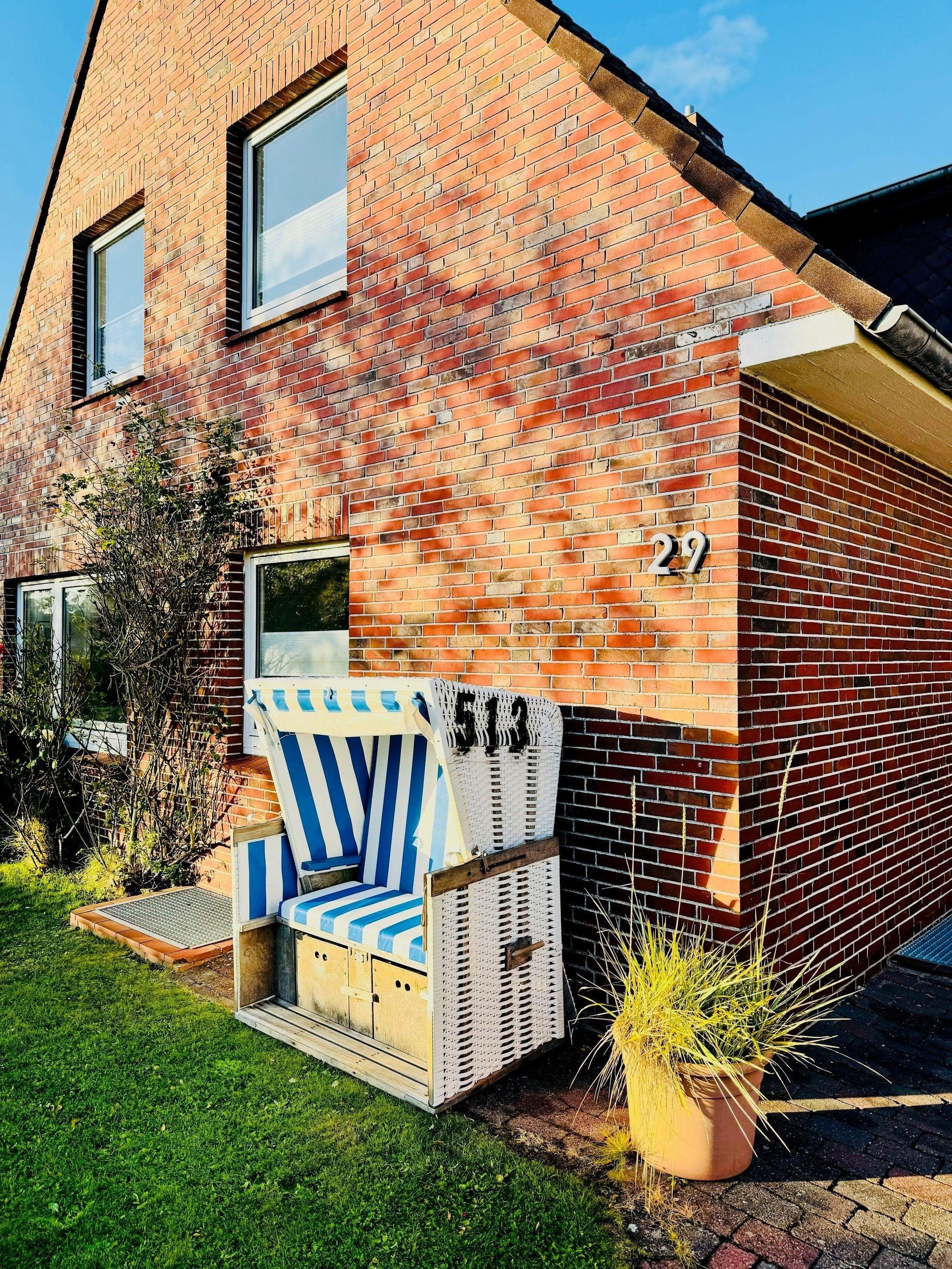 Die Gartenmöbel auf der Terrasse sowie der typisch blau weiße Sylt Strandkorb stehen von Mai bis Ende September zur Verfügung.