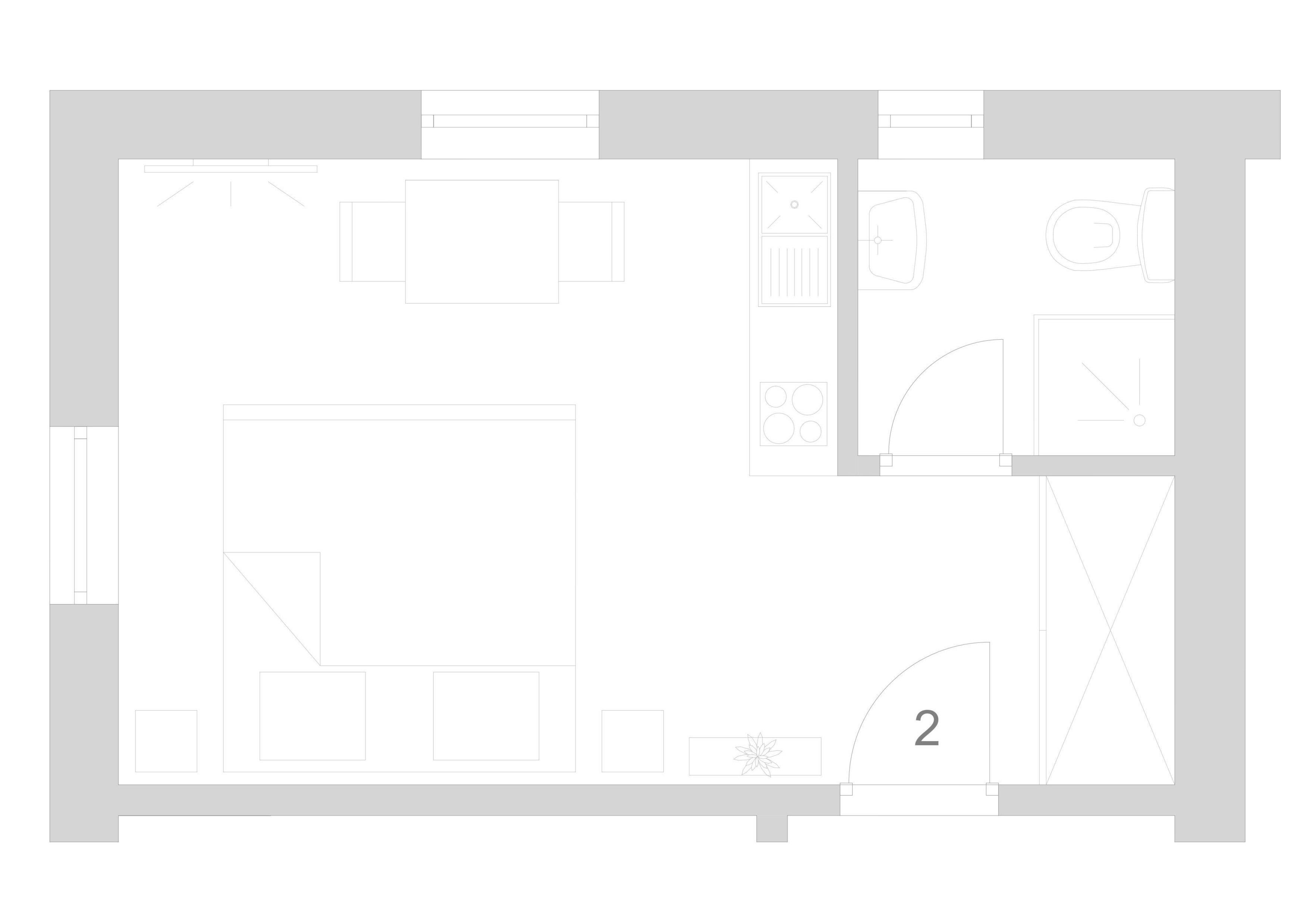Ihr lichtdurchflutetes Doppelzimmer (Bett 180x200cm) verfügt über eine kleine, gut ausgestattete Küchenzeile für den täglichen Bedarf.