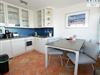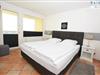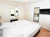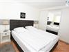Im Schlafzimmer befindet sich ein bequemes Boxspringbett, ein großer Kleiderschrank und ein Flachbildfernseher an der Wand. Eine offene, voll ausgestattete Küche mit Cerankochfeld, Backofen, Mikrowelle und