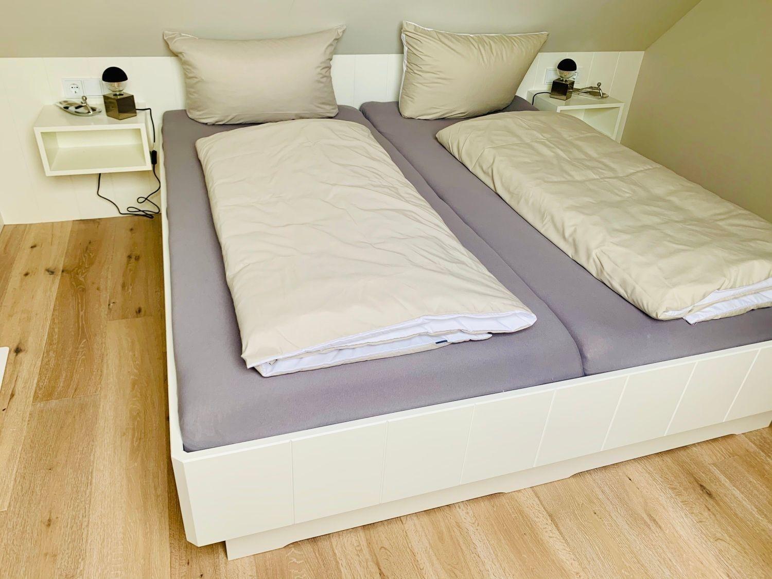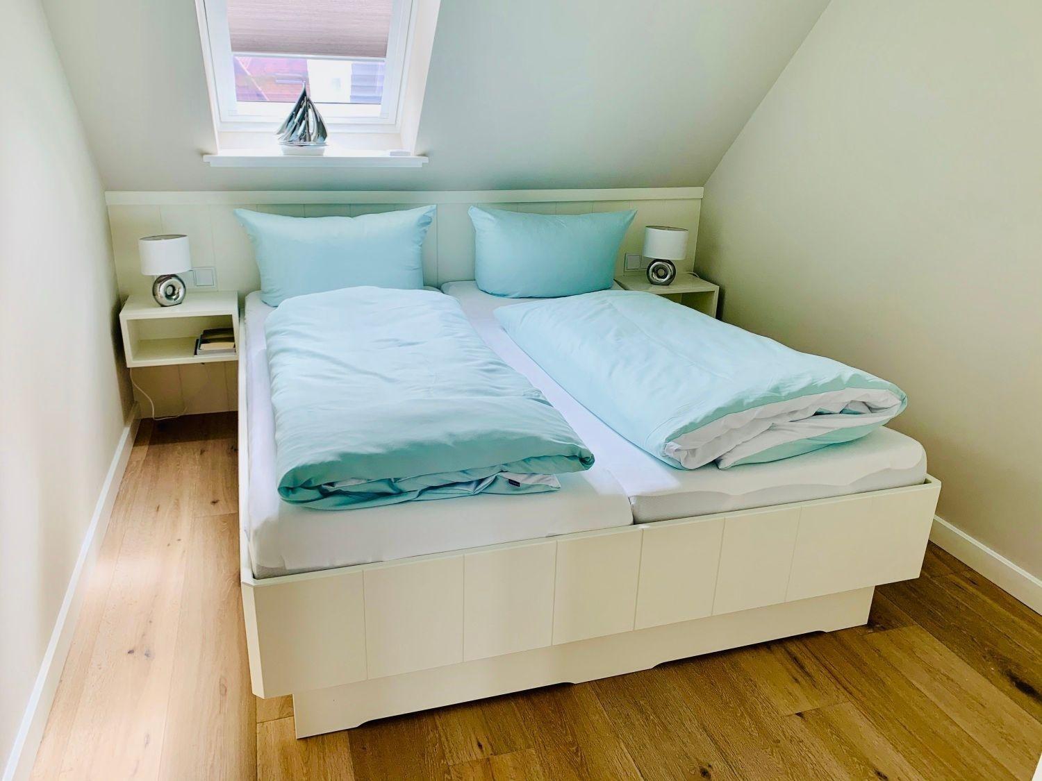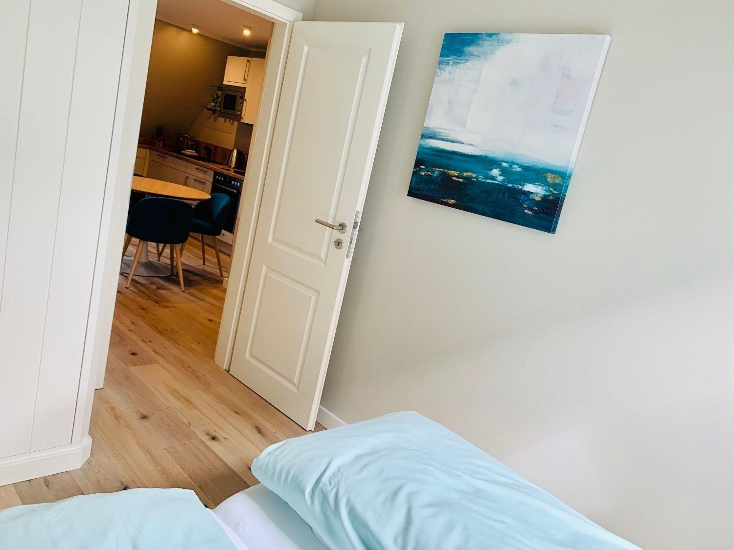 Vom Flur aus gehen Schlafzimmer mit Doppelbett, das Bad und das Wohnzimmer mit Westbalkon ab. Das weitere Schlafzimmer mit Doppelbett erreichen Sie durch die interne Treppe nach oben. Der Küchenbereich ist als moderne Küchenzeile in das Wohnzimmer integriert.