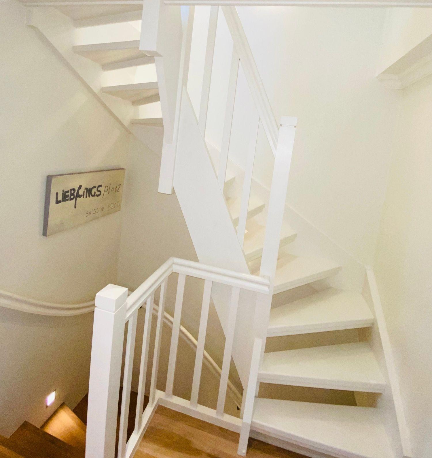 Abgehend vom Wohnraum erreichen Sie das moderne Duschbad sowie das Kinderschlafzimmer mit Etagenbett. Über die innenliegende Treppe gelangen Sie in das Hauptschlafzimmer. Direkt unter dem Dach gelegen sorgt der Schlafraum für besondere Gemütlichkeit und herrlich ruhige Nächte.